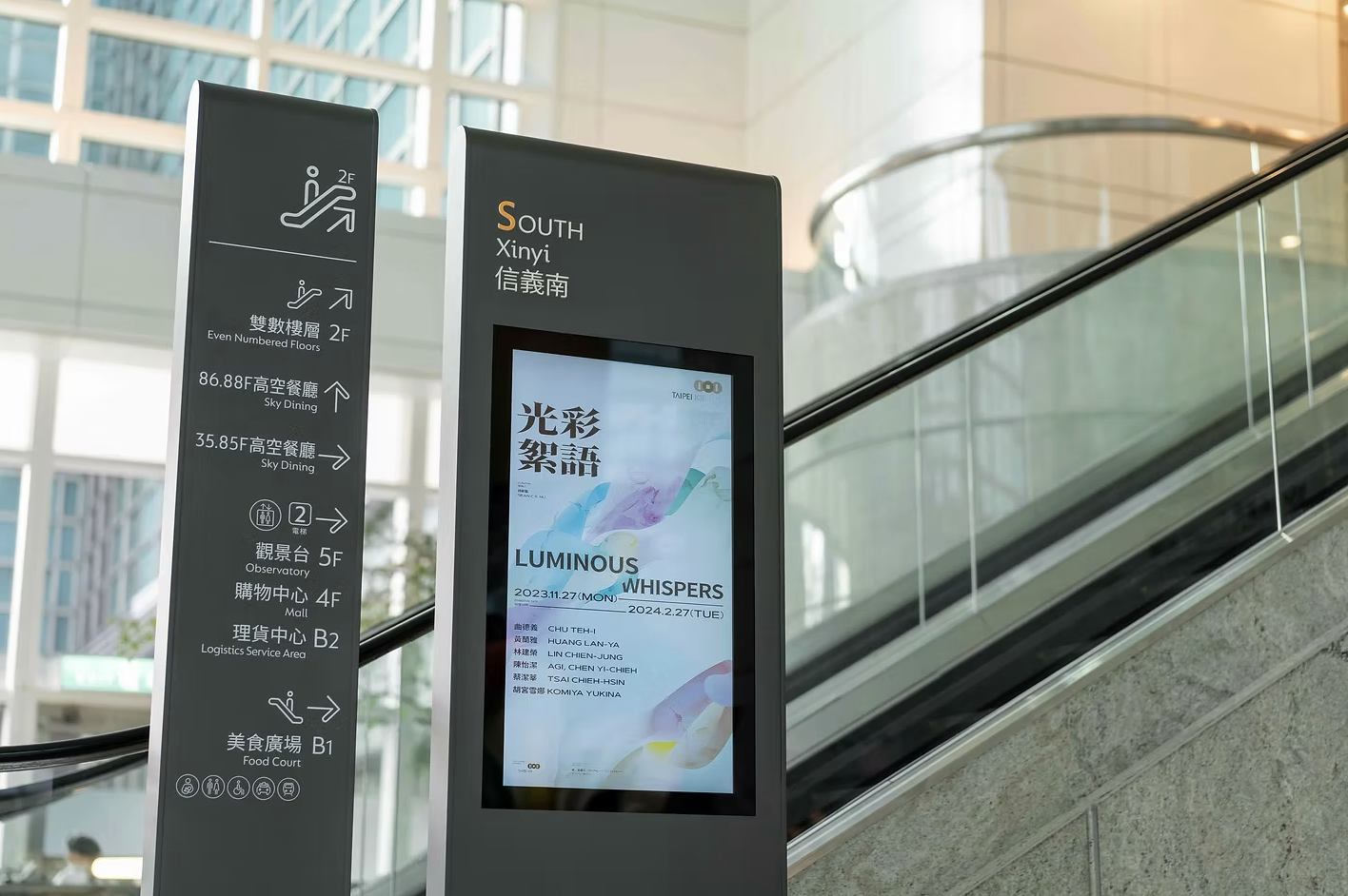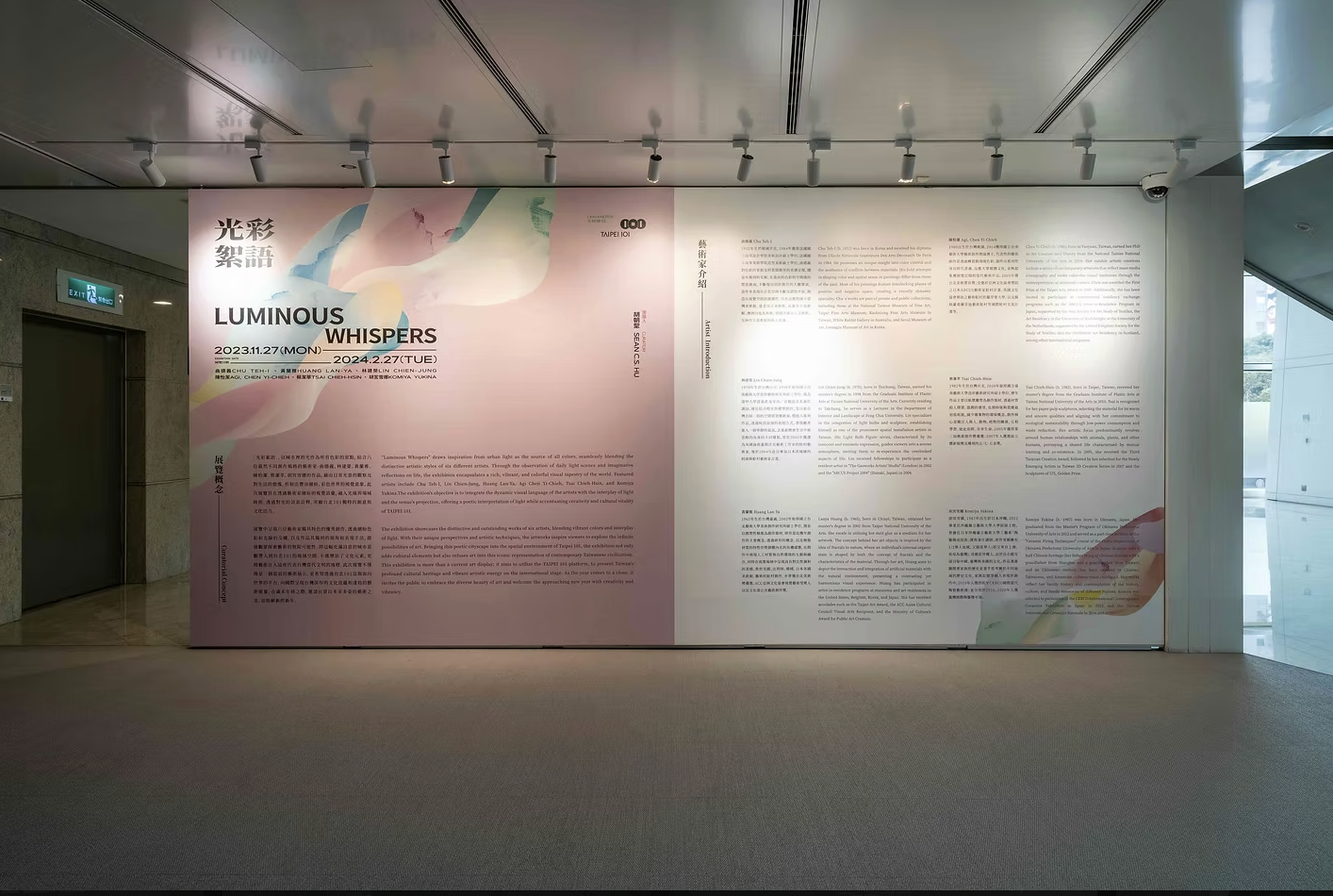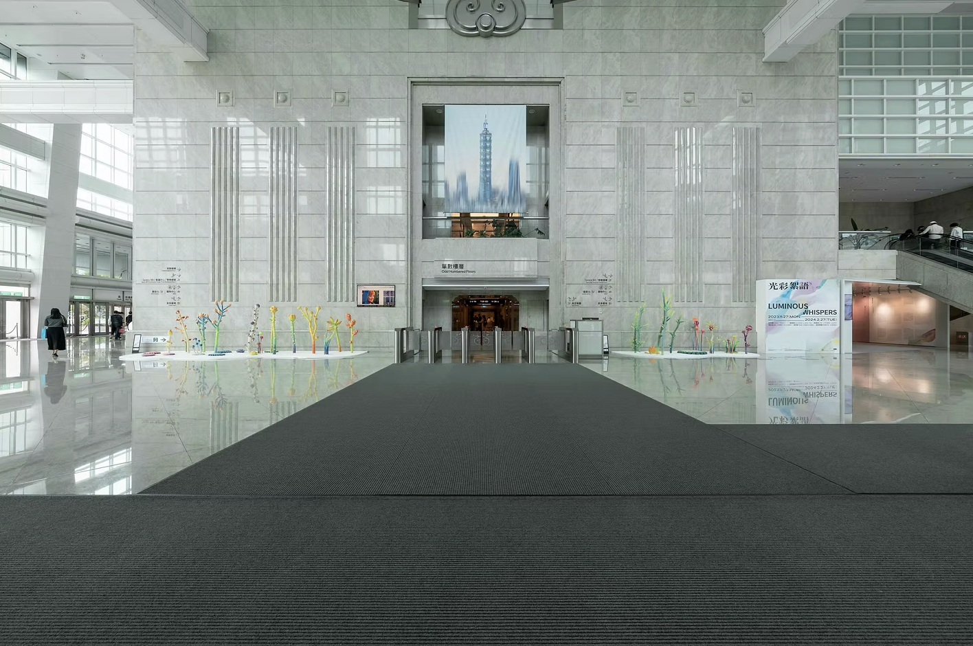 「光彩絮語Luminous Whispers」展覽,由台北101張學舜董事長所主導,並與策展人胡朝聖合作策劃,以城市裡的光作為所有色彩的原點,結合六位截然不同創作風格的藝術家,展出平面繪畫、雕塑、裝置等共20件作品。透過藝術家們對日常光景的觀察及生活想像,折射出豐沛多樣、五彩繽紛的視覺意象。台北101辦公大樓大廳高闊大器的空間,也在光彩生動的作品映襯之下,瞬間化身為當代美術館。