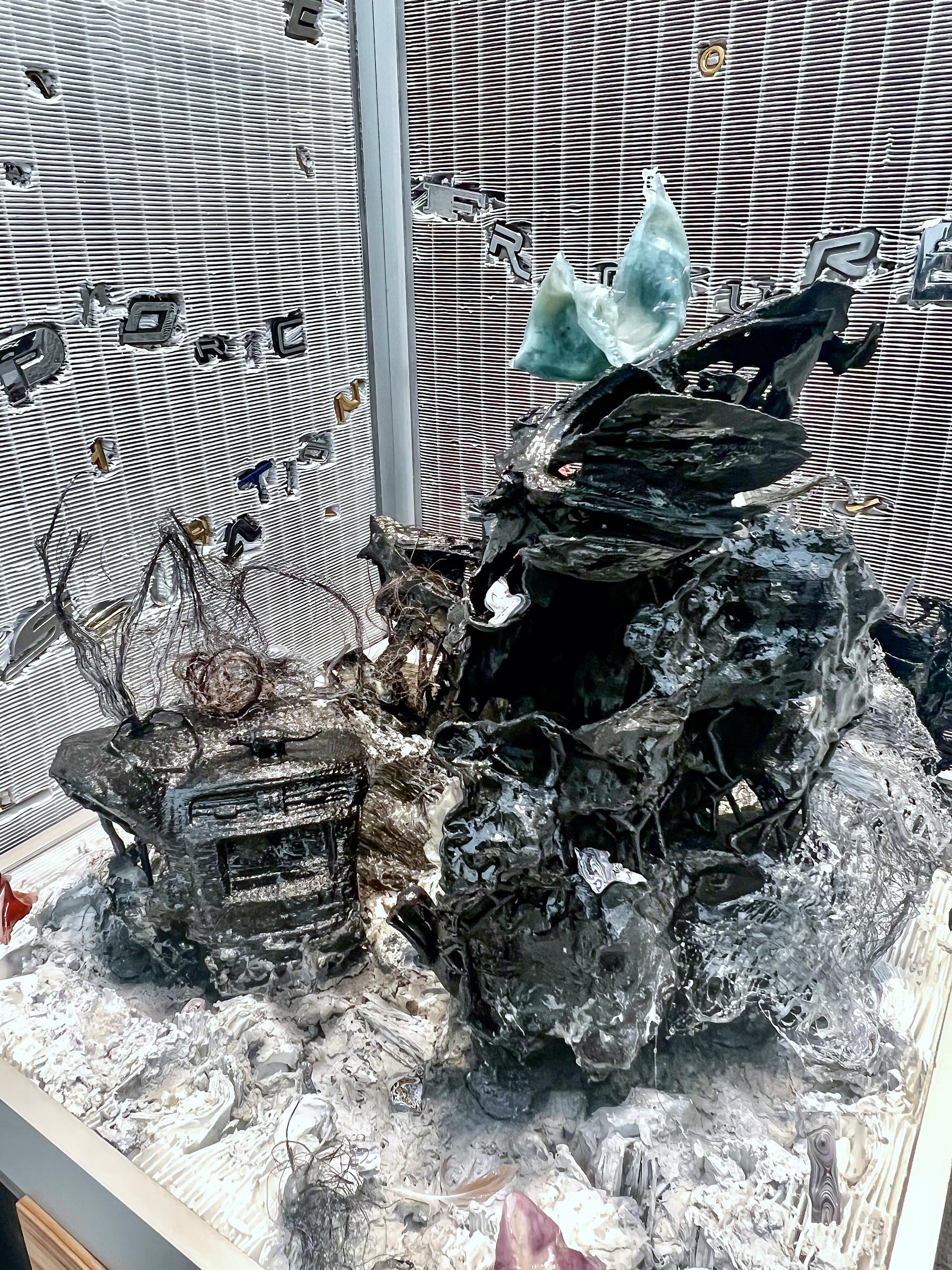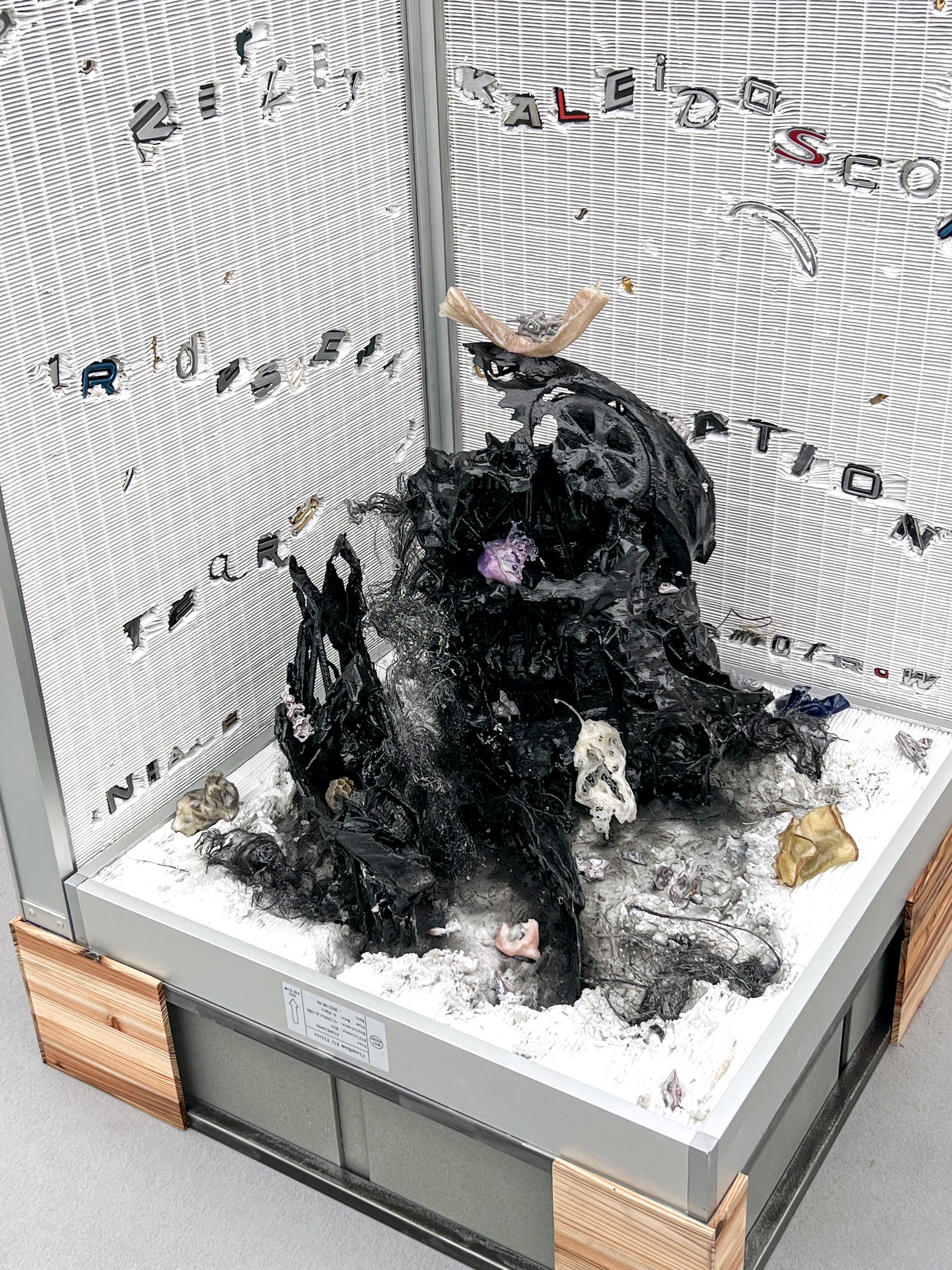 1. Dedicatory Stele for You, 2023 Industrial HEPA air filters, harvested car letters and emblems, wood, steel, lard embedded textile, resin and flocking over 3d printed PETG plasti