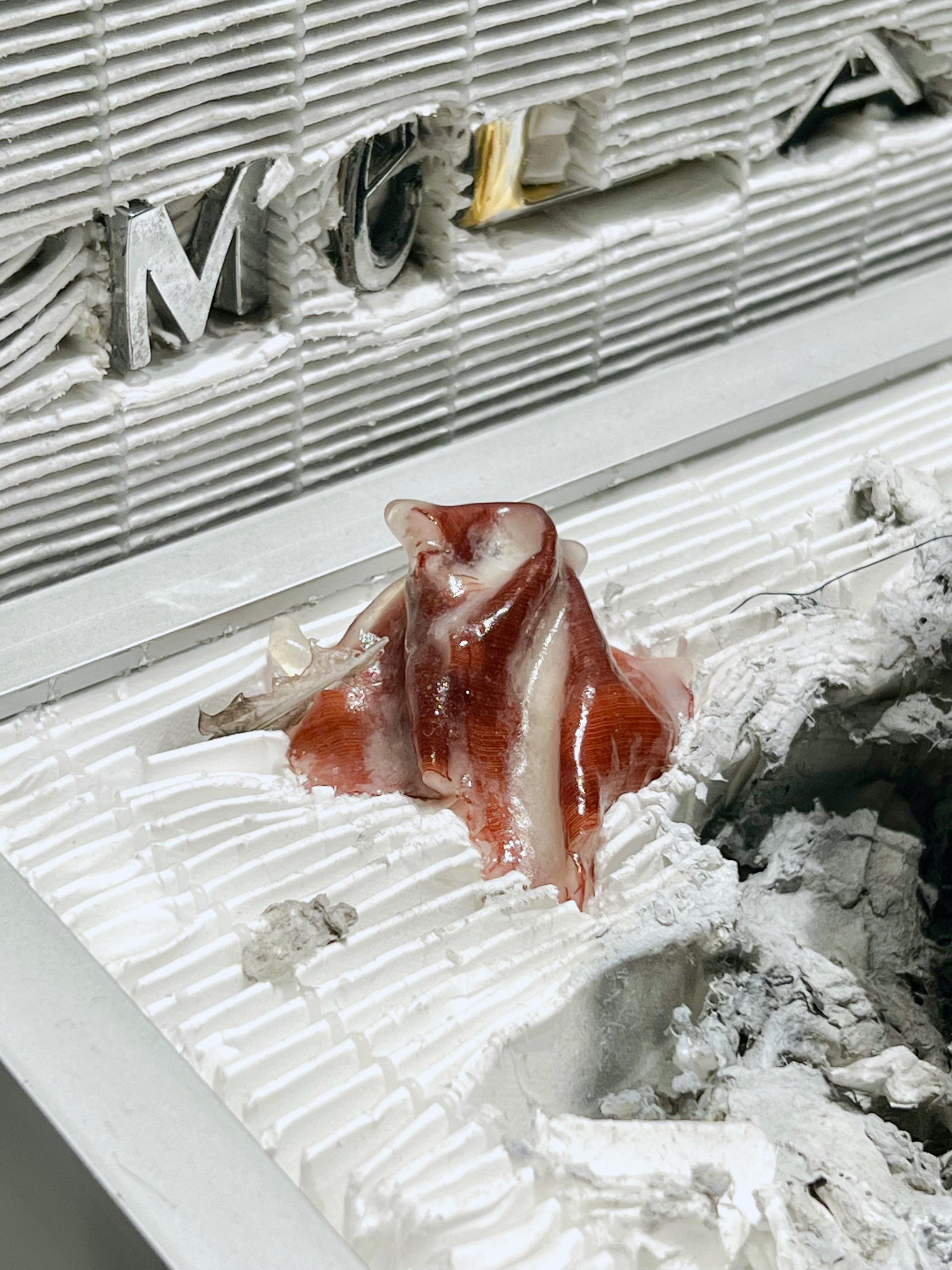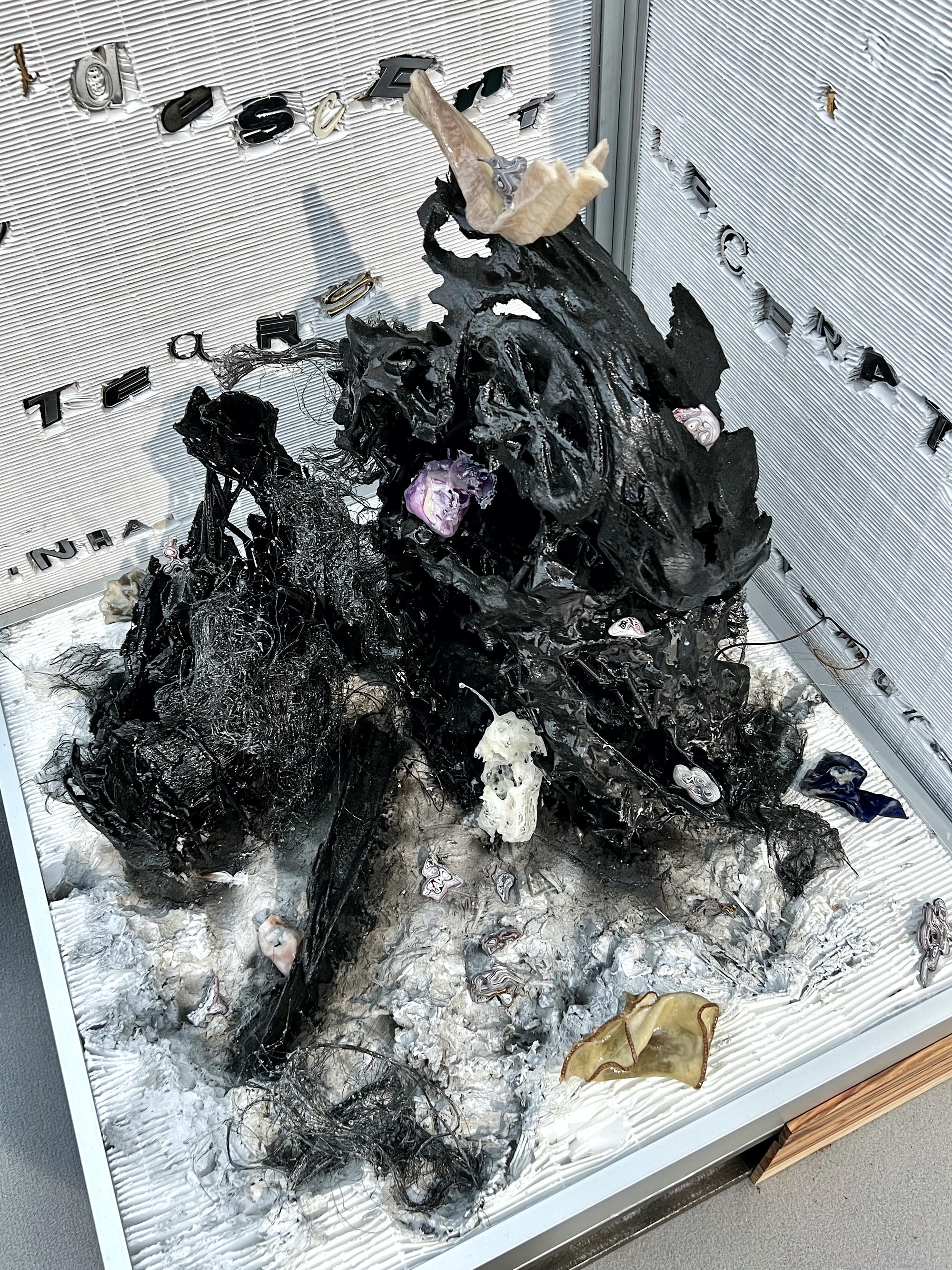 Industrial HEPA air filters, harvested car letters and emblems, wood, steel, lard embedded textile, resin and flocking over 3d printed PETG plastic of photogrammetry 3D models, acr