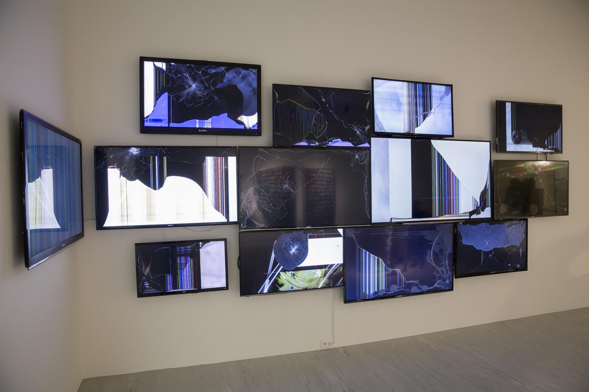The broken and fragmented flatscreens that hung on the walls were all gathered locally in Taiwan from different second hand markets. Each screen plays a compilation of videos where go pro or dashboard cameras go through spinning movements during accidents. Some videos were found on YouTube, while others were filmed by myself by making the camera go through the circular motions while recording, such as by throwing the camera at night or strapping the camera to the wheel of a moving car.