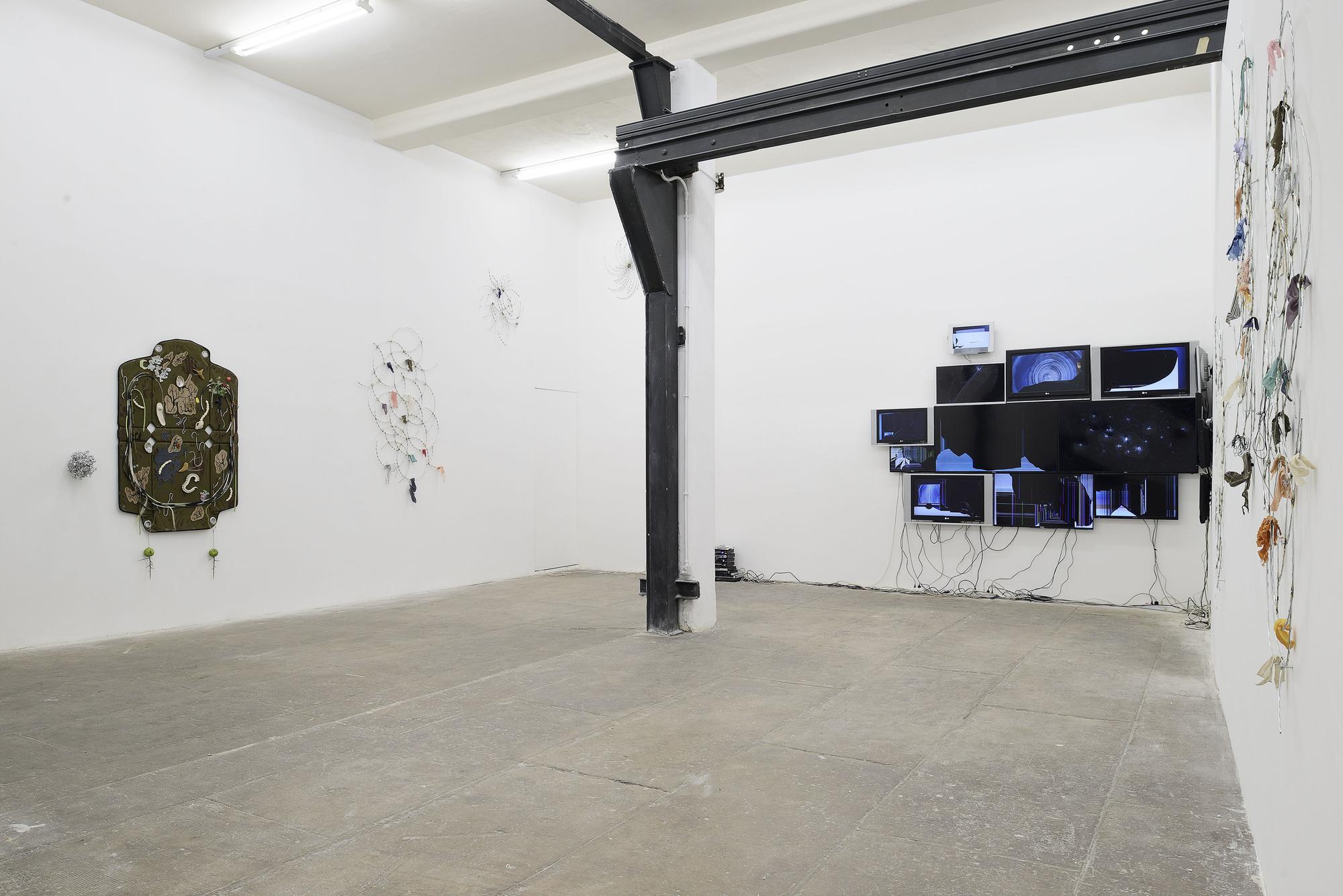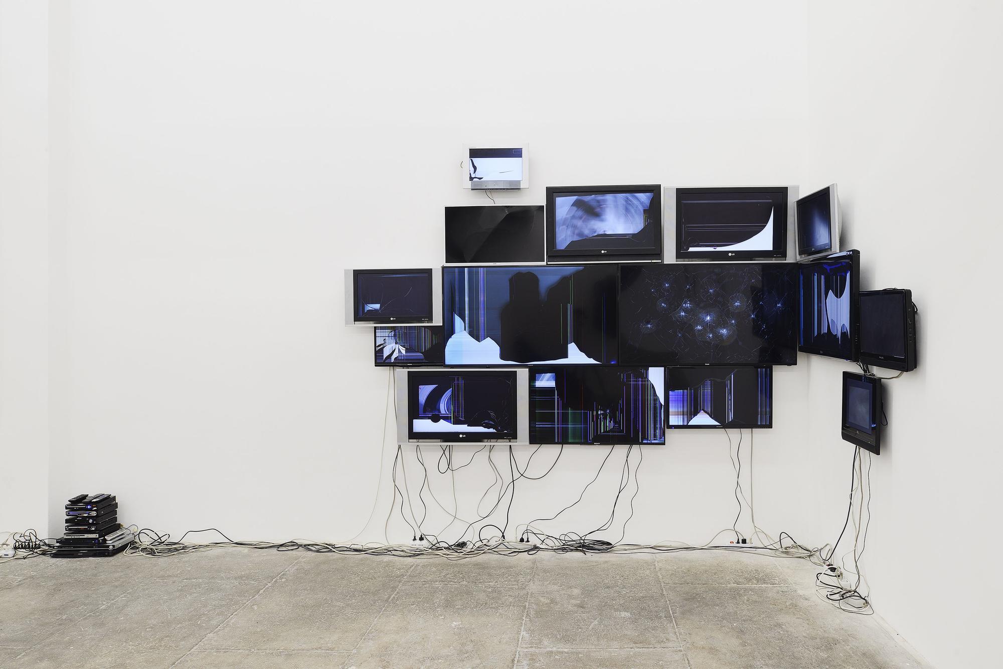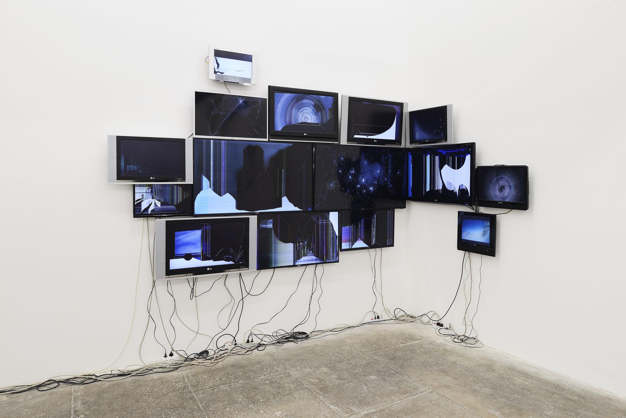 The broken and fragmented flatscreens that hung on the walls were all gathered locally from different second hand markets. Each screen plays a compilation of videos where go pro or dashboard cameras go through spinning movements during accidents. Some videos were found on YouTube, while others were filmed by myself by making the camera go through the circular motions while recording.