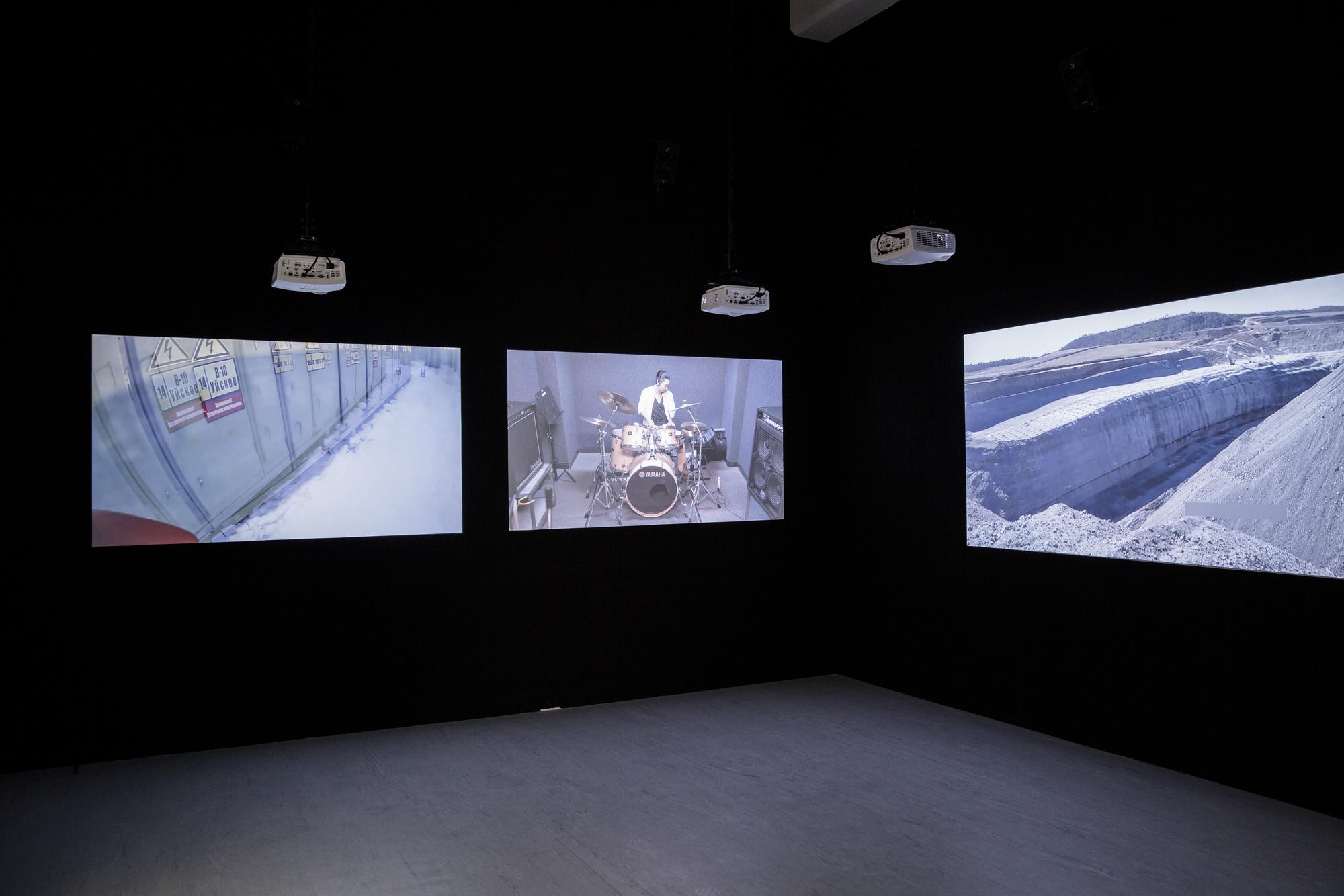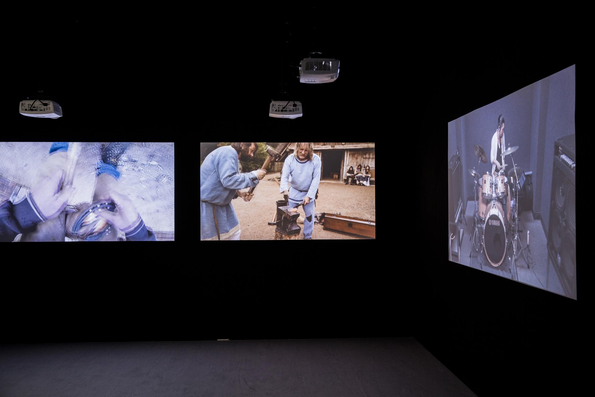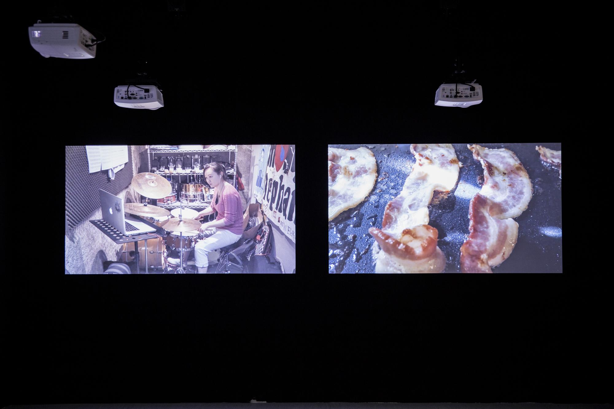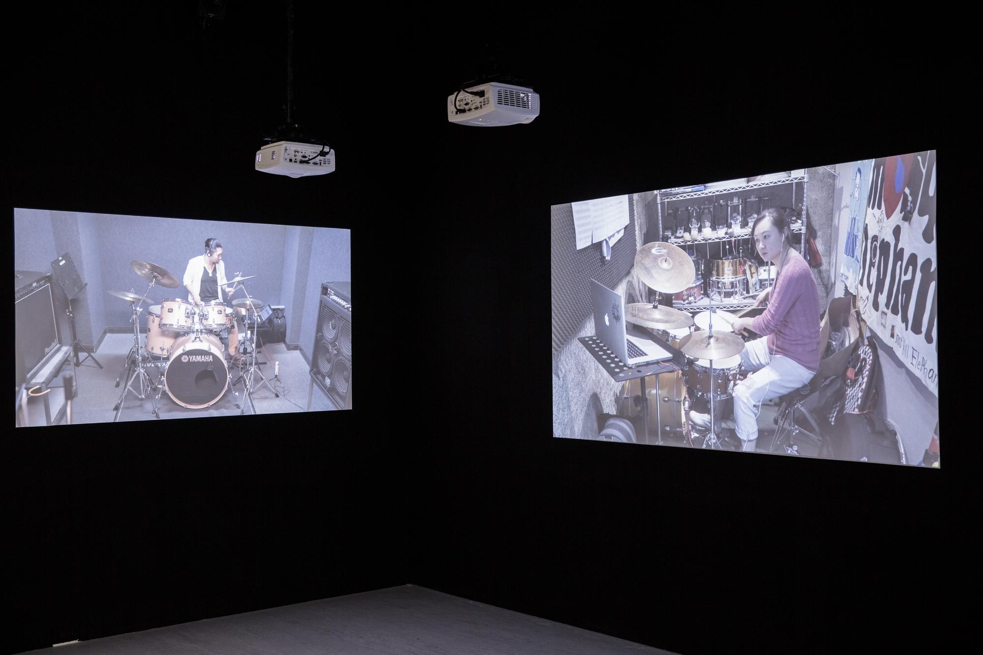 3 drummers mimic and perform compilations of youtube videos; multi-channel videos projected on walls.