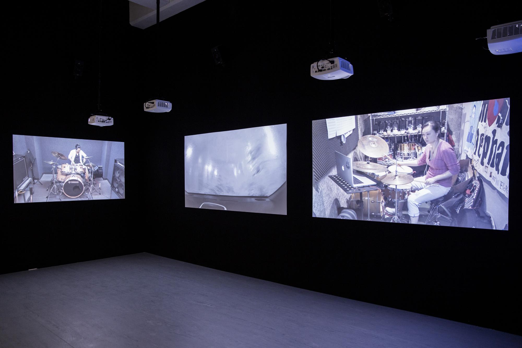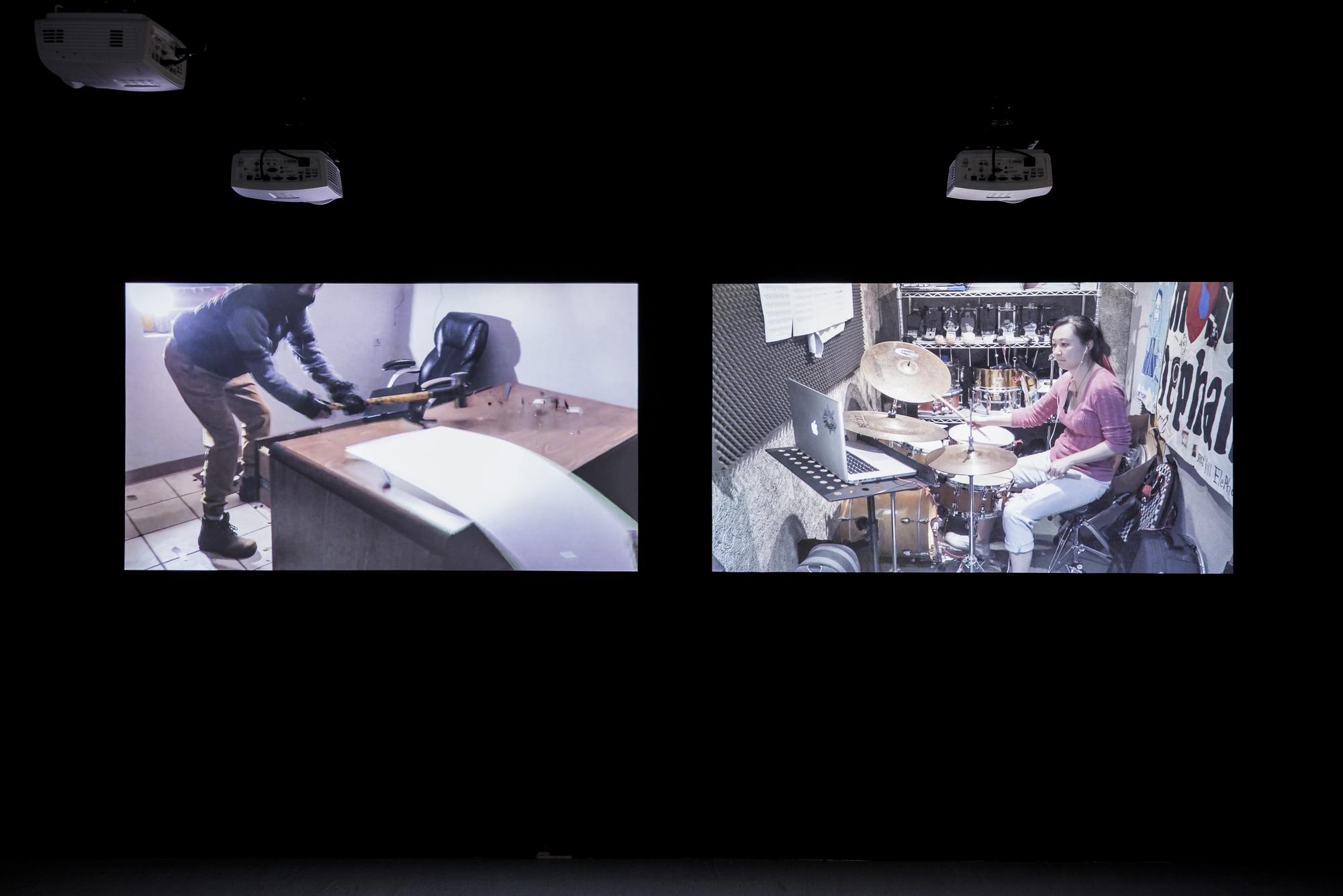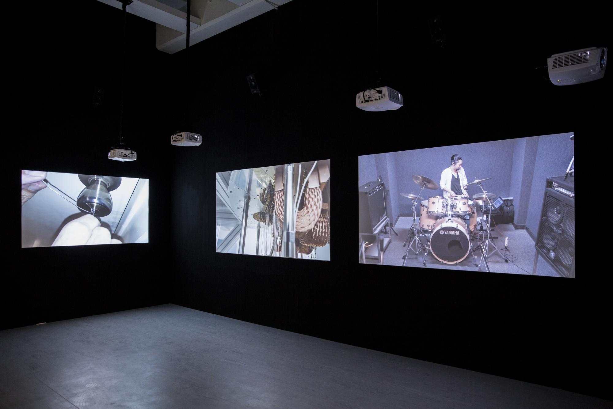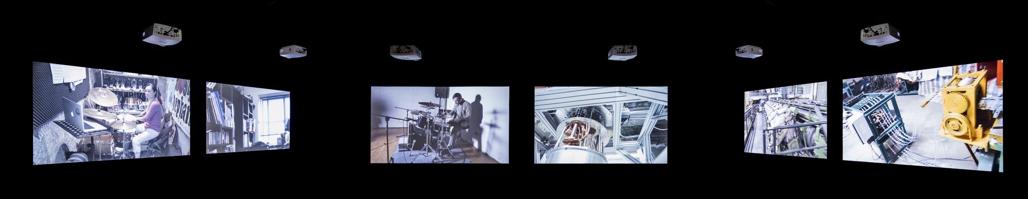 Drumming is one of the oldest forms of music, one that can be seen all across cultures from shamanic rituals to signaling devices in warfares. The act of hitting objects to make sounds is also one of the most fundamental and earliest ways of how humans understand the world around them. In Structure Study VI, three drummers are tasked with mimicking the sound of three different compilations of found youtube videos with their drums. These found videos are various seemingly random recordings of different situations in life where drum-like sounds are made, primarily through speed and impact, by interactions between objects, animals, or naturally occurring phenomenons. For example: car crashes, earthquakes, factory machines operating, mining explosions, animals running, lightning. and gun fights. In the end the original found videos and video recordings of the drummers’ interpretations through drums are projected side by side onto six screens with each with separate speakers to create a symphony of cacophony.