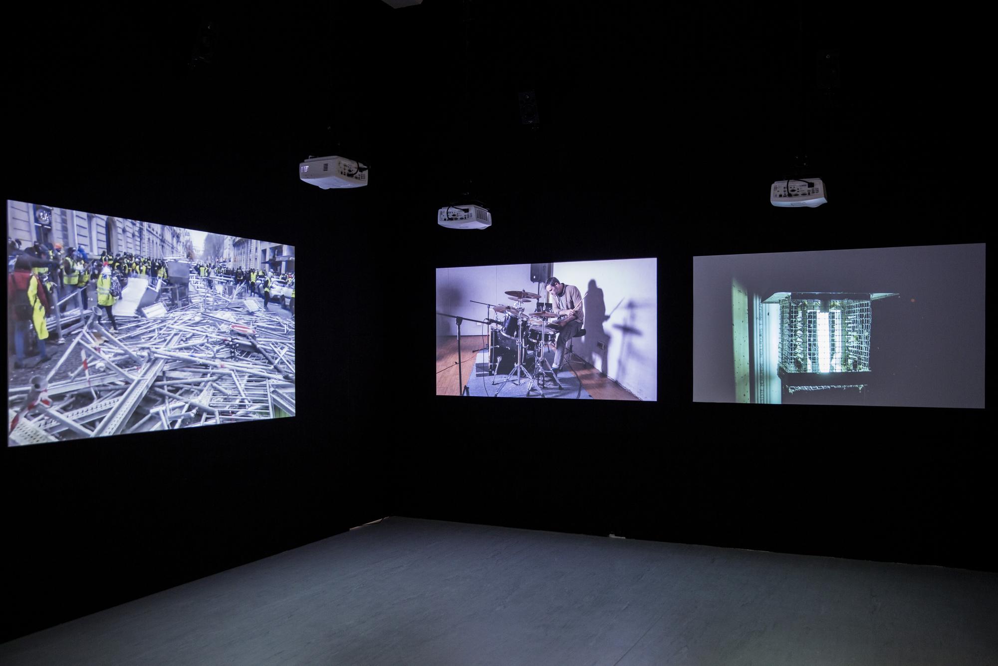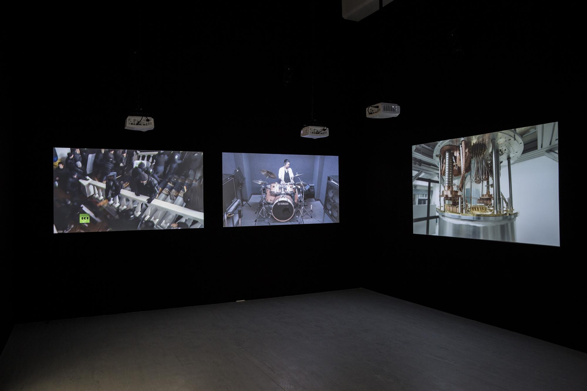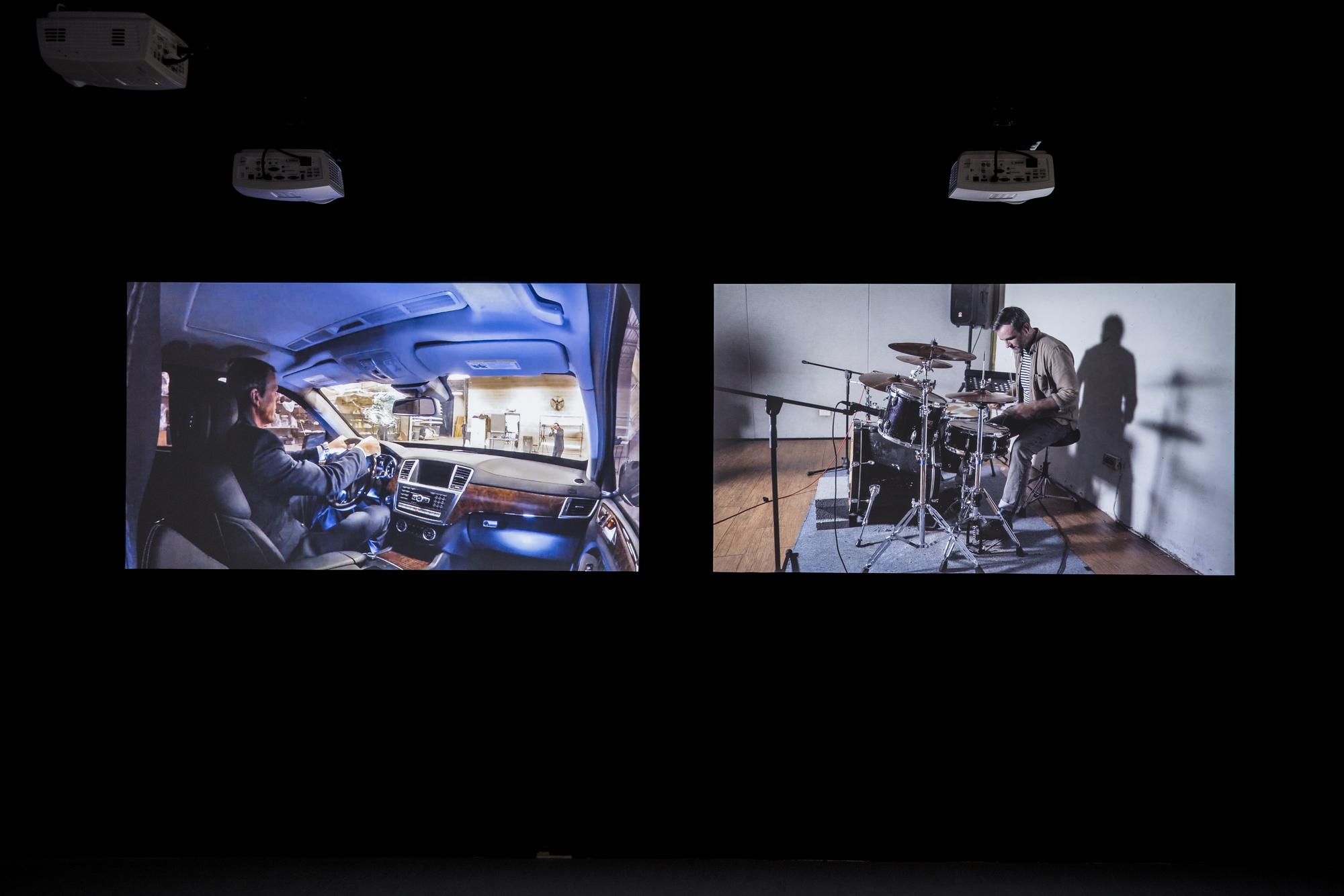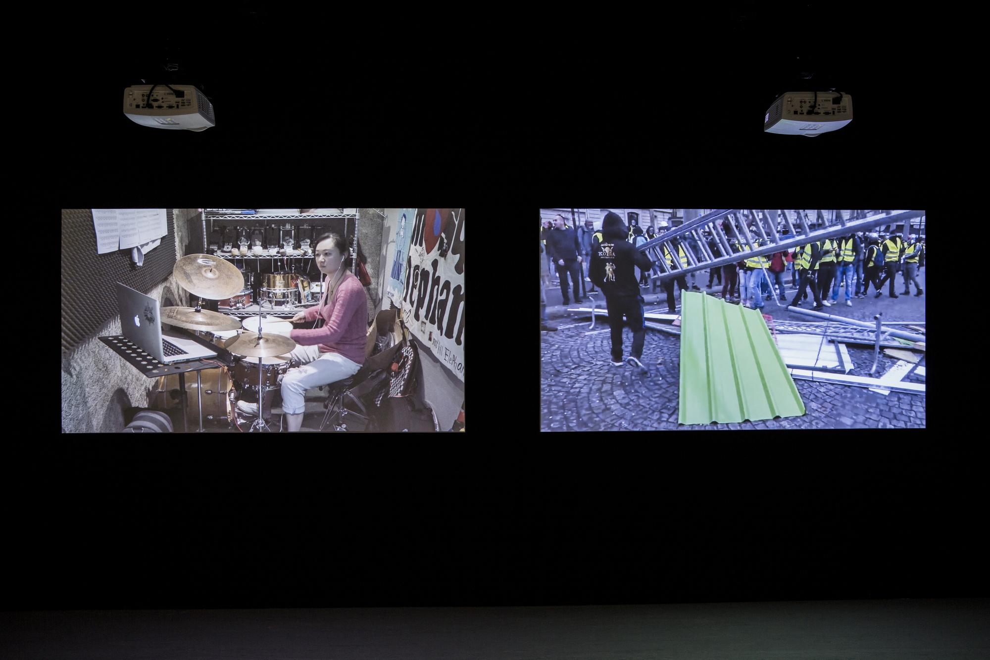 Drumming is one of the oldest forms of music, one that can be seen all across cultures from shamanic rituals to signaling devices in warfares. The act of hitting objects to make sounds is also one of the most fundamental and earliest ways of how humans understand the world around them. In Structure Study VI, three drummers are tasked with mimicking the sound of three different compilations of found youtube videos with their drums. These found videos are various seemingly random recordings of different situations in life where drum-like sounds are made, primarily through speed and impact, by interactions between objects, animals, or naturally occurring phenomenons. For example: car crashes, earthquakes, factory machines operating, mining explosions, animals running, lightning. and gun fights. In the end the original found videos and video recordings of the drummers’ interpretations through drums are projected side by side onto six screens with each with separate speakers to create a symphony of cacophony.