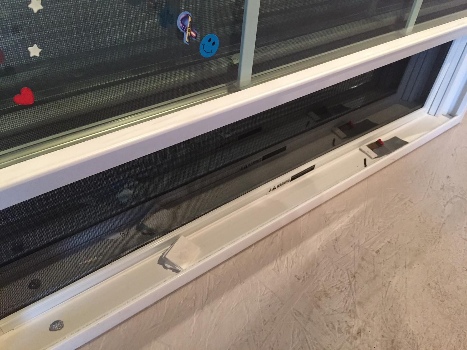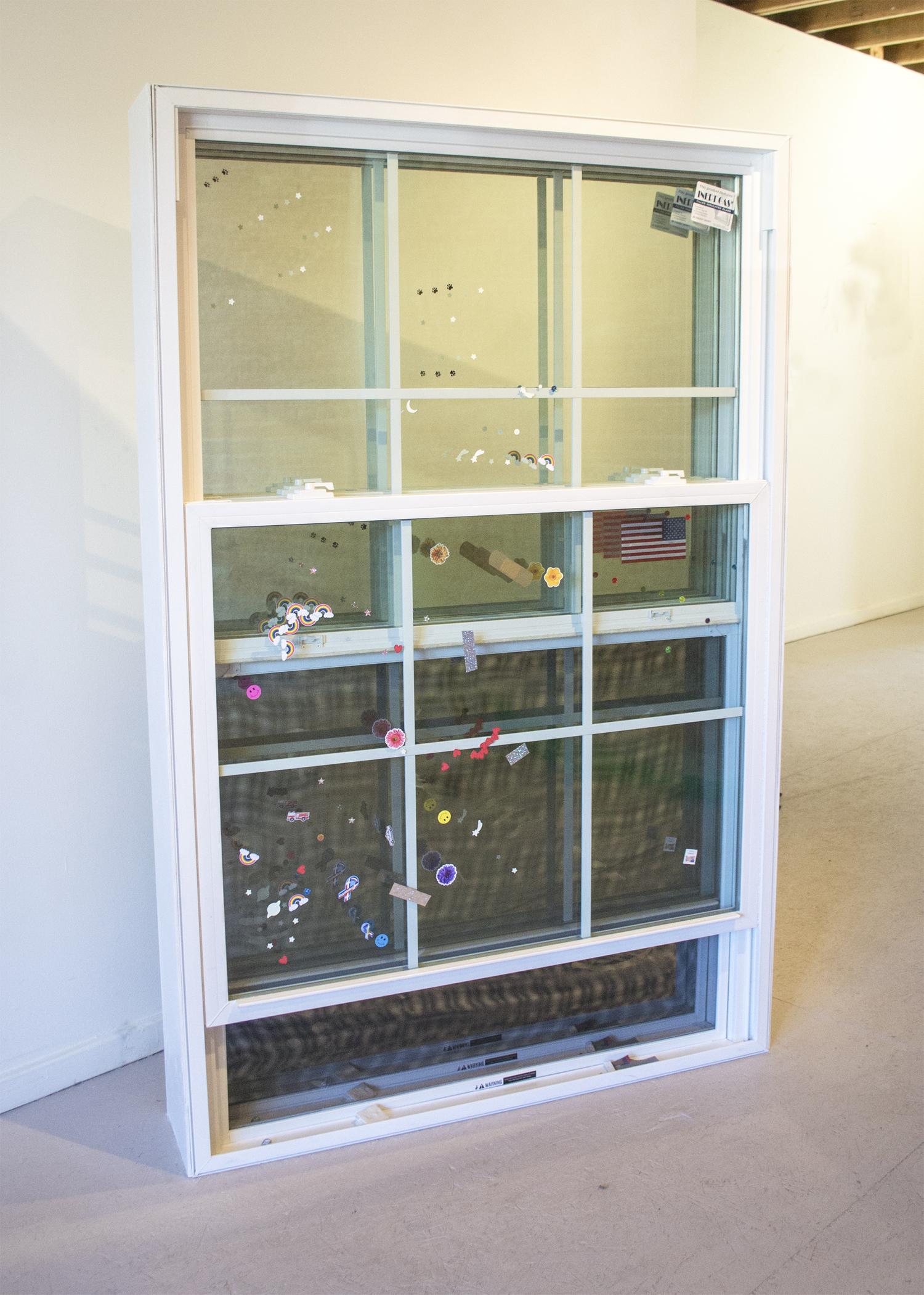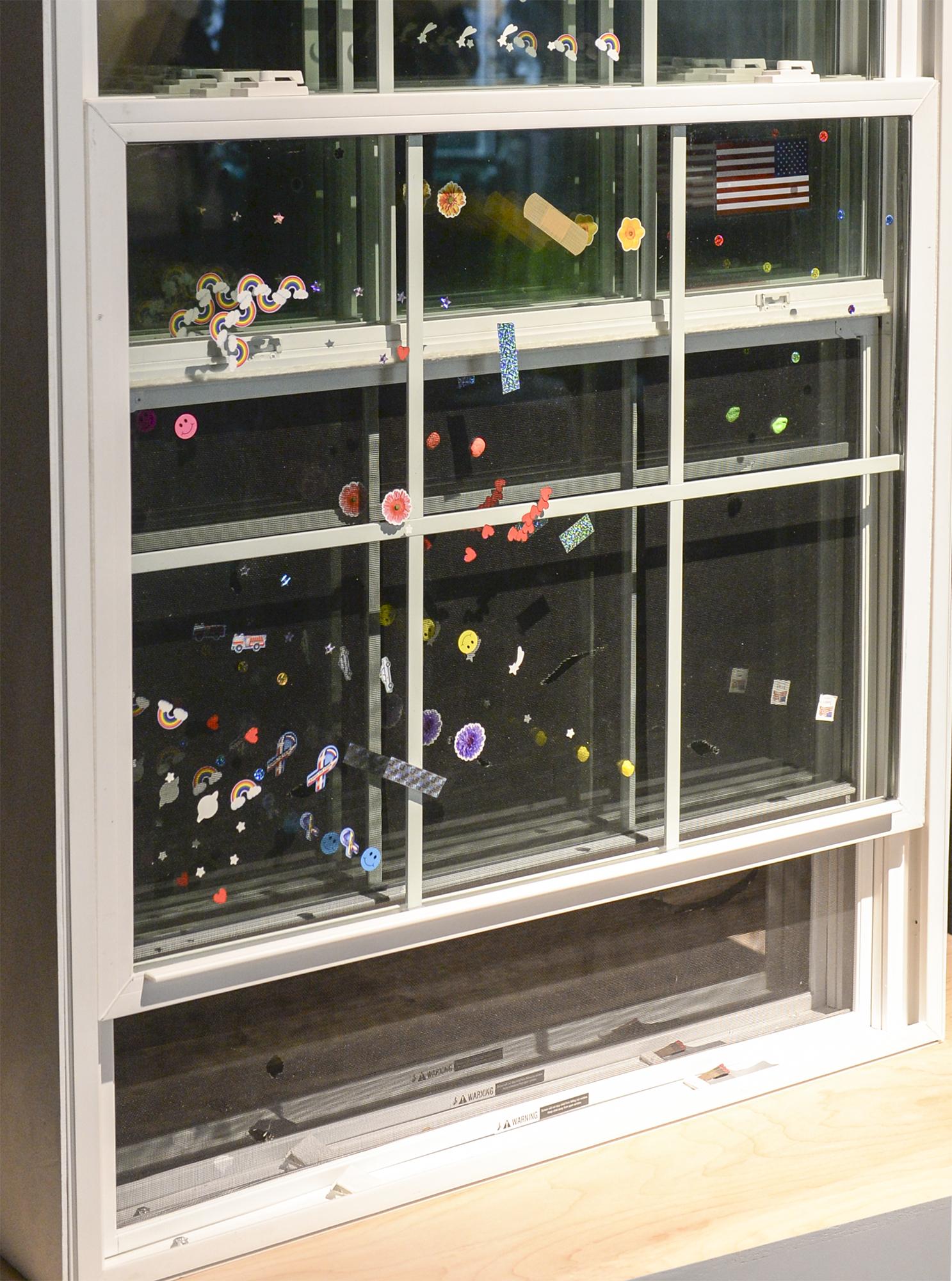 stickers, acrylic paint and plastic on windows