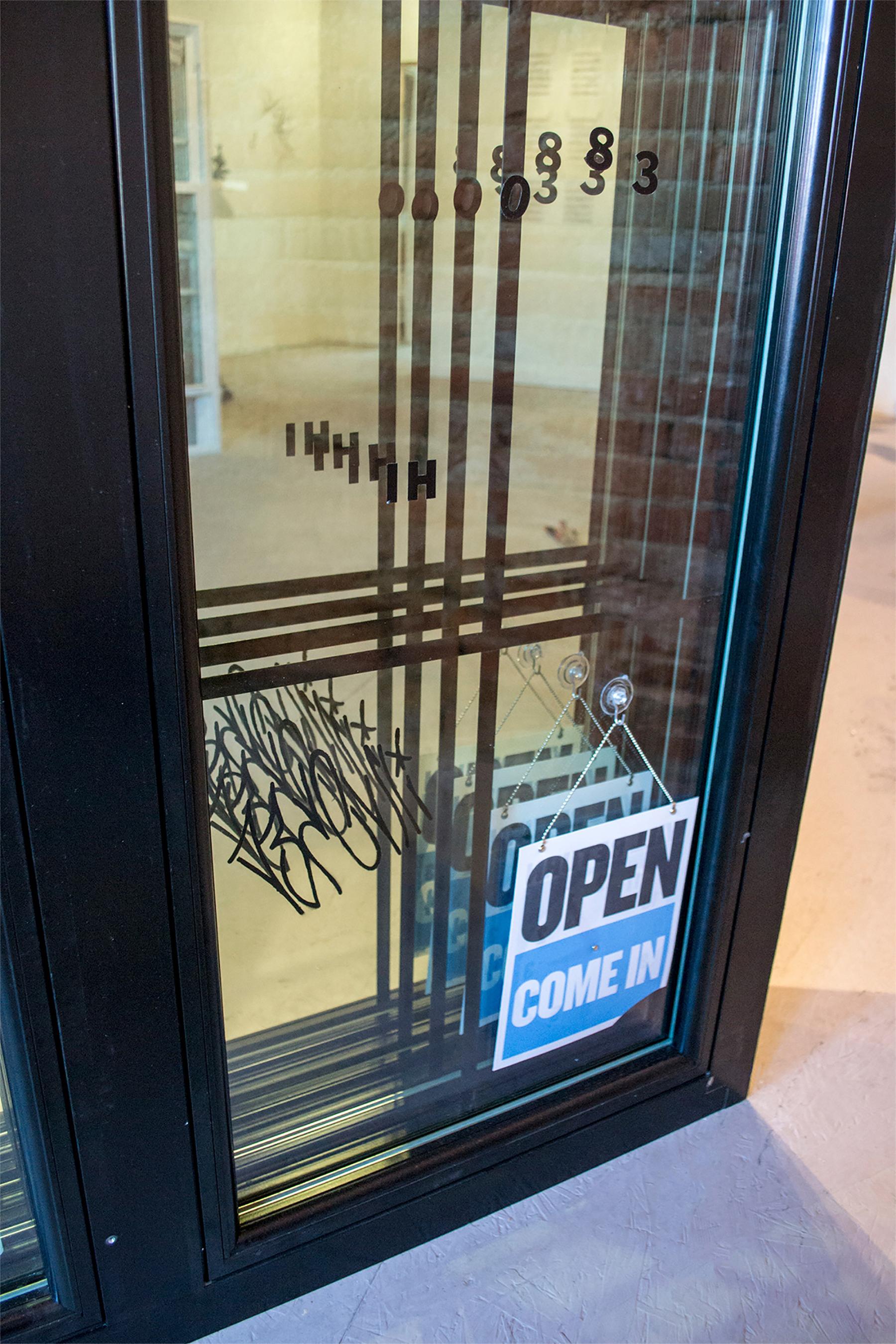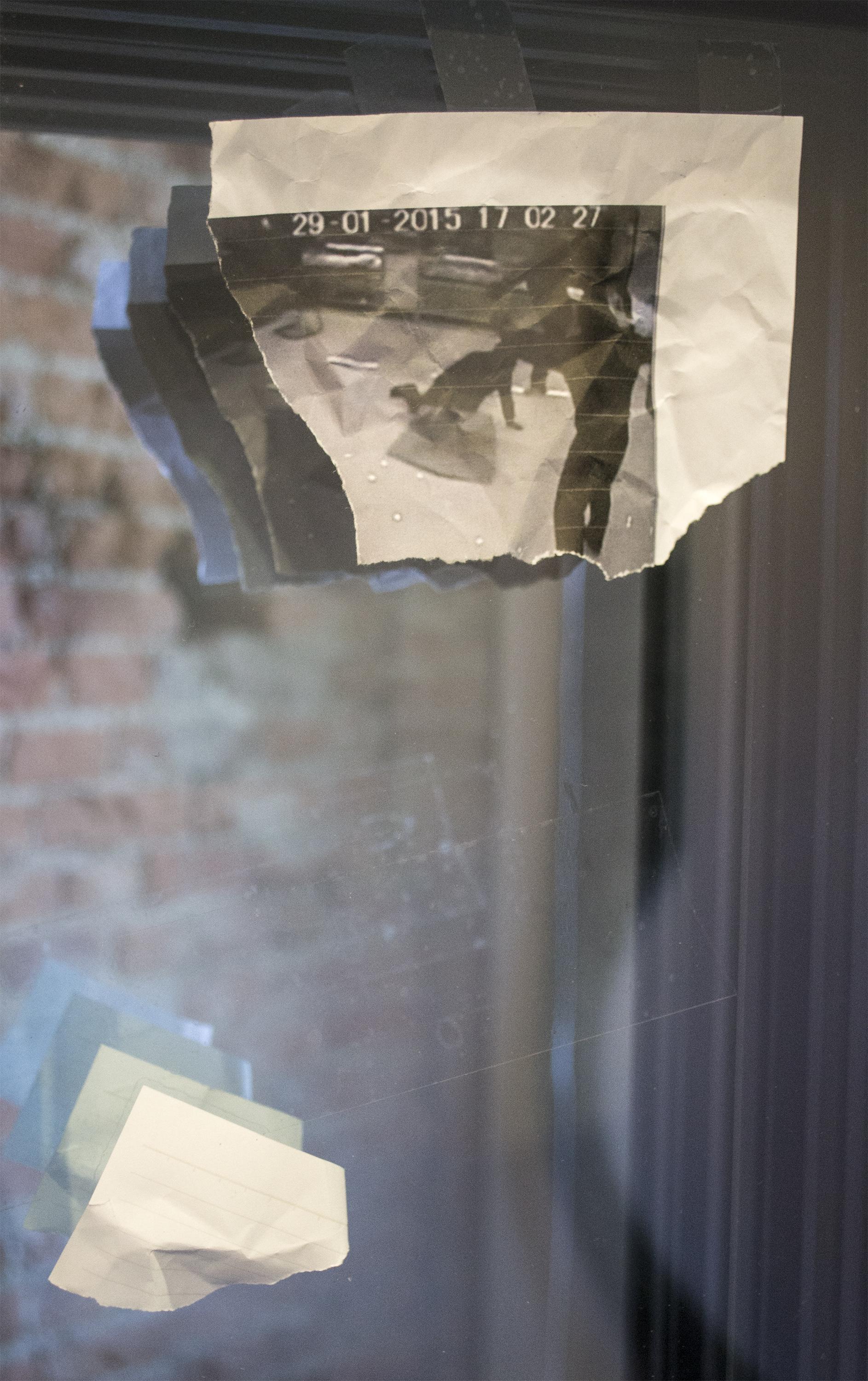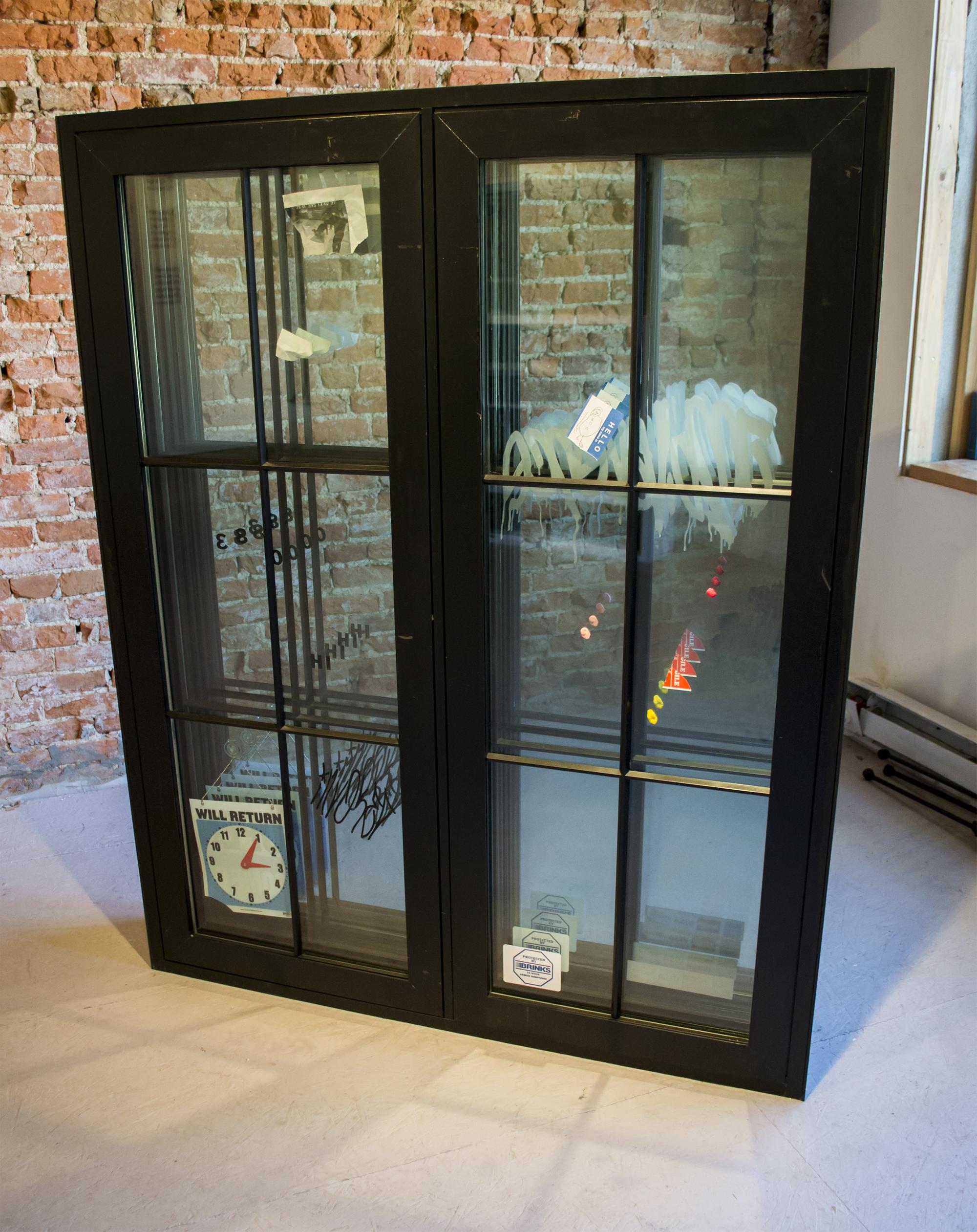 windows, stickers, tape, paper, spray paint on glass, acrylic paint on plastic