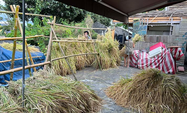 從收稻展開的駐地之旅、一起脫穀、農忙後的共作共食,在過程中了解所踏入的每寸農地、在山海之間的旱稻田,始於一搓意外落下的稻穗帶回栽種,才能長出後續關於土地的故事、關於釀酒的故事、關於地方和彼方的故事。