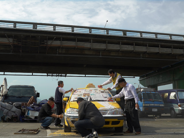 〈重新破裂〉組合了「全民計程車械鬥」與吳中煒未完整實現的計劃「台北空中破裂」這兩個看似不相關的歷史片段。我邀請了五位當年參與計程車械鬥的運將回到事件現場演出,並將一位噪音吉他手(李那韶),懸吊於重新橋上方演奏。