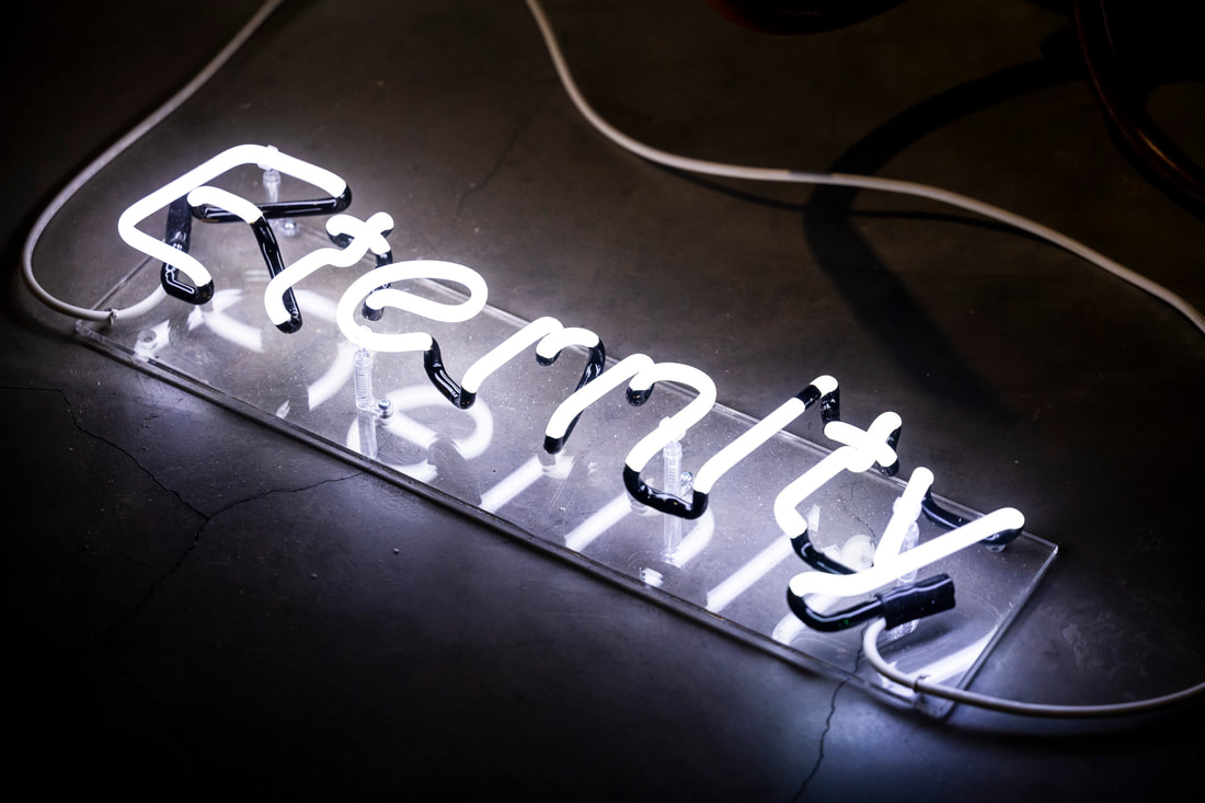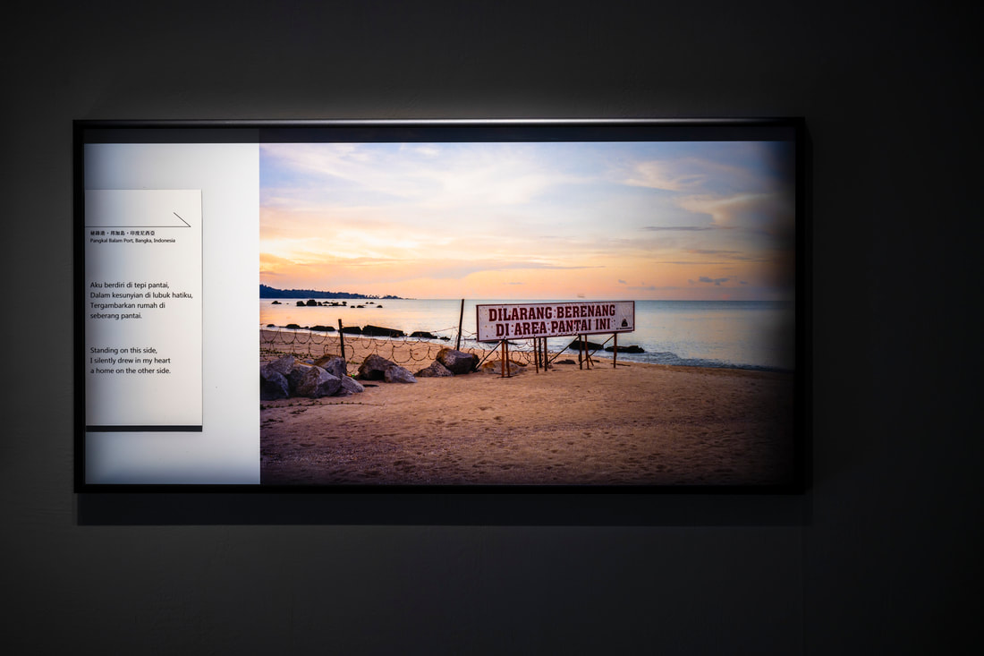 永遠會是永恆嗎?早年金門人大量離鄉前往東南亞謀生,卻因戰爭被迫成為移民,幸運者就此生根異鄉、不幸者客死於南海的浪流裡。原鄉景色、語言與文化成為遙不可及的模糊記憶。在越洋練習這組裝置作品裡,藝術家林羿綺延續家族長輩橫跨金門、臺灣與印尼的信使路徑,以船錨呈現出洋客流離之境遇,配以霓虹燈字句「Forever, Is(not), Eternal」,回應移民後代對於國家等身份認同之疑惑,牆面呈現出洋點金門後浦港與登陸點印尼邦加島秘錄港現今景色,疊上四種語言(閩南語、中文、印尼文與英文)的詩句,呈現出洋者們對於彼岸和此岸的想像與練習。
