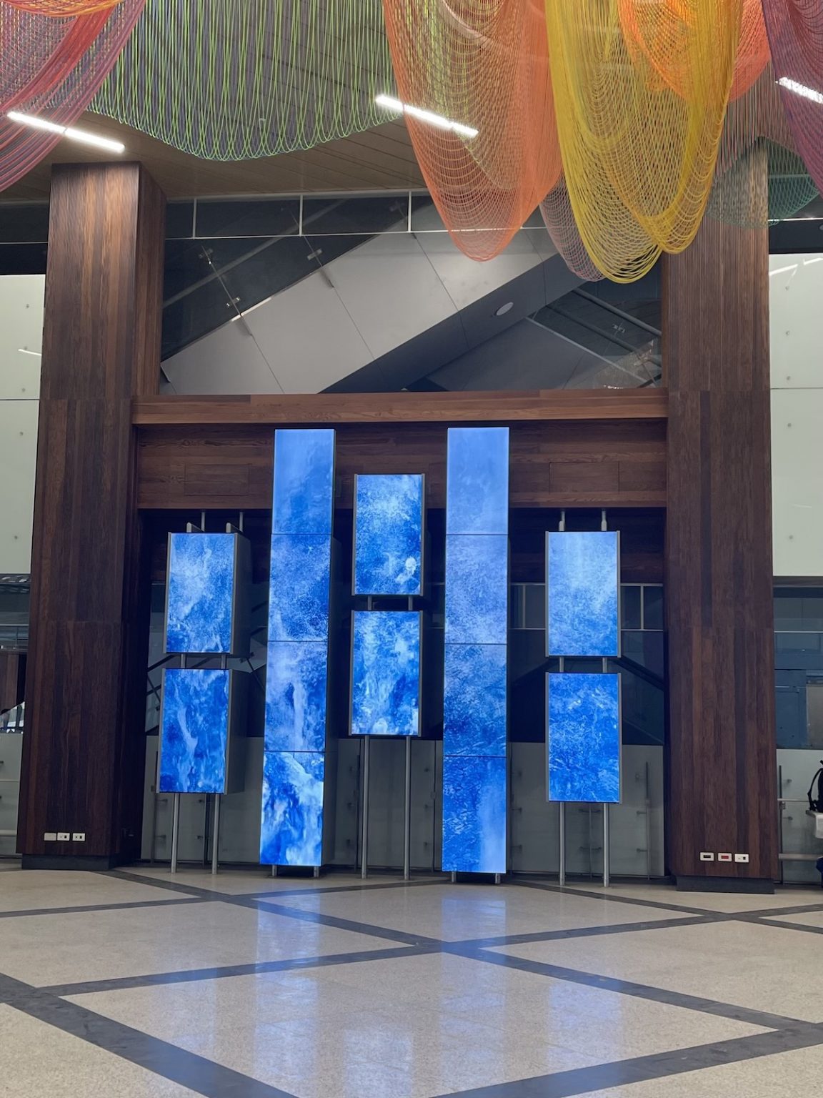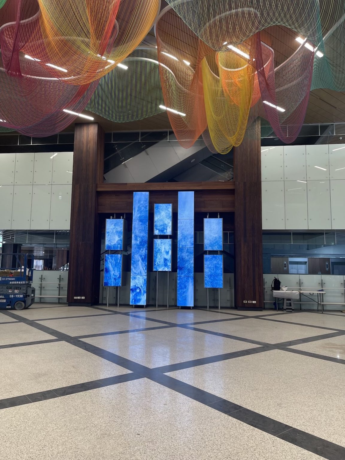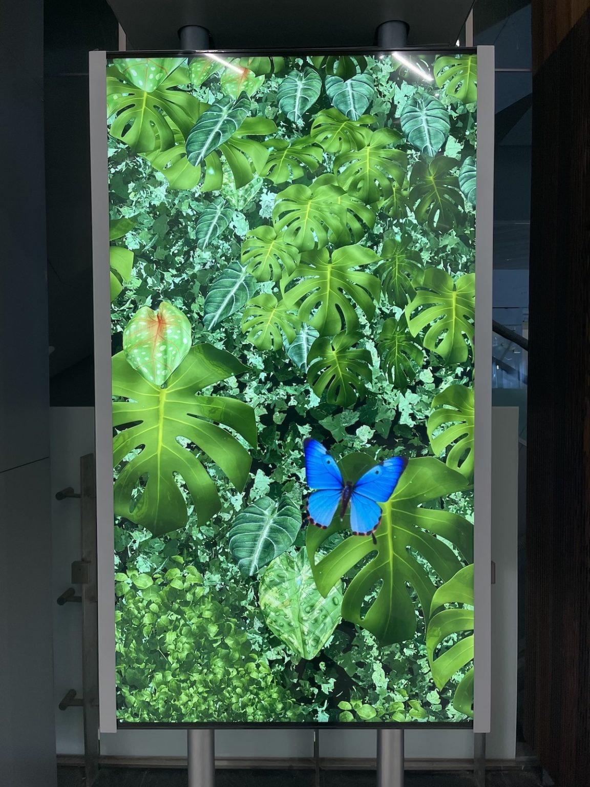 《律動的風景》這件作品我嘗試了以3D即時運算與動畫結合,呈現數位植生牆的影像視覺,導入中央氣象局的天氣即時資訊,將晴雨、風動、光影的變化導入作品畫面之中,讓數位畫面轉化為與現實時空的天氣變化連動,讓醫院中的民眾能夠透過這件作品重新與醫院、群眾產生對話交流的可能,也回應一個醫院空間能否在顧及生命與生活之中,也有藝術美學存在的可能性。