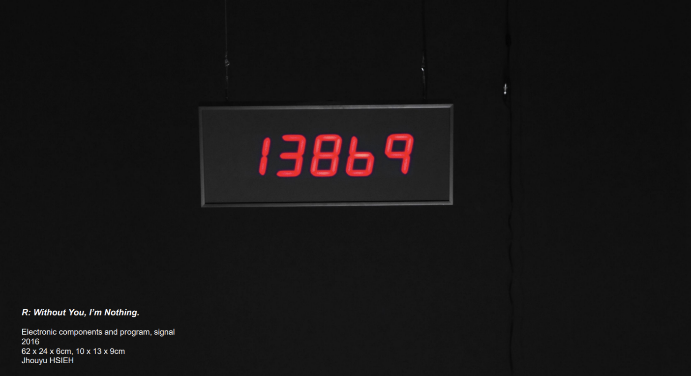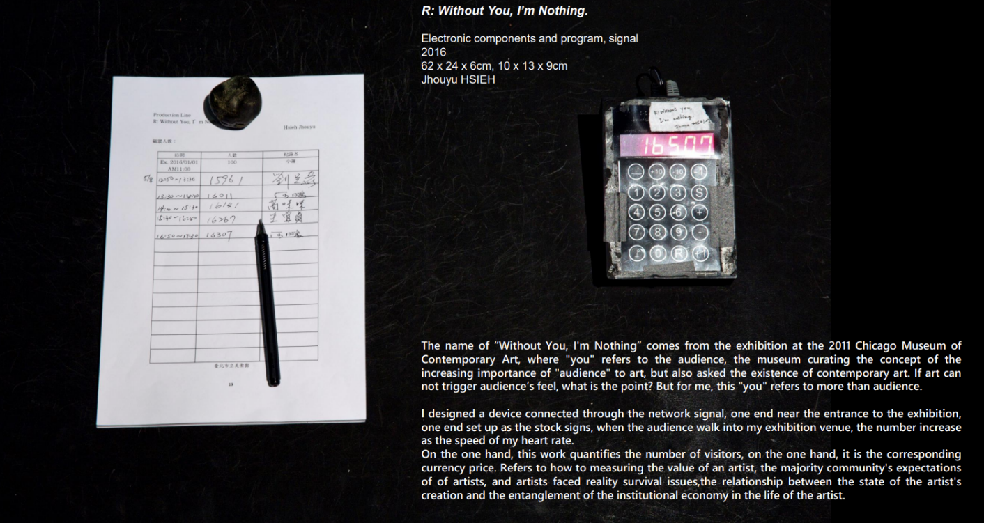 因此我設計了一個透過網路訊號連結的裝置,一端放在靠近展場入口的地方,一端以股票告示牌的方式懸吊設置,當有觀眾進入我的展場,數字以我的心跳速率往上增加。這件作品一方面定量了觀眾人次,一方面對應的卻是貨幣價格,指涉機構如何衡量一位藝術家的價值、社會上多數人對藝術的期待和當藝