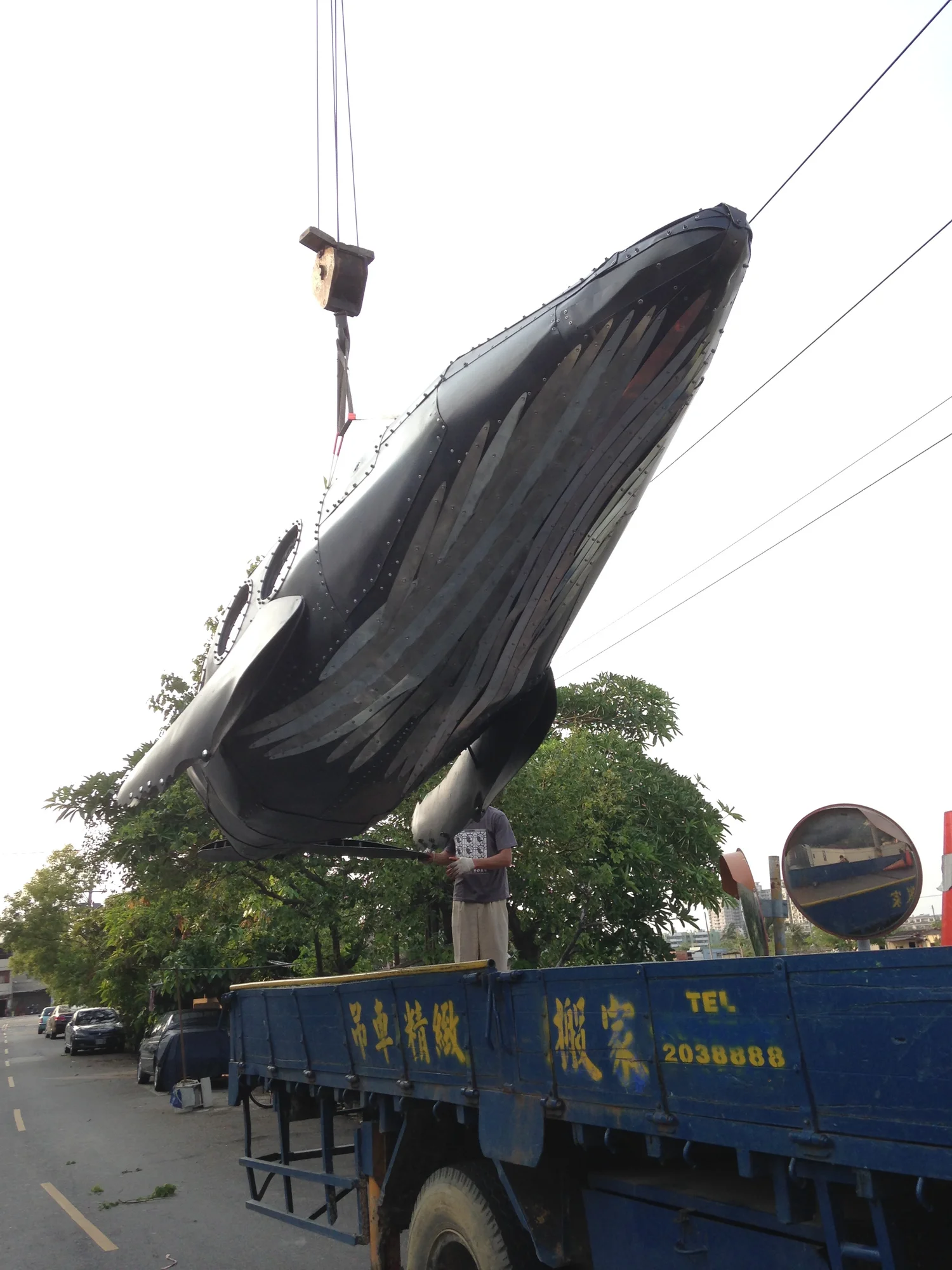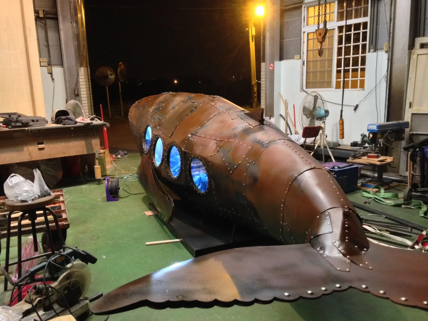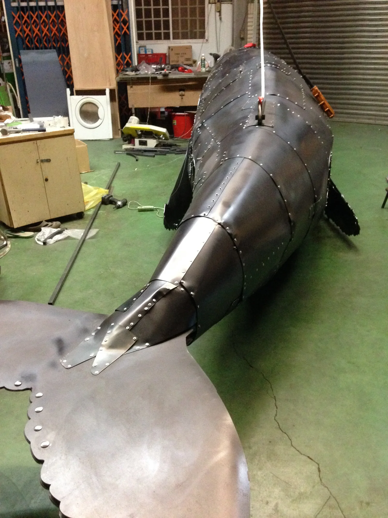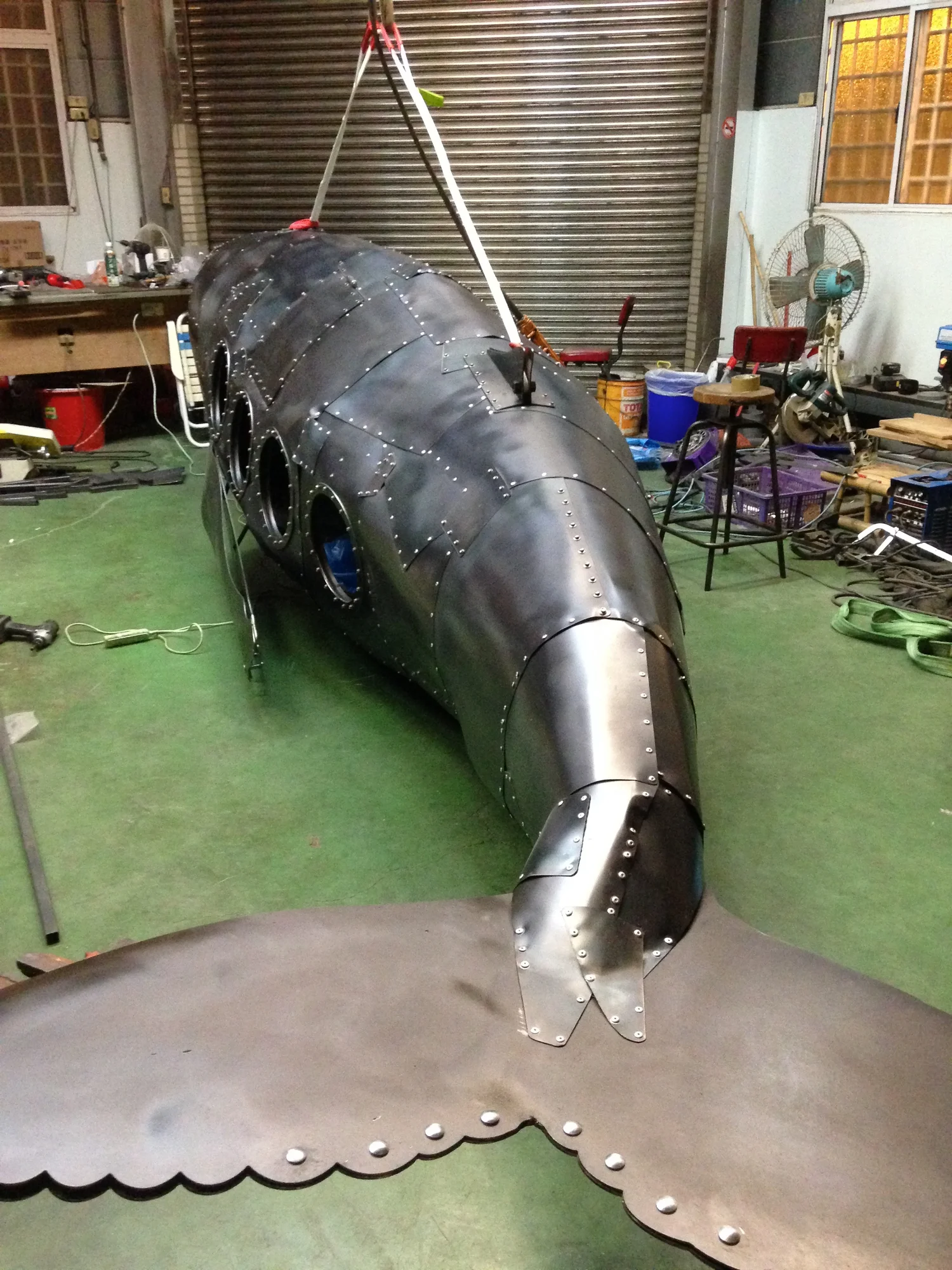 環境保育是現代人關心的問題,我使用金屬複合材料以手工的方式包覆著鯨魚造型呈現工業的機械感,鯨魚內部是由生活中包裝垃圾的塑膠袋構成,塑膠袋象徵在都市生活每天更新垃圾的物件,好比一隻滿肚子垃圾的鯨魚,因為吃了太多藍色塑膠袋而有些難過,所以是憂鬱的藍鯨魚。