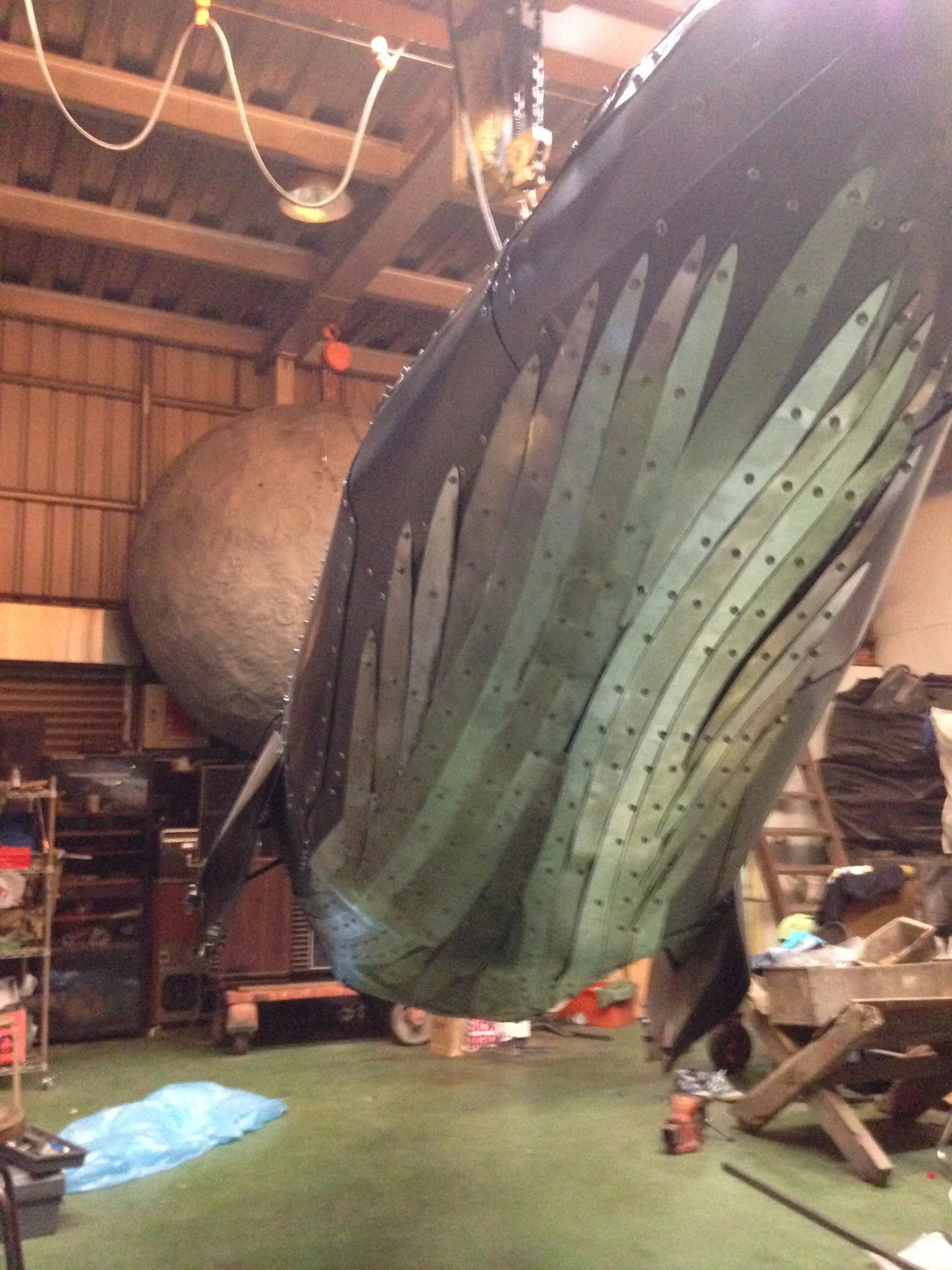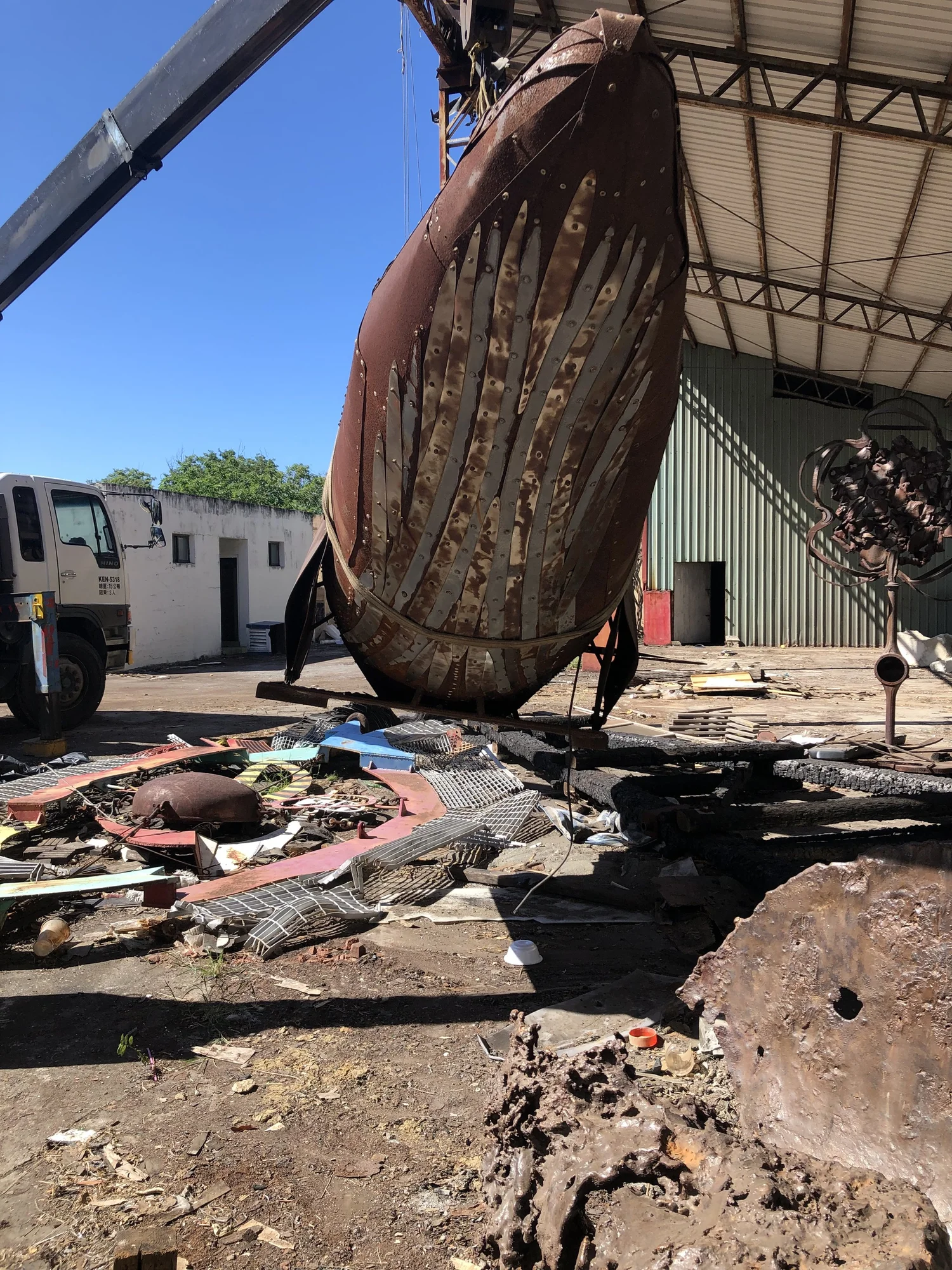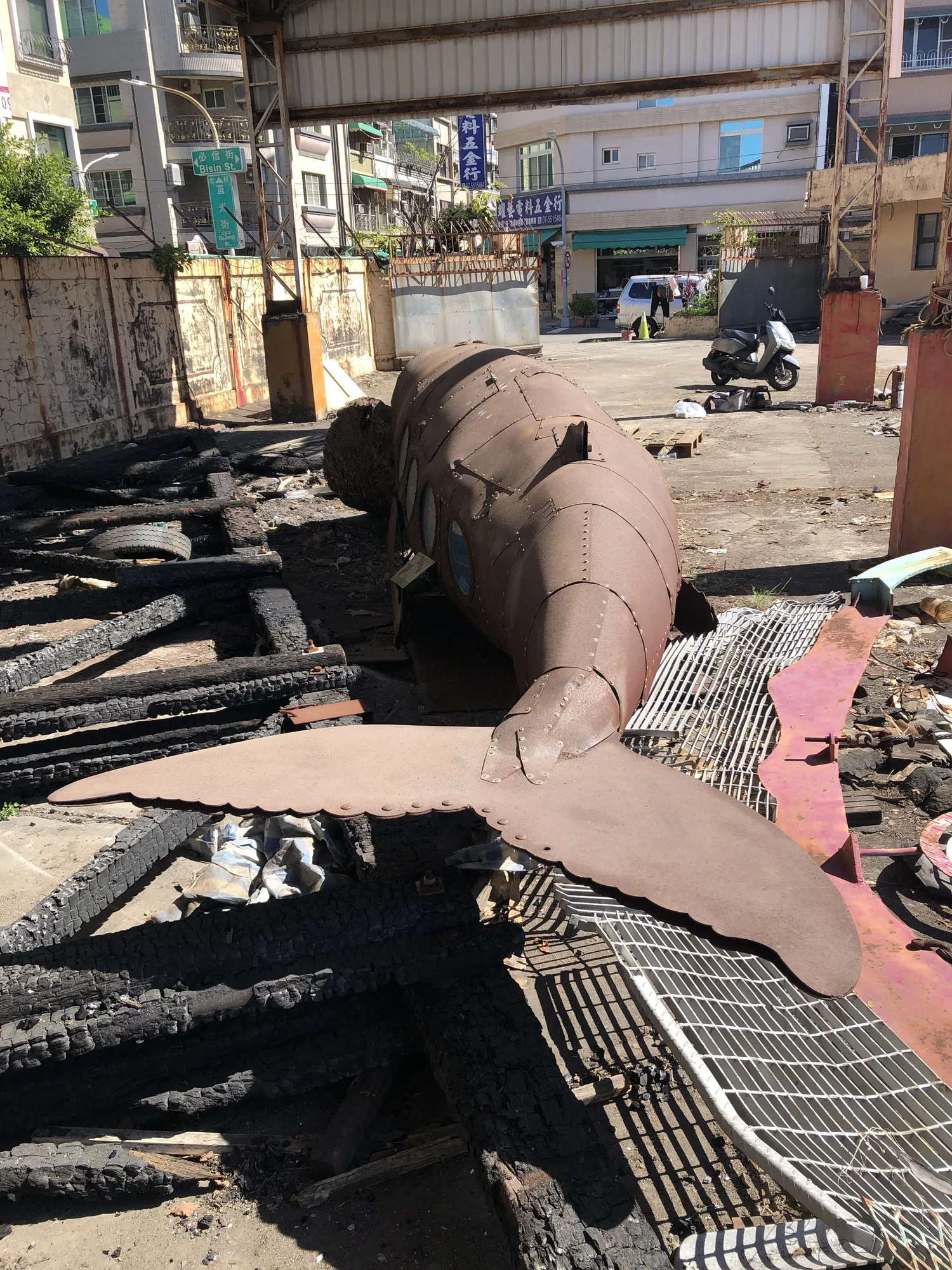 環境保育是現代人關心的問題,我使用金屬複合材料以手工的方式包覆著鯨魚造型呈現工業的機械感,鯨魚內部是由生活中包裝垃圾的塑膠袋構成,塑膠袋象徵在都市生活每天更新垃圾的物件,好比一隻滿肚子垃圾的鯨魚,因為吃了太多藍色塑膠袋而有些難過,所以是憂鬱的藍鯨魚。