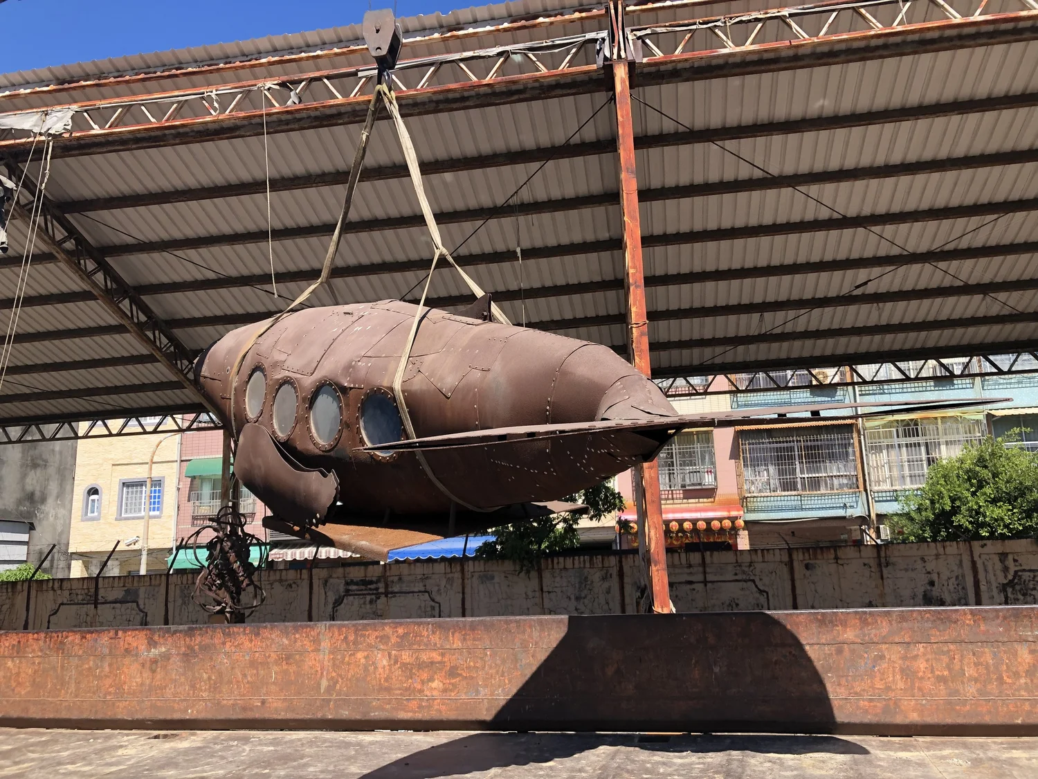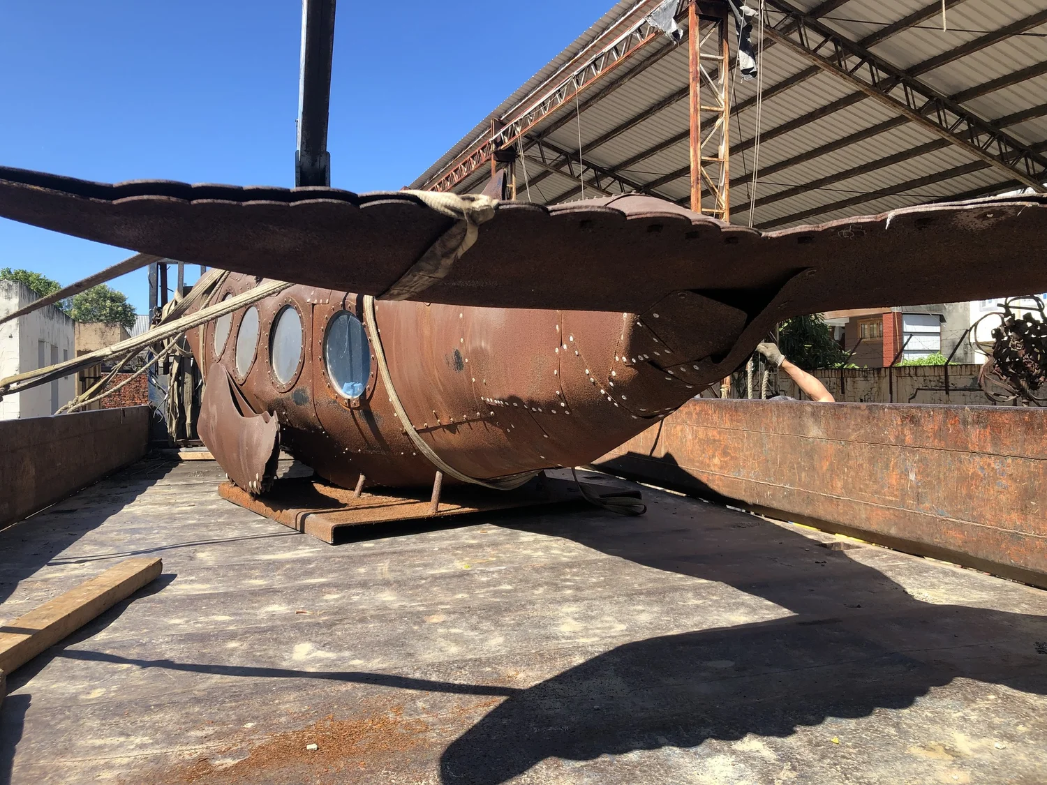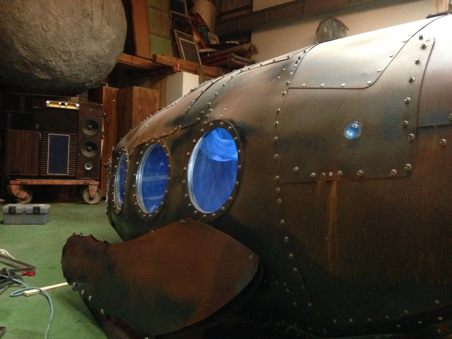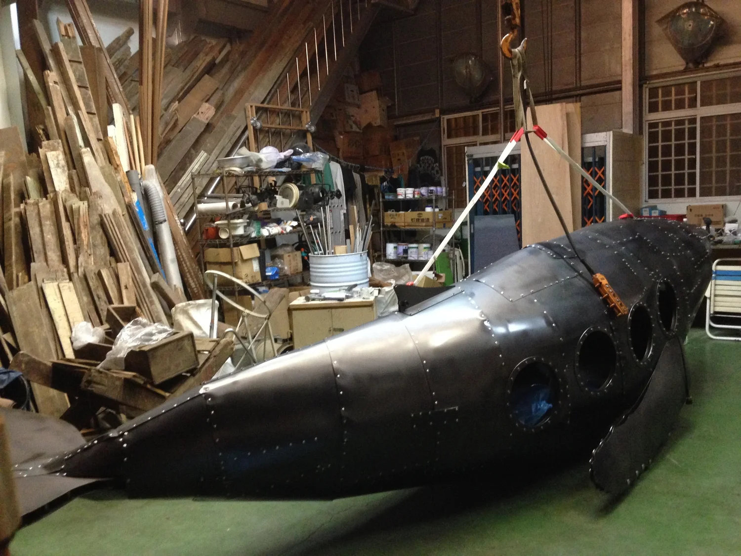環境保育是現代人關心的問題,我使用金屬複合材料以手工的方式包覆著鯨魚造型呈現工業的機械感,鯨魚內部是由生活中包裝垃圾的塑膠袋構成,塑膠袋象徵在都市生活每天更新垃圾的物件,好比一隻滿肚子垃圾的鯨魚,因為吃了太多藍色塑膠袋而有些難過,所以是憂鬱的藍鯨魚。