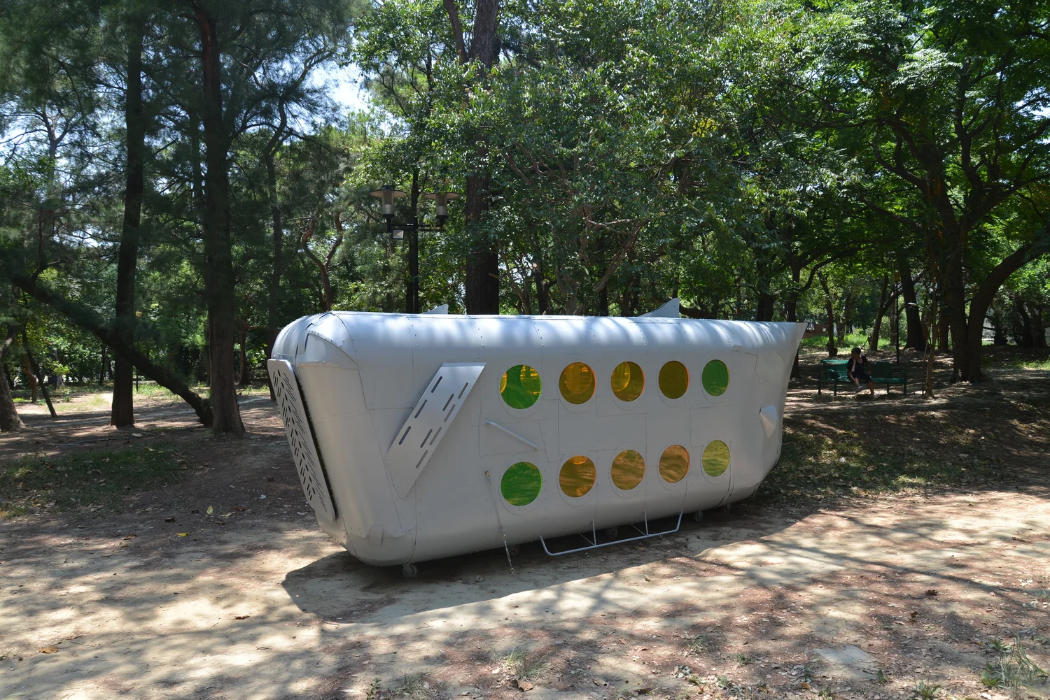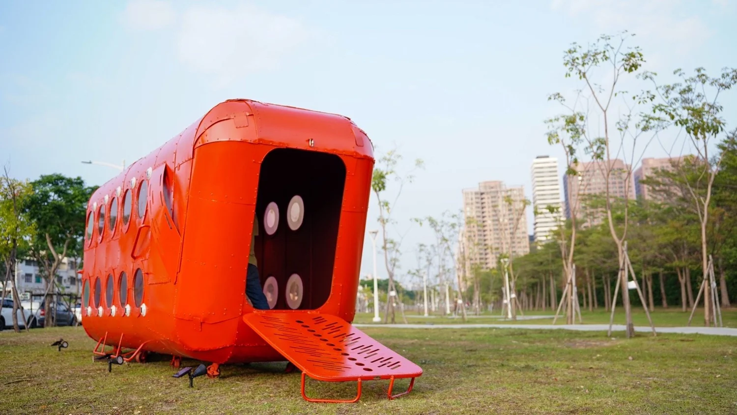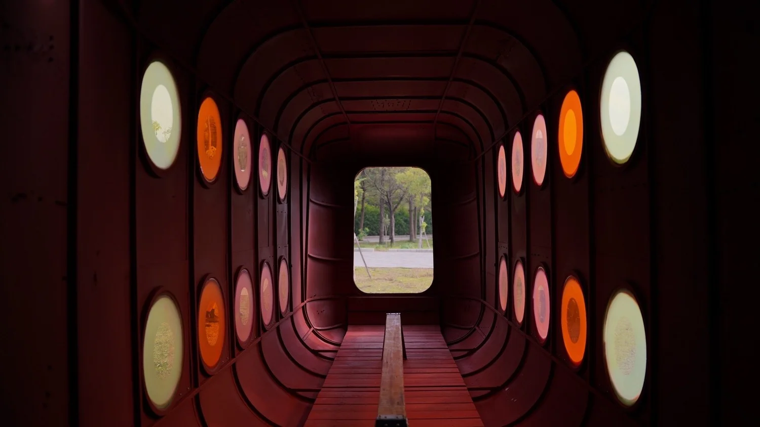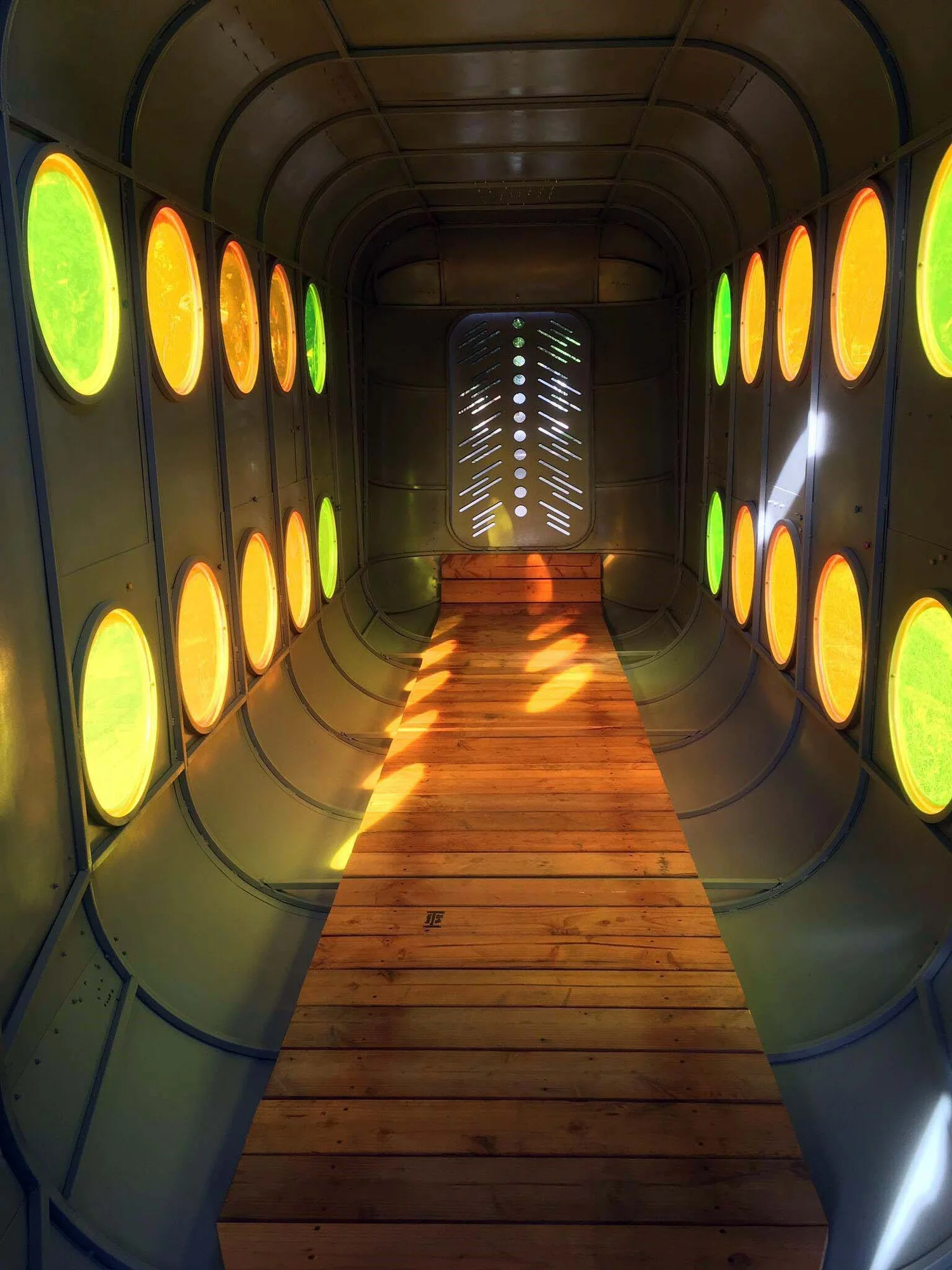 打造穿梭時光的精神載具。提供由內和由外觀看皆不同的光影風景給觀者,外觀像是能濳入深海、飛行太空、遊歷異世界的機器,穿戴著奇異的想像空間。能將前方艙門打開進入內部暗空間觀看光影,也能從外部彩色圓窗看到內部,內部為橋梁般的木製空間,可讓視線延伸到艙尾再到艙外,進入屬於自己私密恢弘的想像領域。