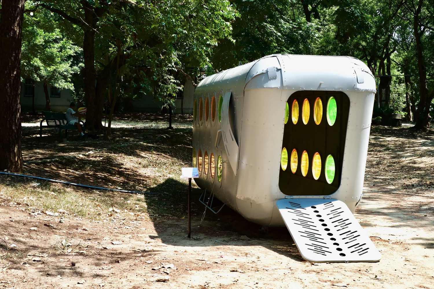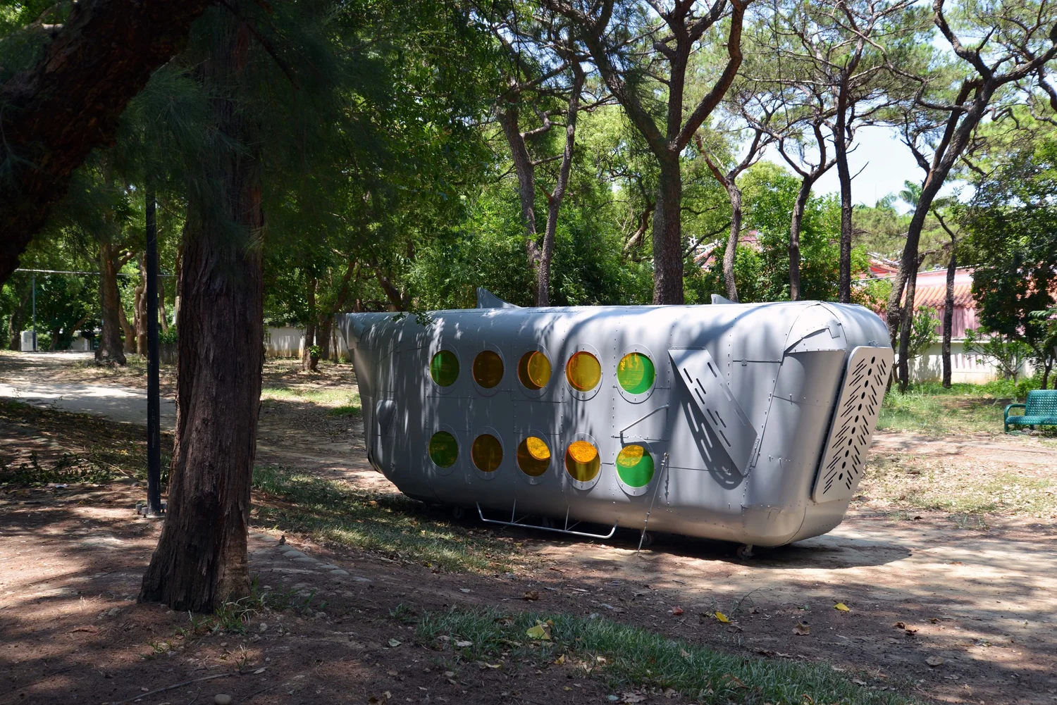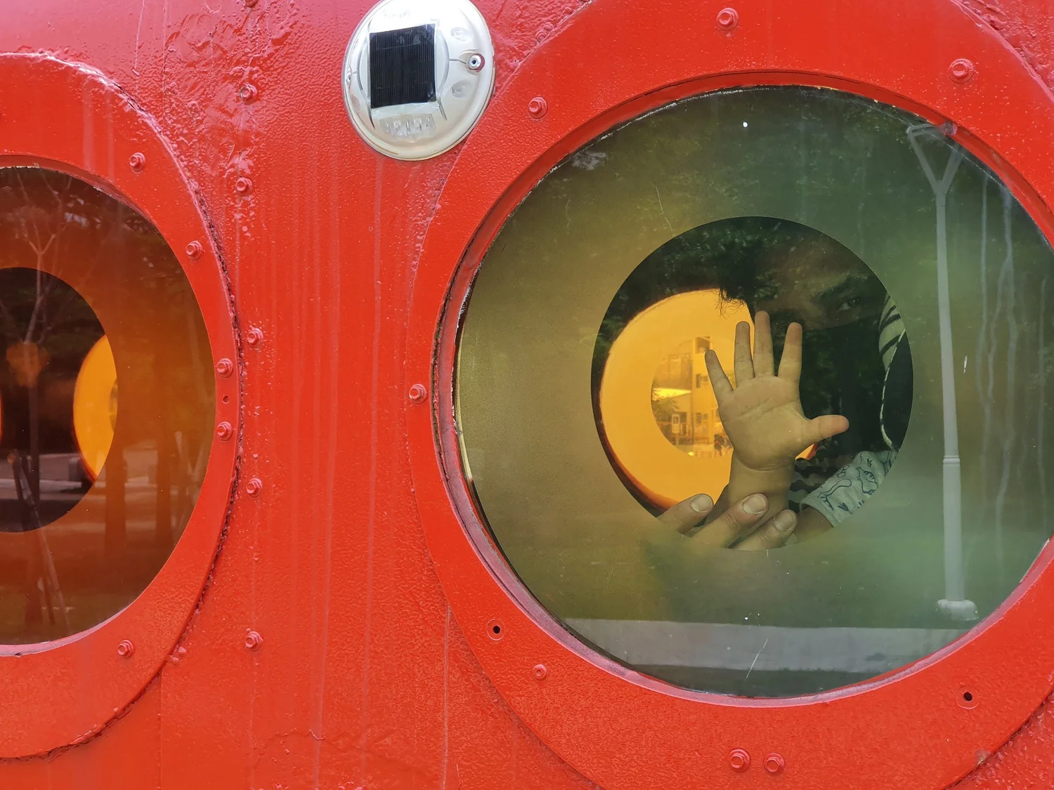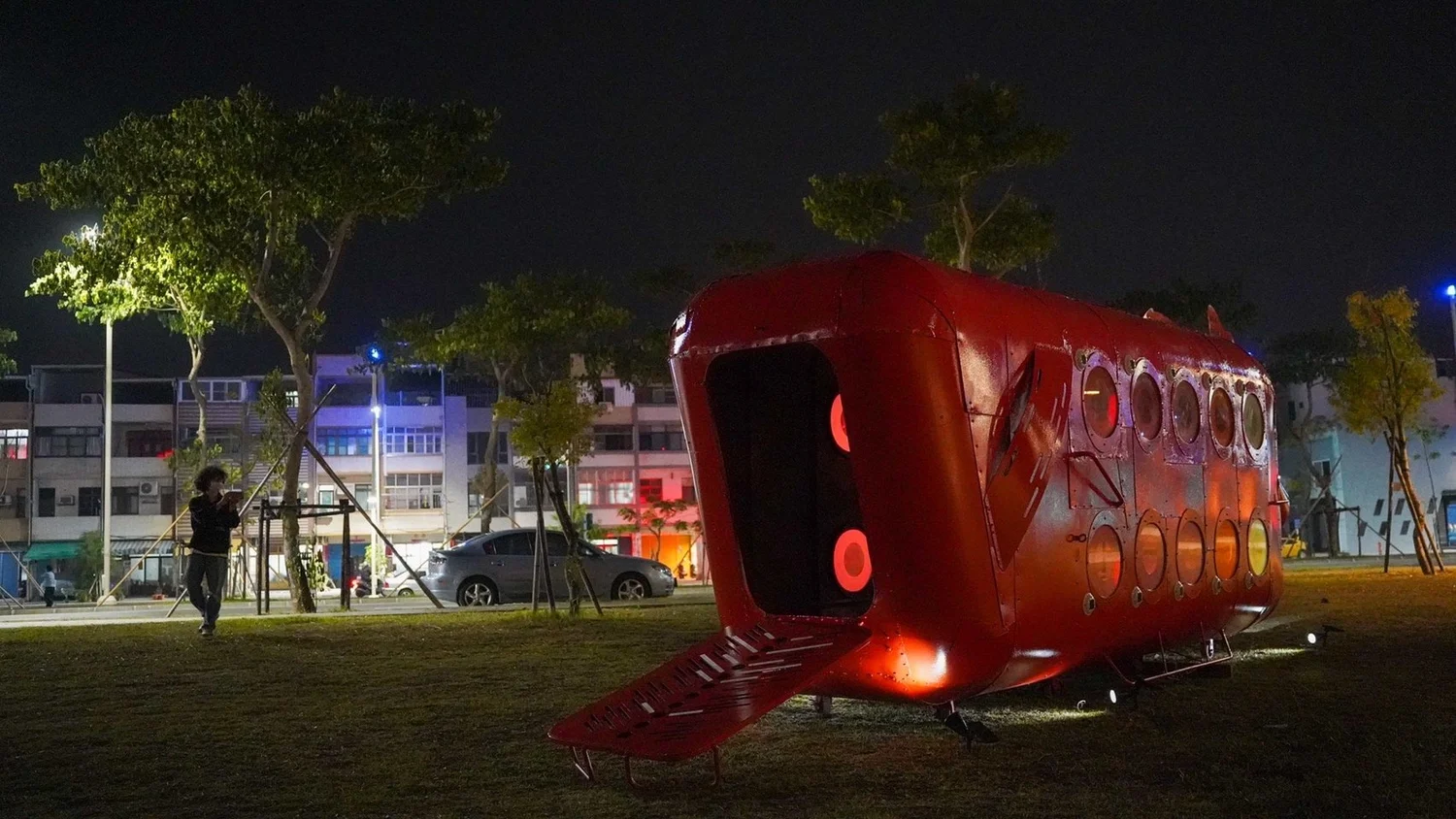 打造穿梭時光的精神載具。提供由內和由外觀看皆不同的光影風景給觀者,外觀像是能濳入深海、飛行太空、遊歷異世界的機器,穿戴著奇異的想像空間。能將前方艙門打開進入內部暗空間觀看光影,也能從外部彩色圓窗看到內部,內部為橋梁般的木製空間,可讓視線延伸到艙尾再到艙外,進入屬於自己私密恢弘的想像領域。