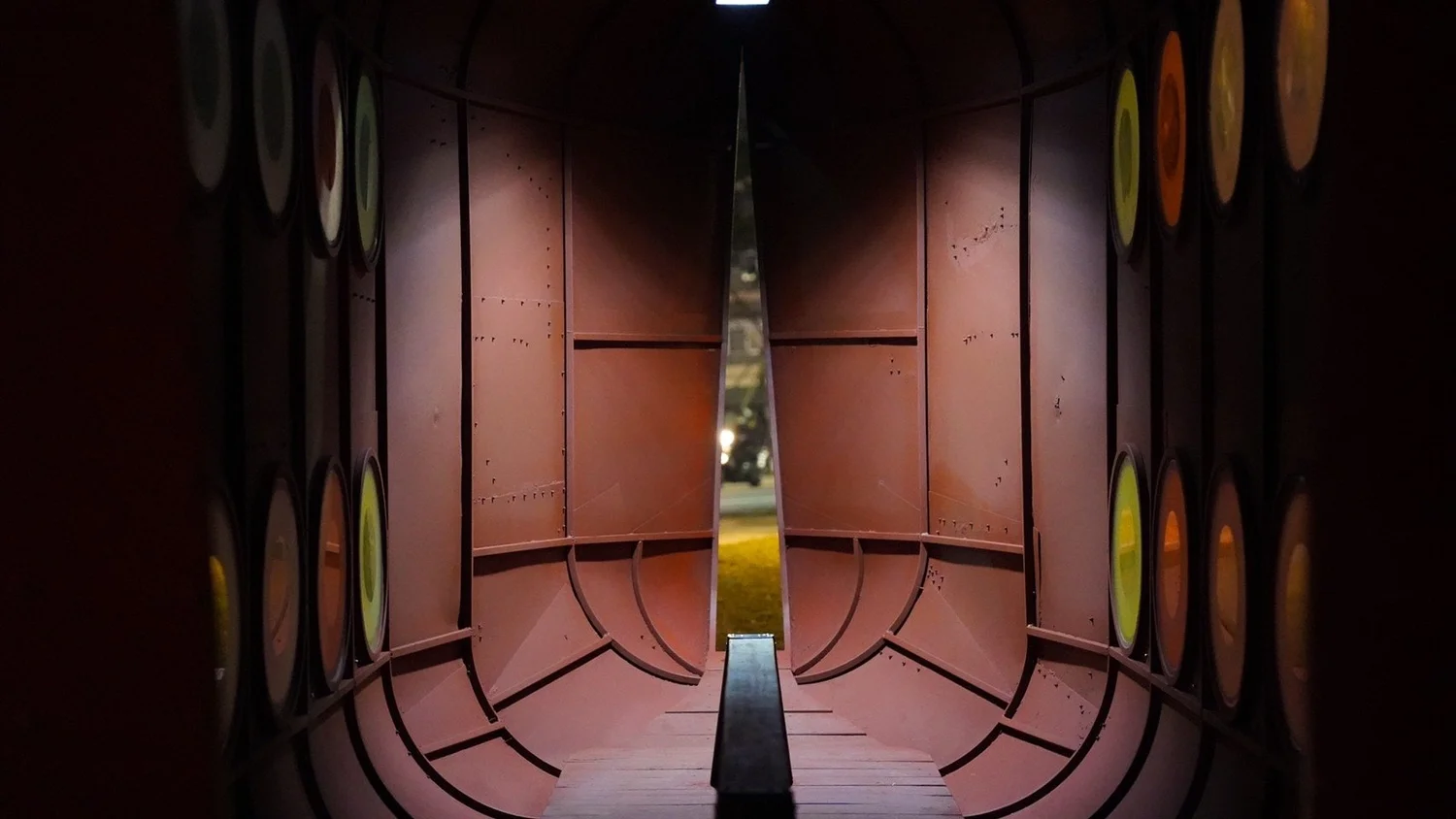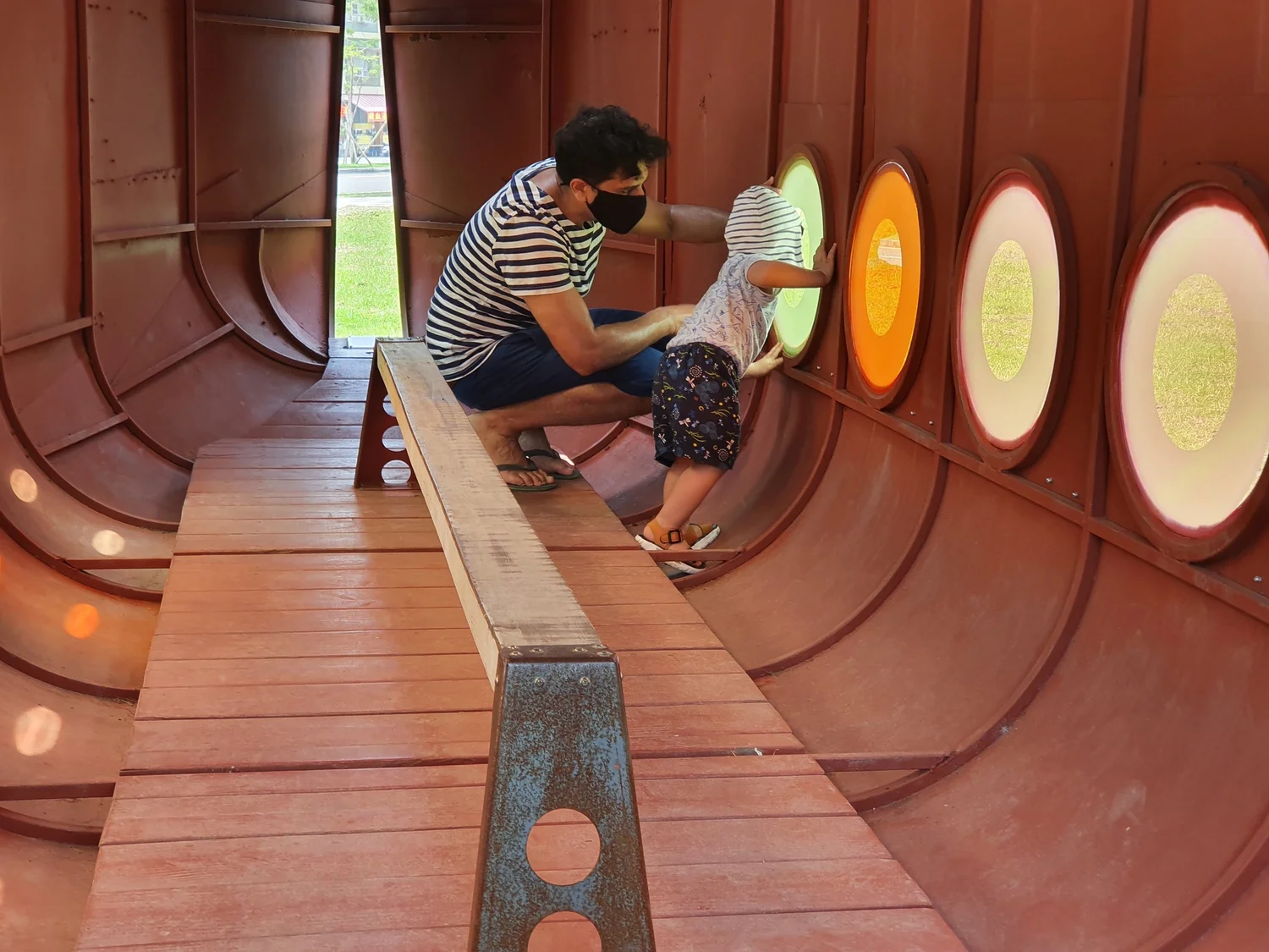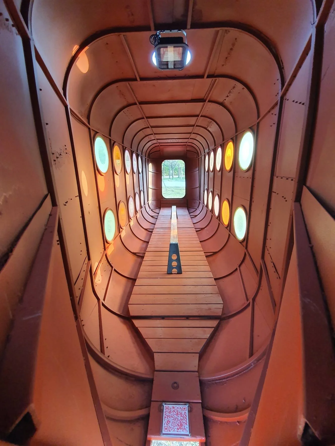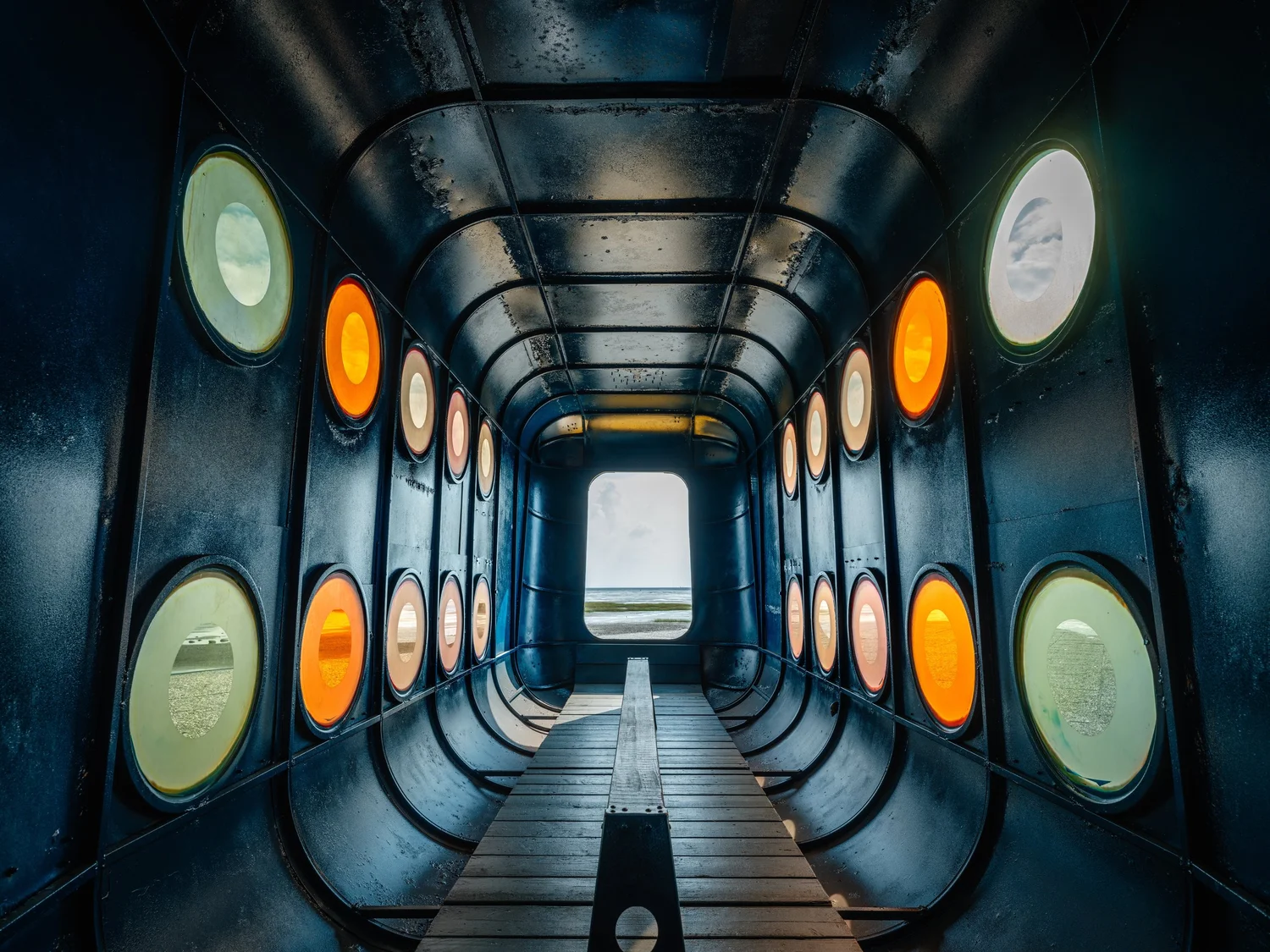 打造穿梭時光的精神載具。提供由內和由外觀看皆不同的光影風景給觀者,外觀像是能濳入深海、飛行太空、遊歷異世界的機器,穿戴著奇異的想像空間。能將前方艙門打開進入內部暗空間觀看光影,也能從外部彩色圓窗看到內部,內部為橋梁般的木製空間,可讓視線延伸到艙尾再到艙外,進入屬於自己私密恢弘的想像領域。