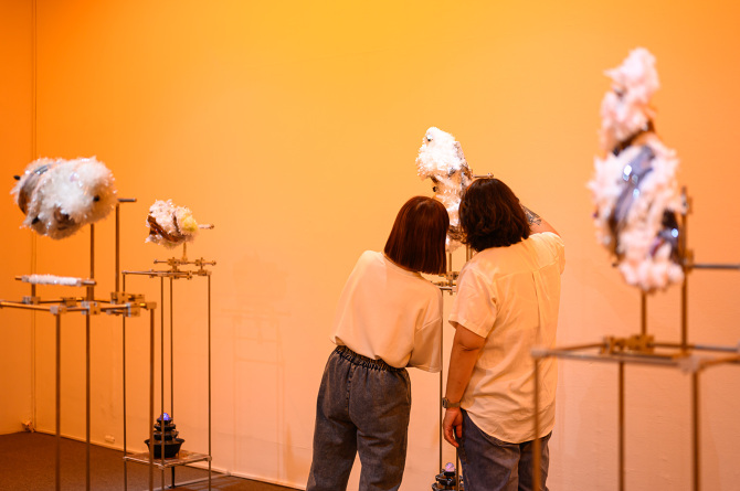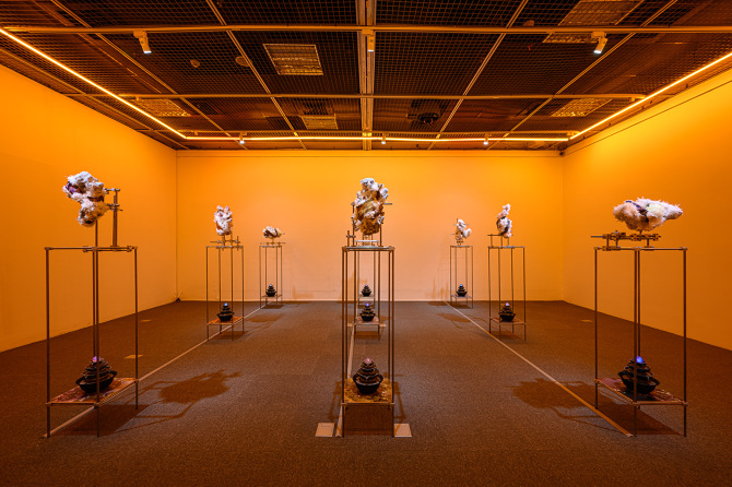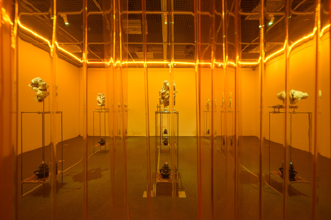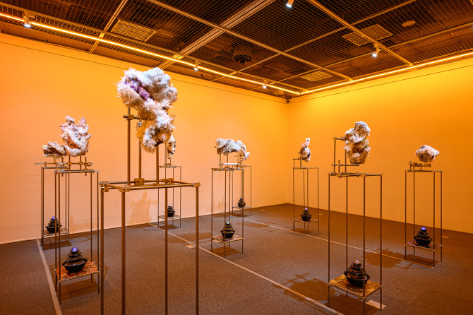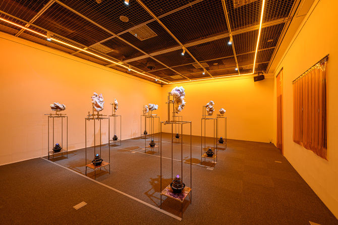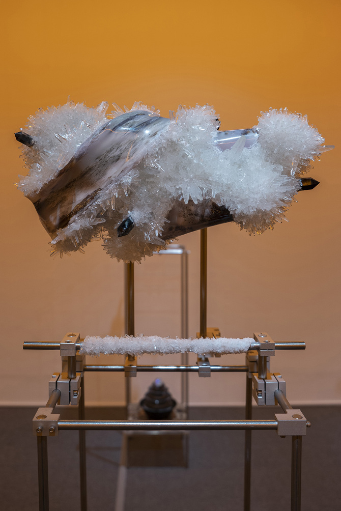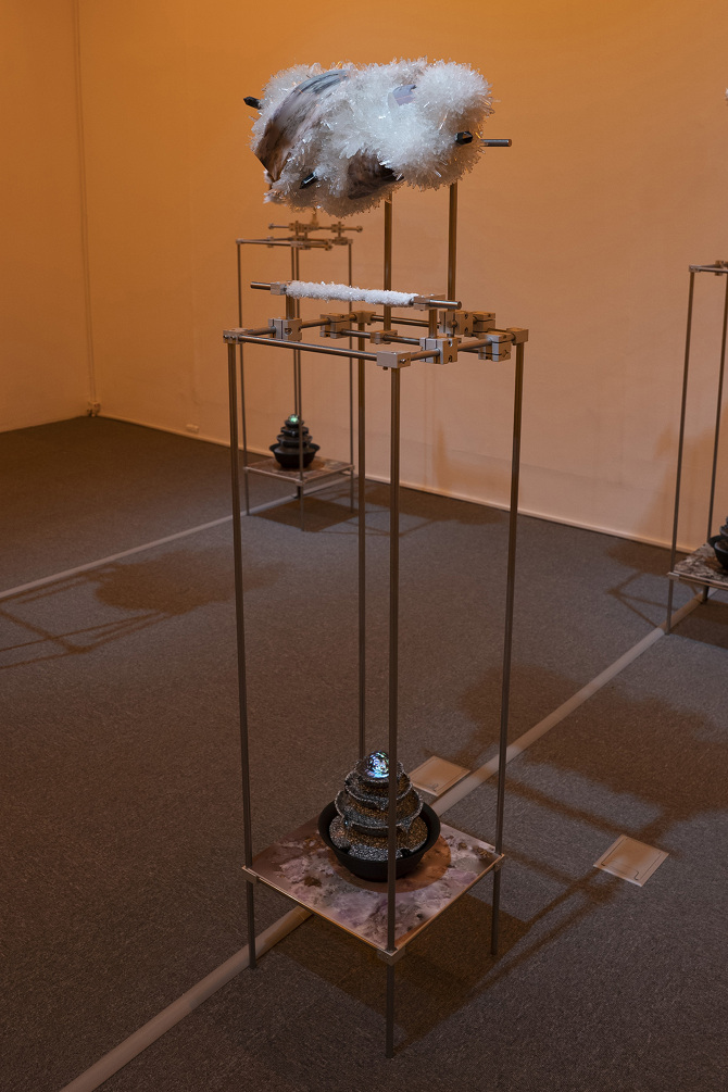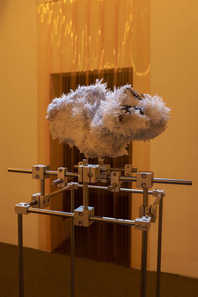 我想將這種象徵與隱喻的方式將能量轉檔概念帶入雕塑裡,透過輸出水晶礦石的模型與材質,成為雕塑的素材,製作晶體,和展場的聲音、味道,塑造在一種能量可以被感知的空間。