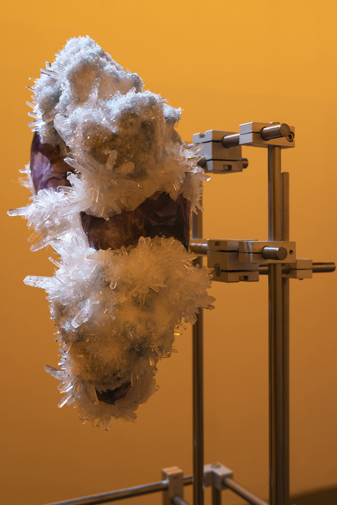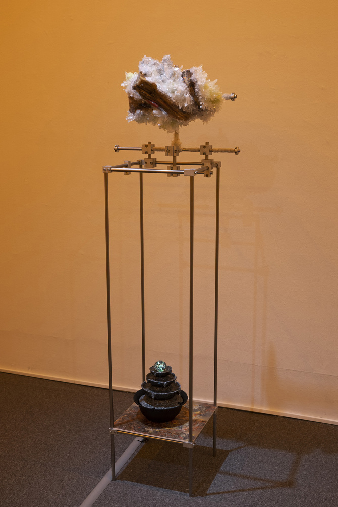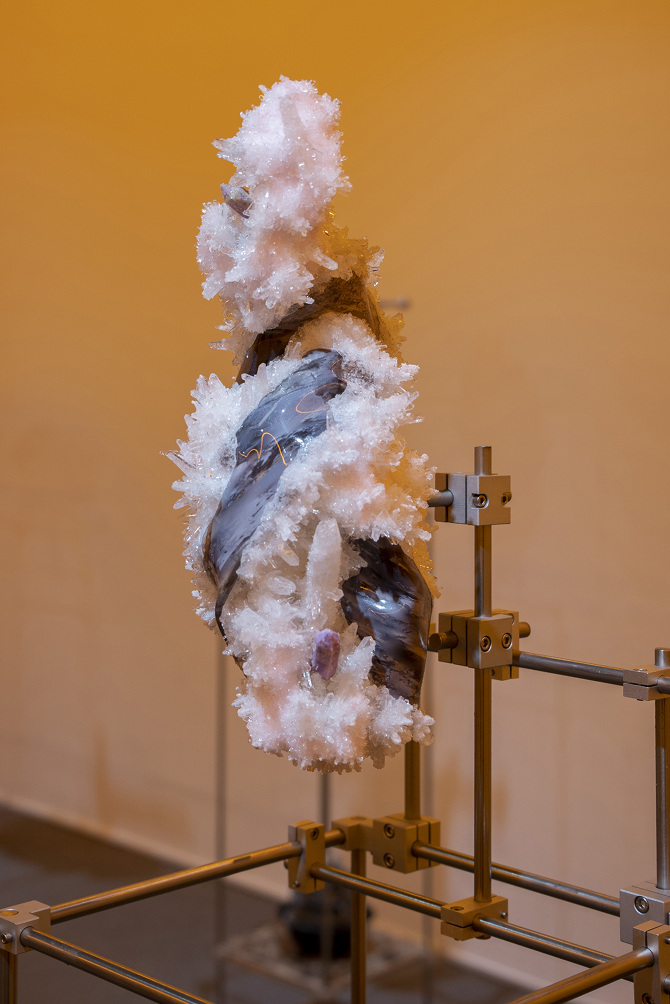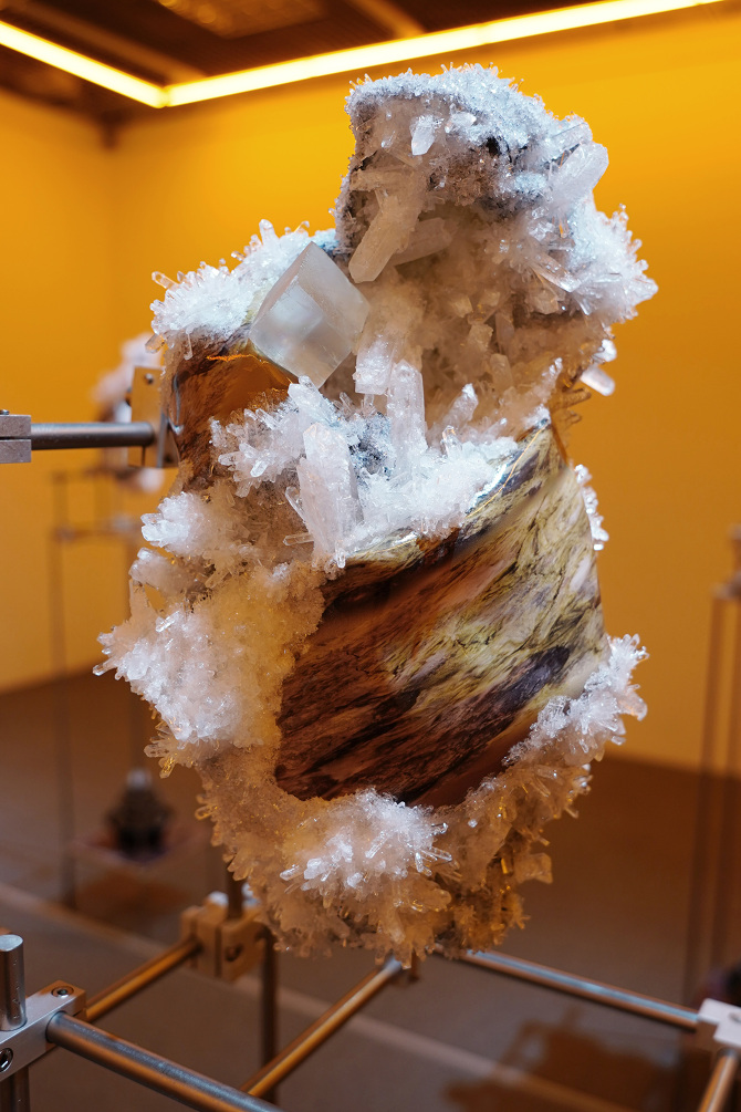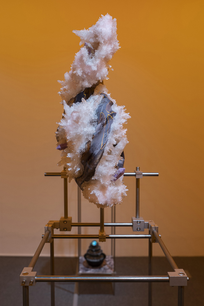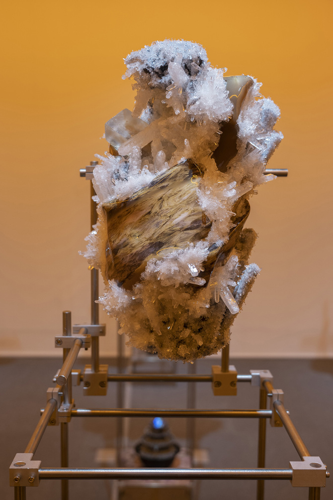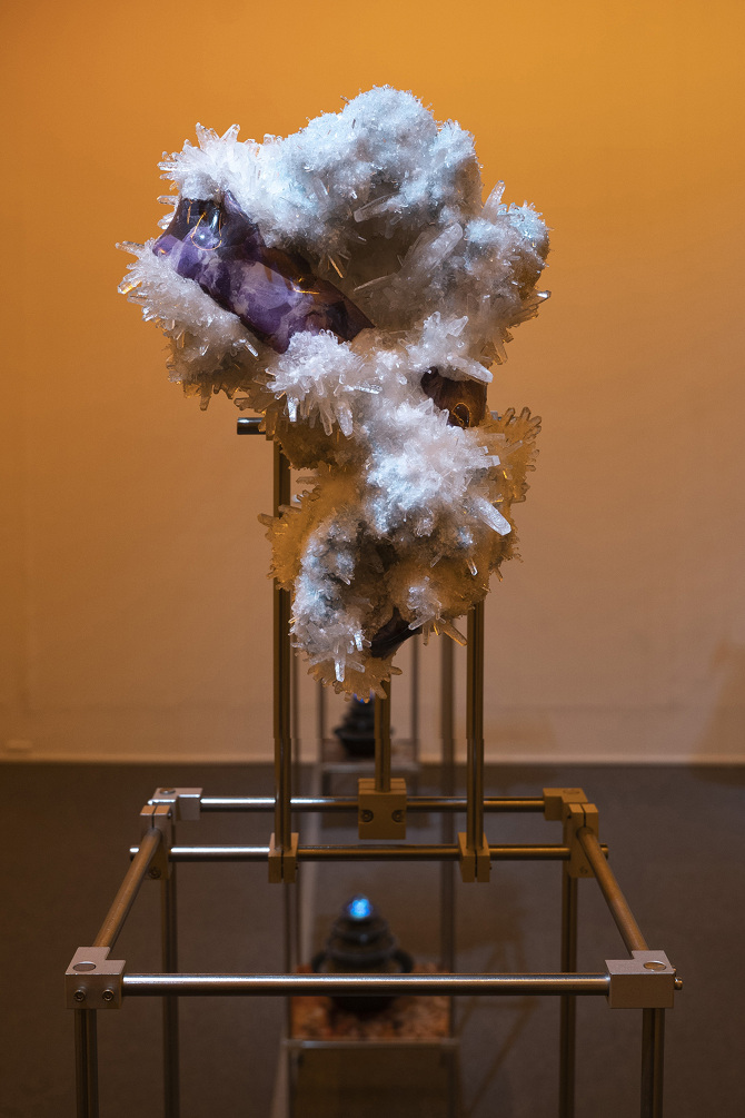 透過3D掃描水晶、礦石檔案拆解出了網格(Mesh)以及材質(Texture),這就像是把掃描對象拆解成模與膜的狀態,如果用一種隱喻和象徵的方式來說,也可以說是把水晶、礦石這種壓力與熱能的產物與某些文化中被視為一種不可見但可感知的能量,透過掃描技術掃描將水晶、礦石轉檔了成為數位模式,這個步驟使掃描物的本質輪廓得到了解放,作為展開雕塑的方法。那水晶、礦石能量載體的部分呢?能否也能夠經過數位模式被轉檔列印出來呢?