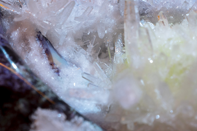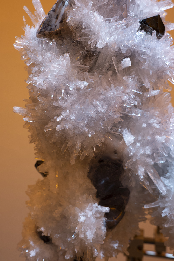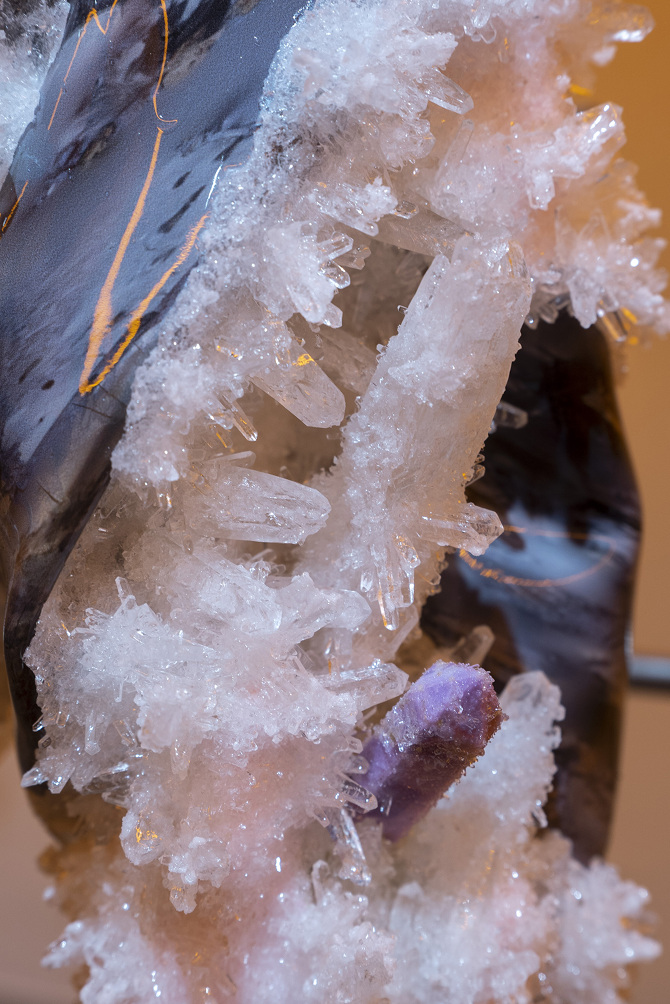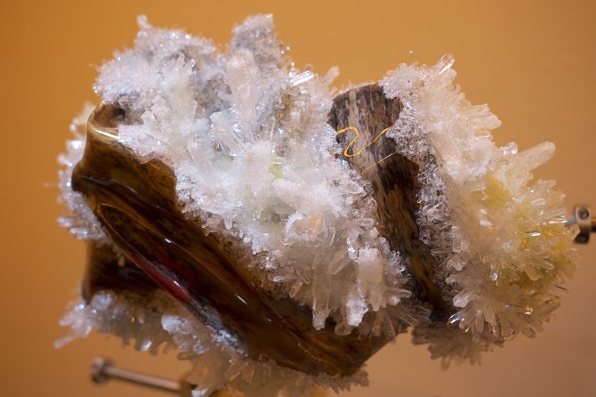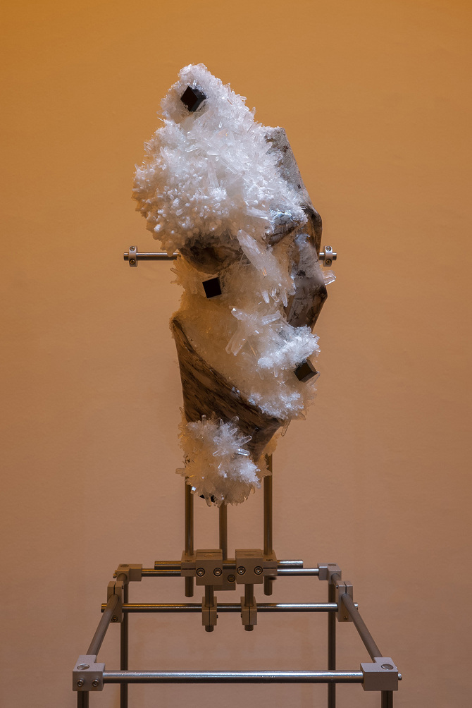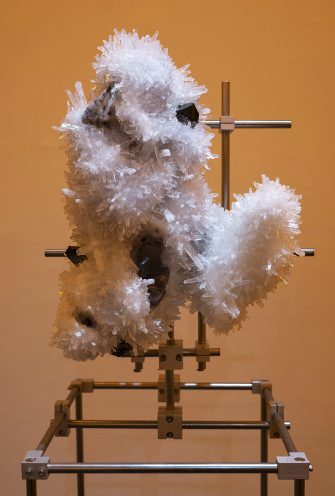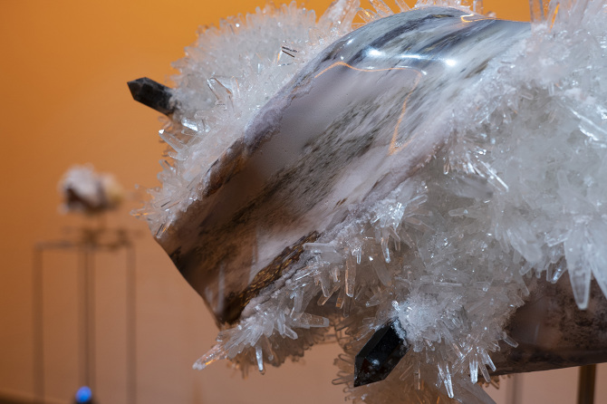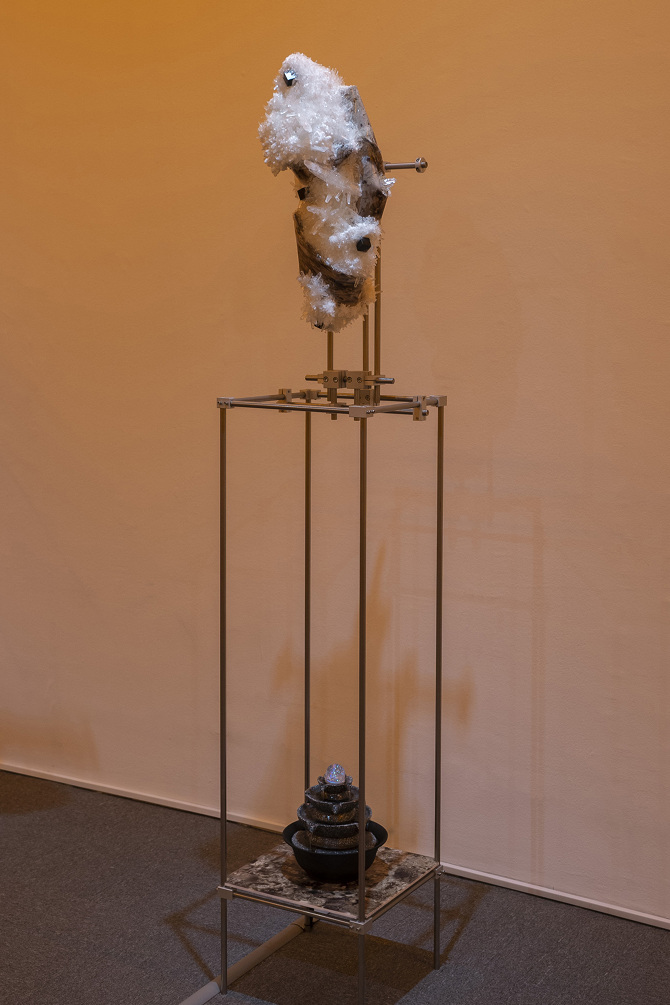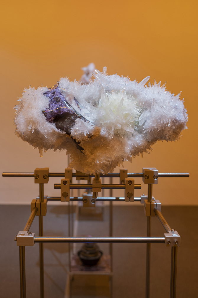 透過3D掃描水晶、礦石檔案拆解出了網格(Mesh)以及材質(Texture),這就像是把掃描對象拆解成模與膜的狀態,如果用一種隱喻和象徵的方式來說,也可以說是把水晶、礦石這種壓力與熱能的產物與某些文化中被視為一種不可見但可感知的能量,透過掃描技術掃描將水晶、礦石轉檔了成為數位模式,這個步驟使掃描物的本質輪廓得到了解放,作為展開雕塑的方法。那水晶、礦石能量載體的部分呢?能否也能夠經過數位模式被轉檔列印出來呢?