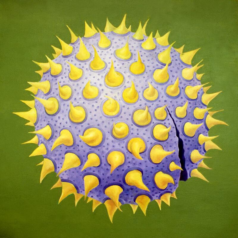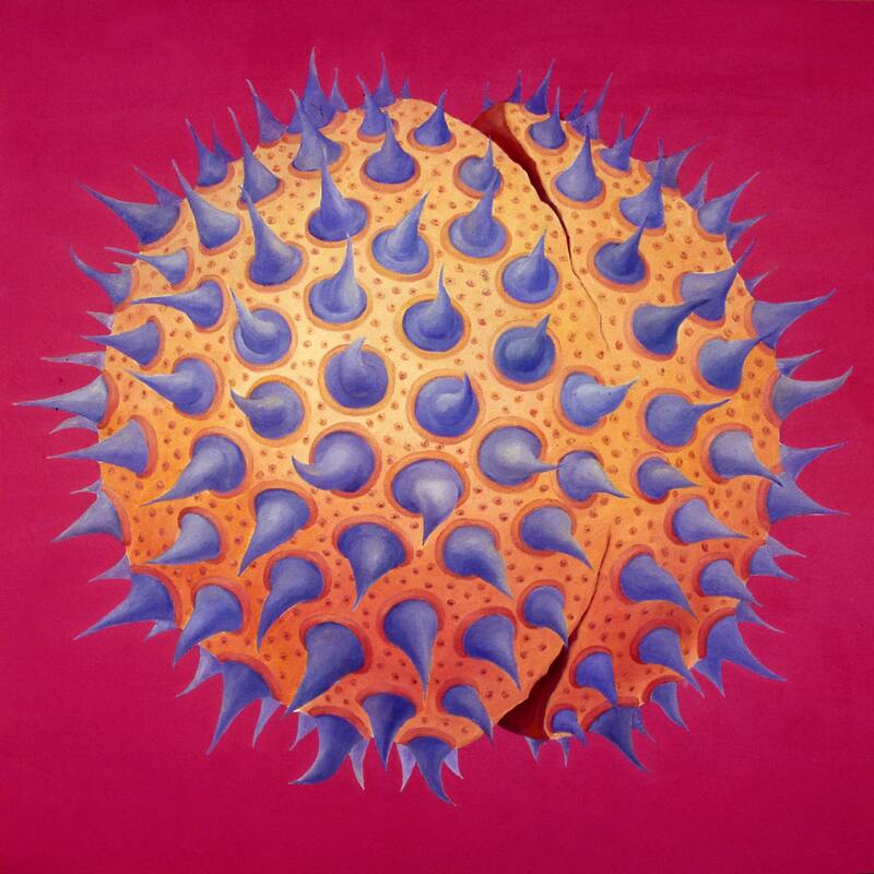 以具太陽光芒般的尖刺和鮮艷色彩之硬殼的樣貌,來再現女性追求成長並擺脫父權價值的控制下仍重視外表而勝於內在的狀態。對於我而言,這樣帶有尖刺的外殼暗示著女性正處於挑戰的狀態。由於尚未具備足夠的信心和能力去面對所處之以男性為主導的社會,所以在刻意又不自覺中,她的外在以如此的美麗女強人之姿態出現。然而,在其身體內,有一個本已存在但一直被忽視的女性空間「chora」。「chora」是一個屬於女性力量來源的潛意識之地。我認為,女性若想要發現與發展這樣屬於自己系統的力量,就需經歷一連串的痛,而如此的經驗我把它記錄在作品「裂痕」之中。