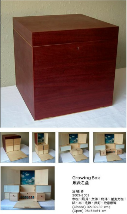 經過一段日子的累積,重新回頭檢視自己前一段的母職經驗、小孩的成長與其留下來的物品及記錄,每每都覺得如獲至寶。因為,每一物品都蘊含了我對我兒子的關愛,每一段文字都透露我歡樂悲傷的真實感受,每一張照片都隱藏著許多五味雜陳的故事。這樣重要的經驗與努力的過程都無法讓我被 “偉大的母親” 這類簡單的話來漠視過或遺忘。因此,我想要將它依不同的時間慎重地收藏在有積木外形的盒子中。這些我自己設計有如積木的盒子,將會以不同形式來收藏我的寶物。當它們閉合時,我可以用不同觀點重新建構它,就如同我們堆砌積木而創造出不同的結構。當它展開時,它就像博物館般展示我的收藏,讓我及我的觀眾細細品味每個細節。