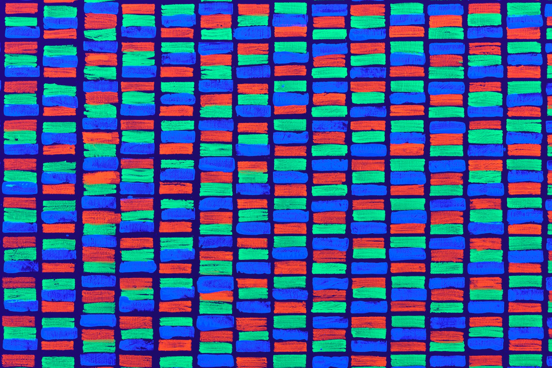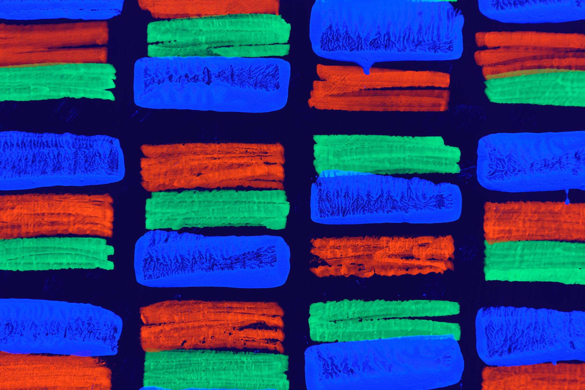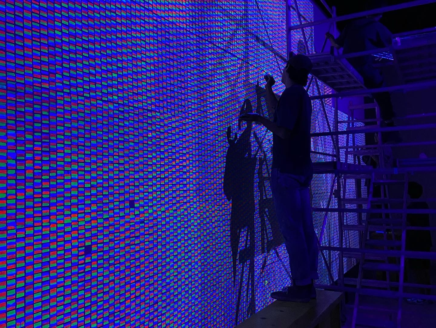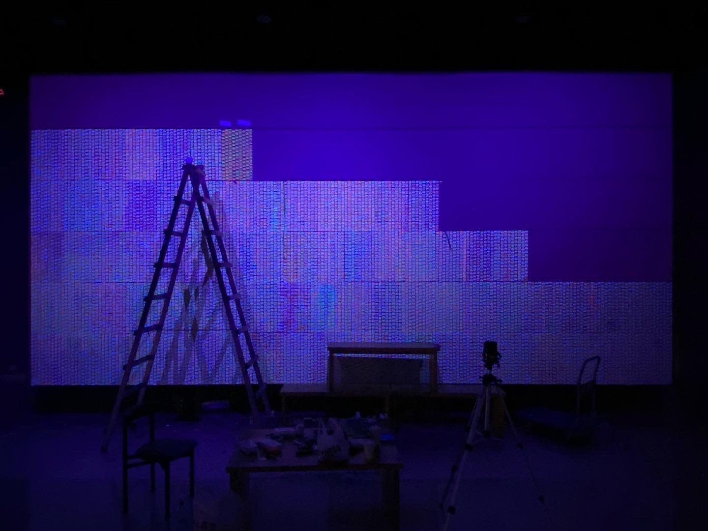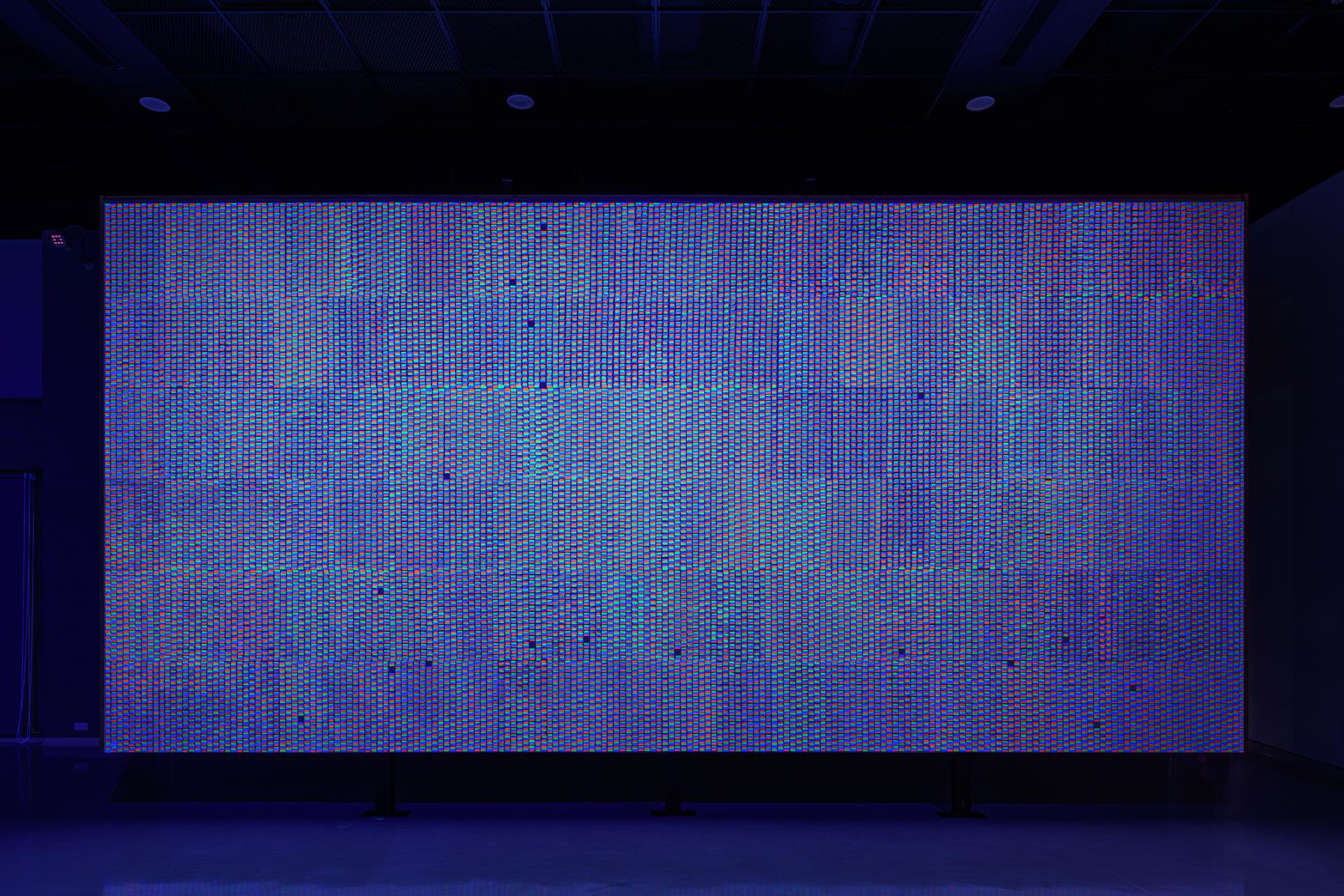 《星叢》以滑鼠點選空白網頁的任何一點,解離構成螢幕上白色,任三張與 #red #green #blue 標記有關的實時資料圖片,從點到點之間,取樣白色的色彩構成與(偏頗而隨機的)意義拼貼。《像素與星叢》耗費眾人之力,在藝文中心現有的牆面上,以螢光筆螢光漆,規矩地點描屏幕成像的規律與秩序,完成了將近16000多的像素所組成的空白畫面。以無數螢光三色RGB 光點,點描數位影像屏幕中「趨近白色」的身體。