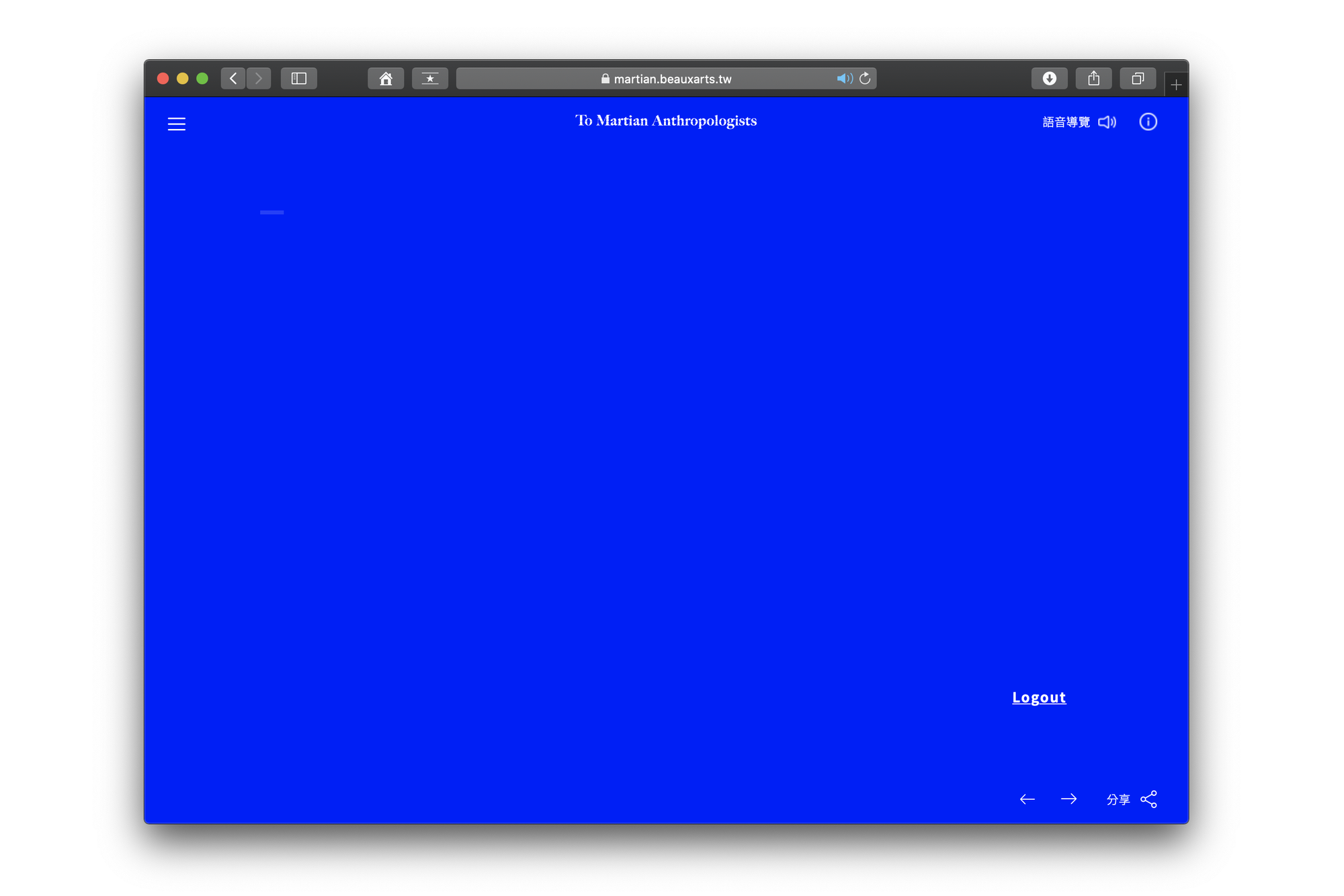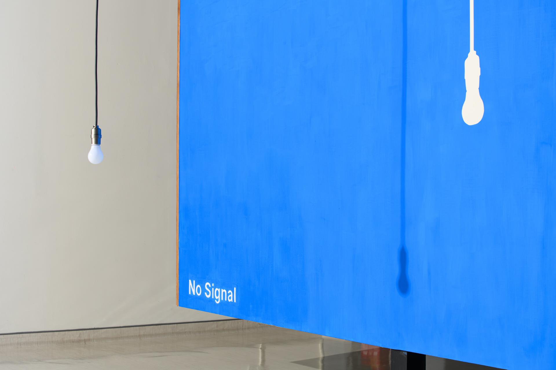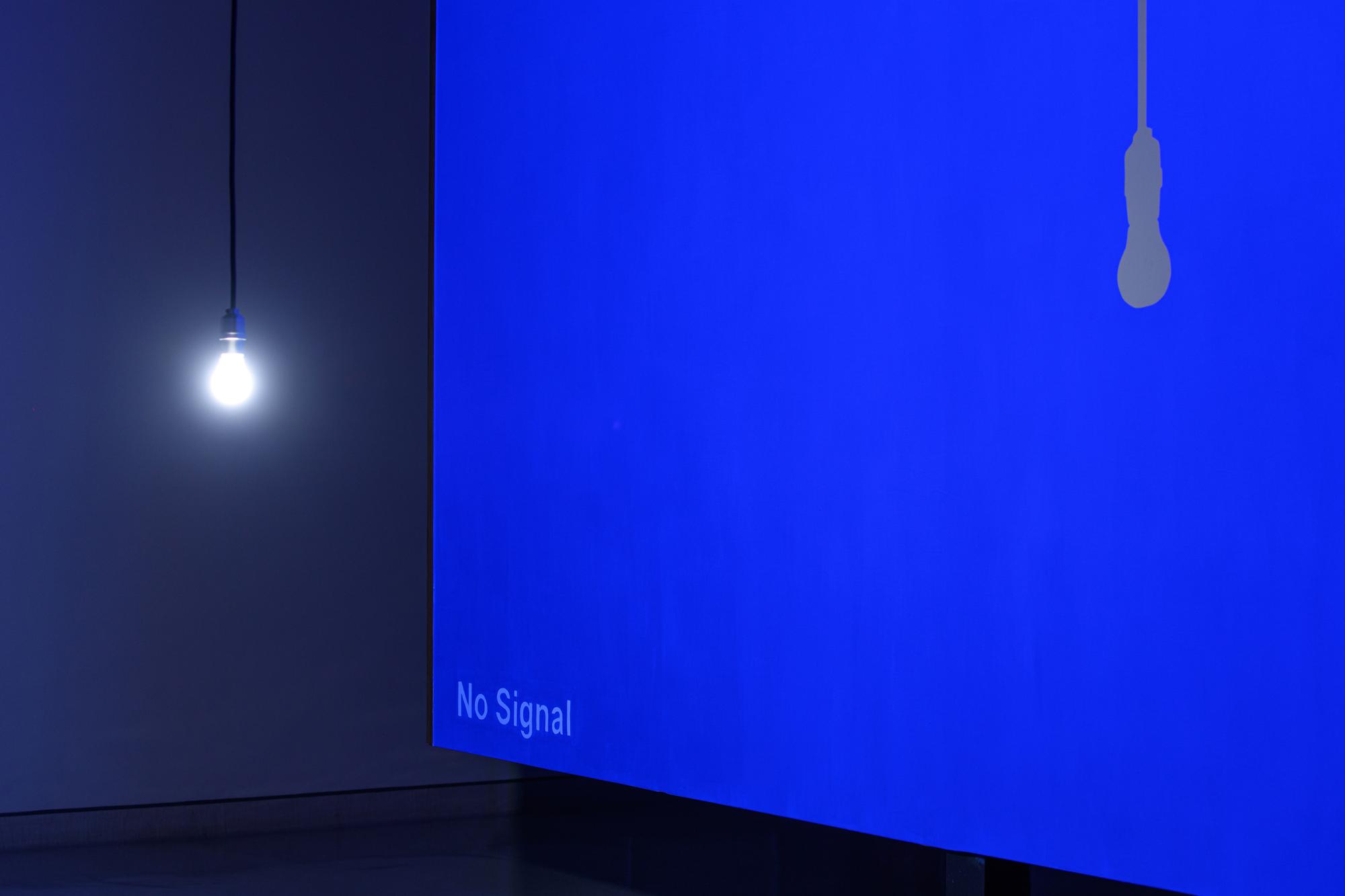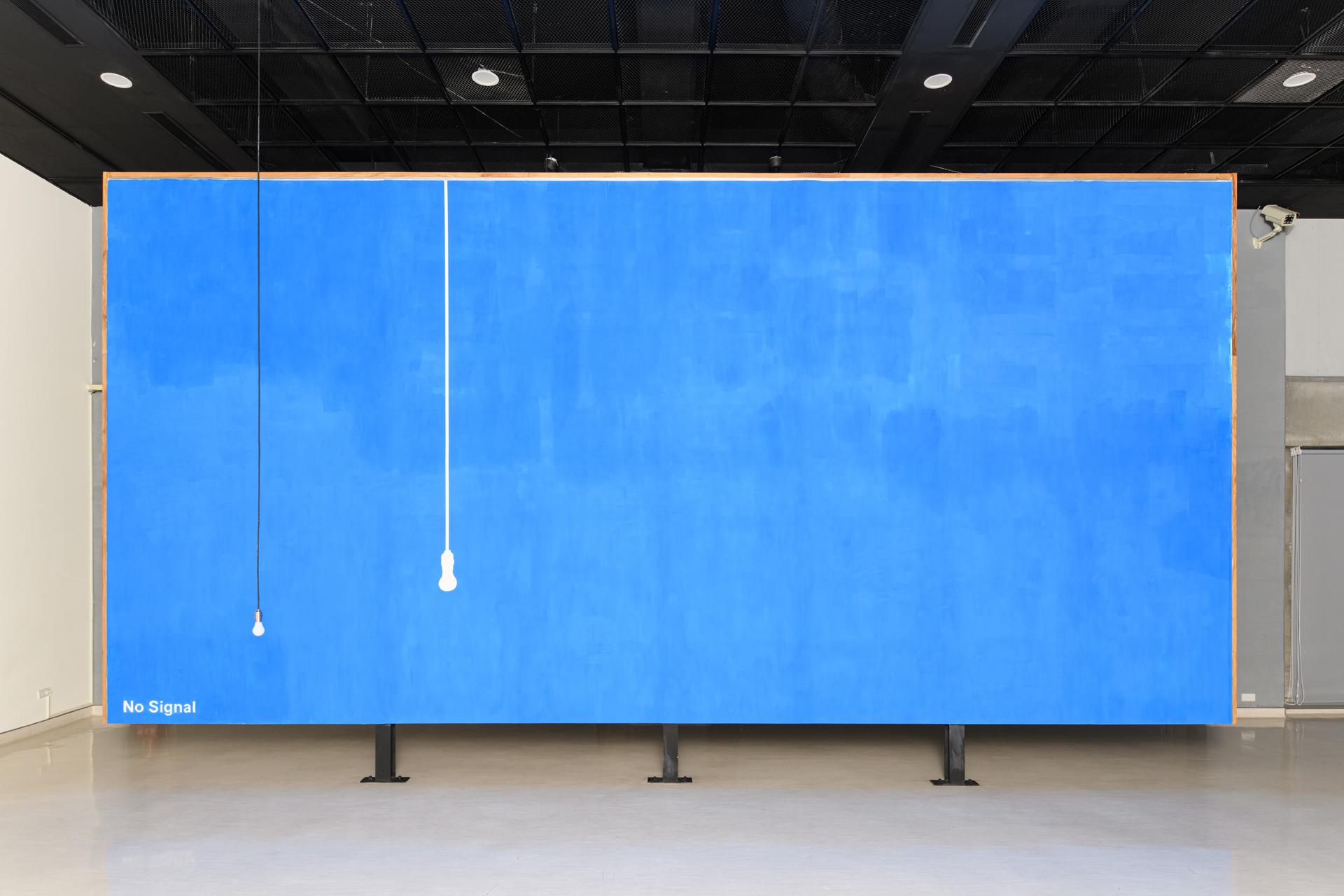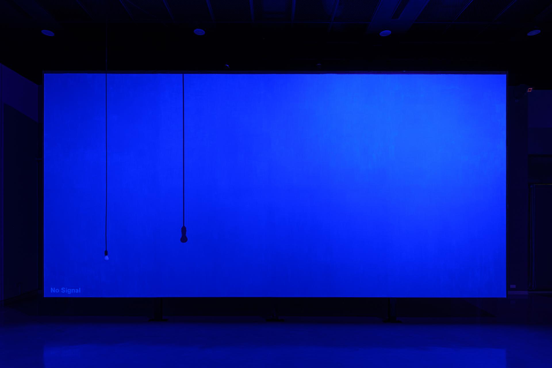 展場中看似發光的屏幕,《校準:藍幕》以螢光漆模擬投影機的失訊影像,製造因物件遮擋而投影在牆上的輪廓與陰影,辯證實體與存在的對位關係。《藍幕》的網路作品為一個實時的登入網頁,當有人在線上登入時,展場作品的燈泡會即時切換明滅,現實中以螢光漆模擬的影像畫面來回往復在機器影像與材質的實體之間,切換線上與線下的觀點。