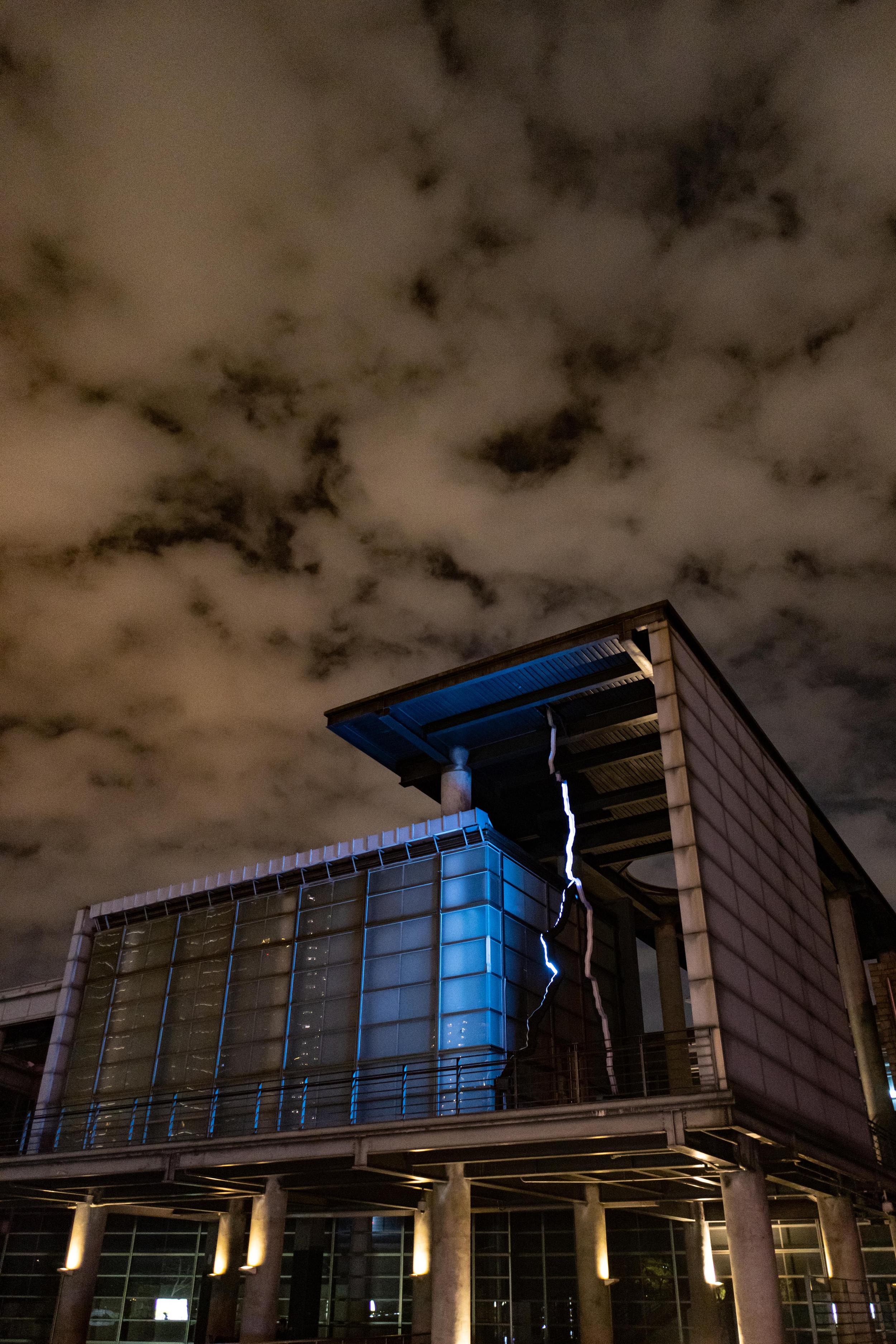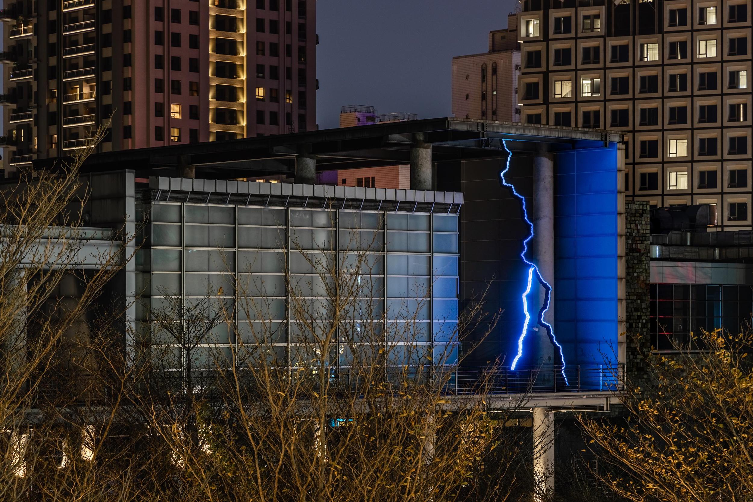電作為 21 世紀生活的基礎能源,往往是隱形而不可見的。我們想像著在 20世紀以前,人類的眼睛如何目擊這個大自然的龐大能量——雷電,而一百年後,在電力設備成為一座城市文明最基本的基礎建設時,我們又如何看待人造光與夜晚所帶來的改變?〈高壓電〉隱匿於巨大的黑暗之中,以突如其來的閃現,在文明進步或災難將至的預兆之間,重新思考自然與光的關聯。
