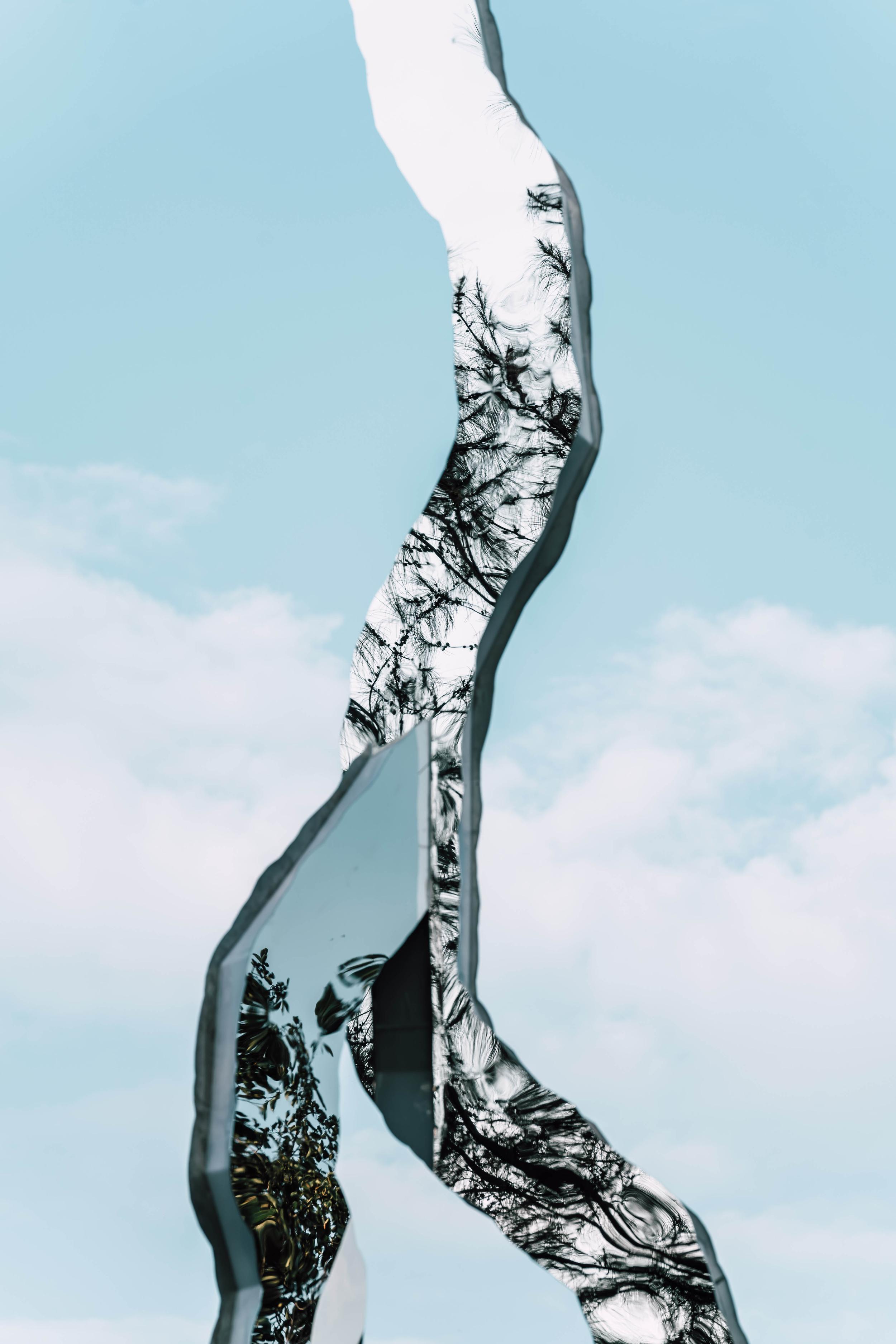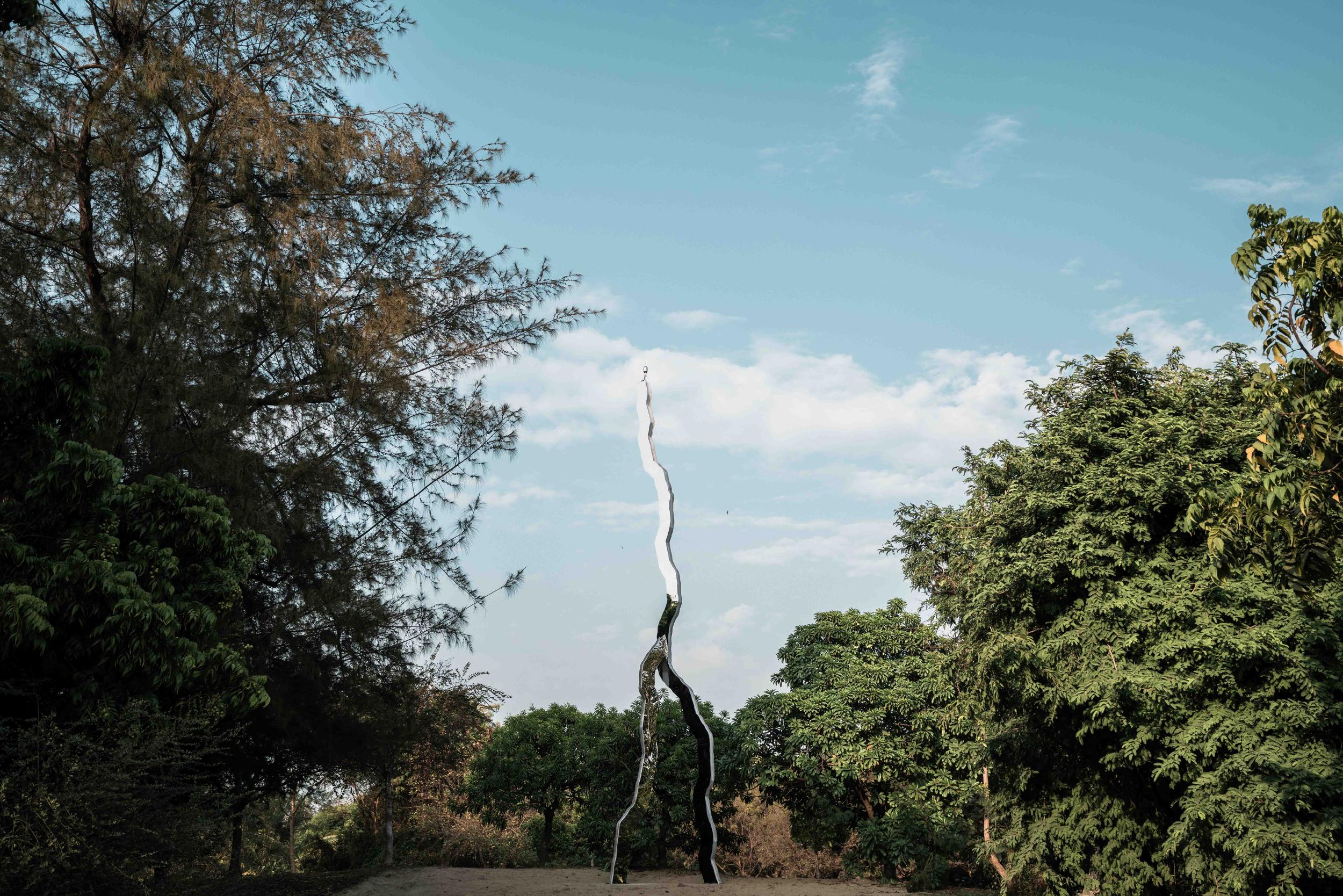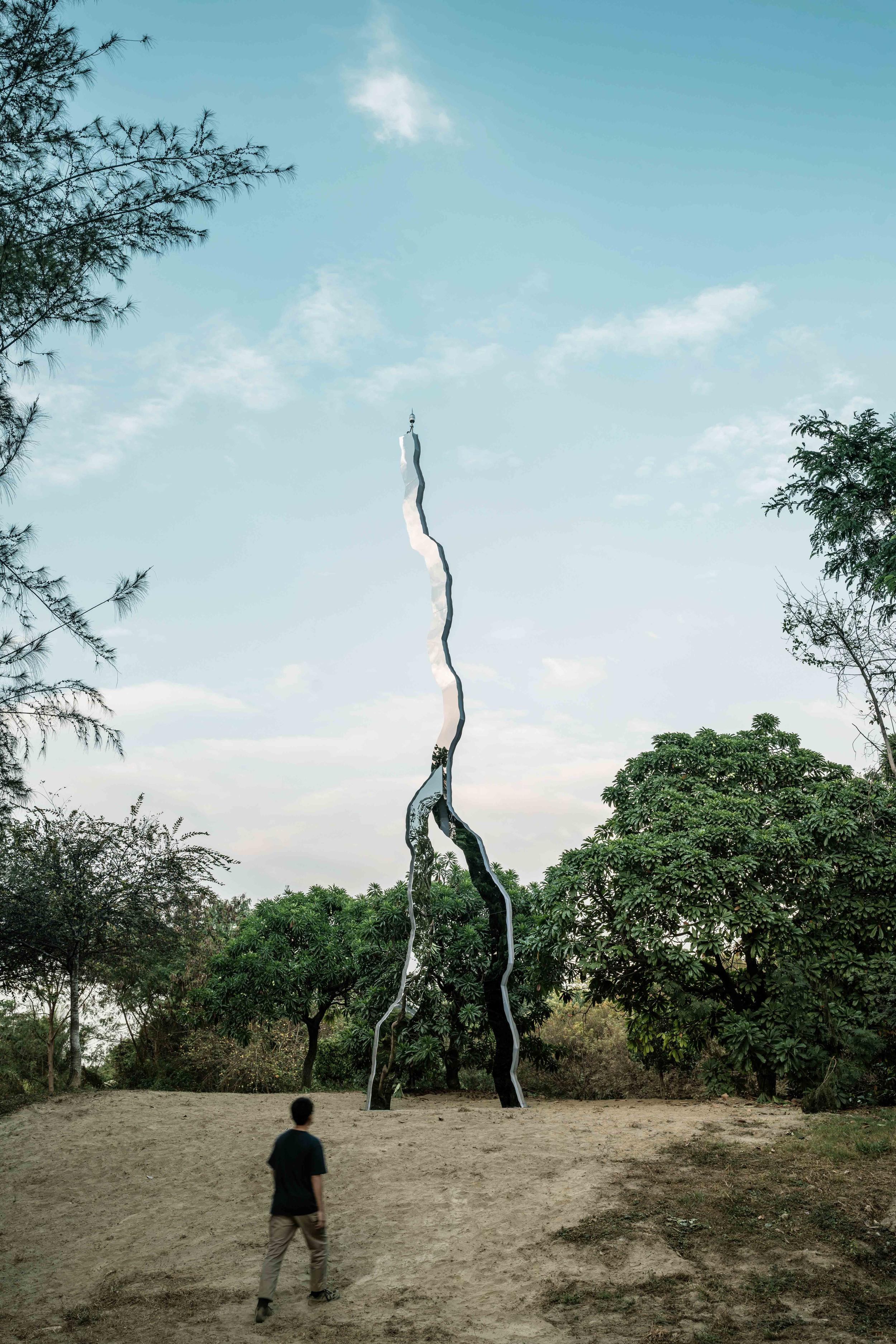《高壓電》以鏡面鋼板及LED燈條側向發光之結構設計,除了最輕化造型所帶來的壓迫量體外,也在日間與夜間的觀看中提供了兩種視覺體驗。在白天時,主結構的鏡面鋼板反映了作品周圍自然景觀,使作品的巨大量體融合於空間之中,觀者在作品其間穿梭,能映照出周圍不同切面,呈現猶如維度交疊的錯視效果。待入夜間,鏡面鋼板的存在量體隱沒於黑暗中,剎時,由LED光軌所啟動的動態圖像,像似一道道強勁而未明的閃電,劃破了當下空間的表面,在觀者眼前呈現人造光貼合自然經驗的奇觀。