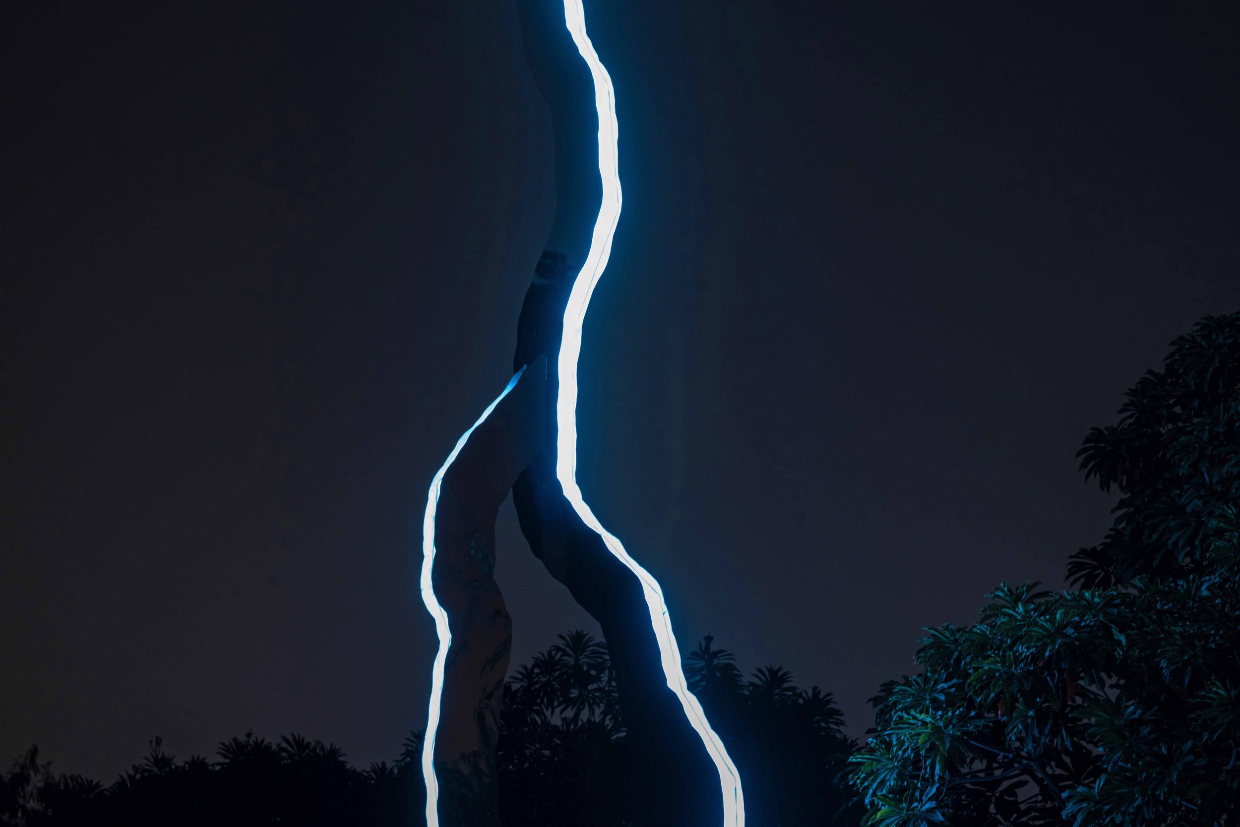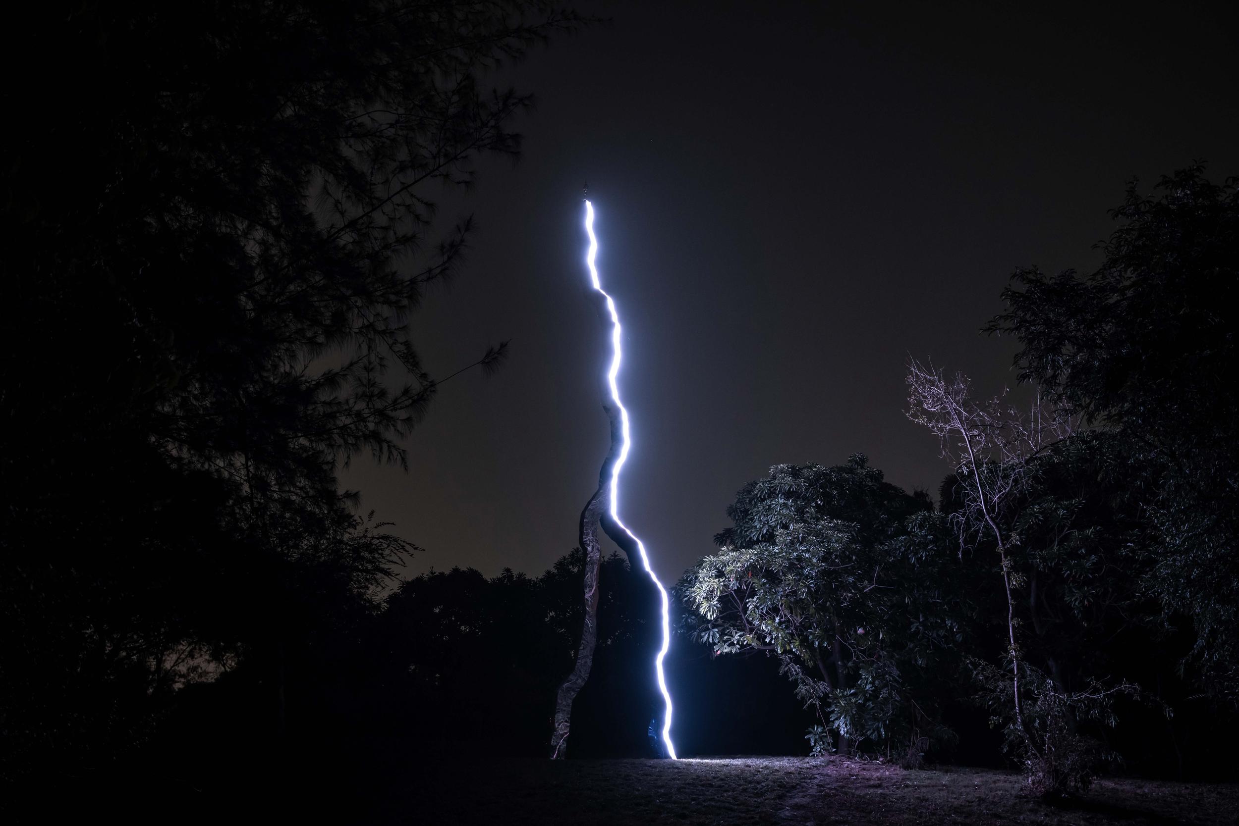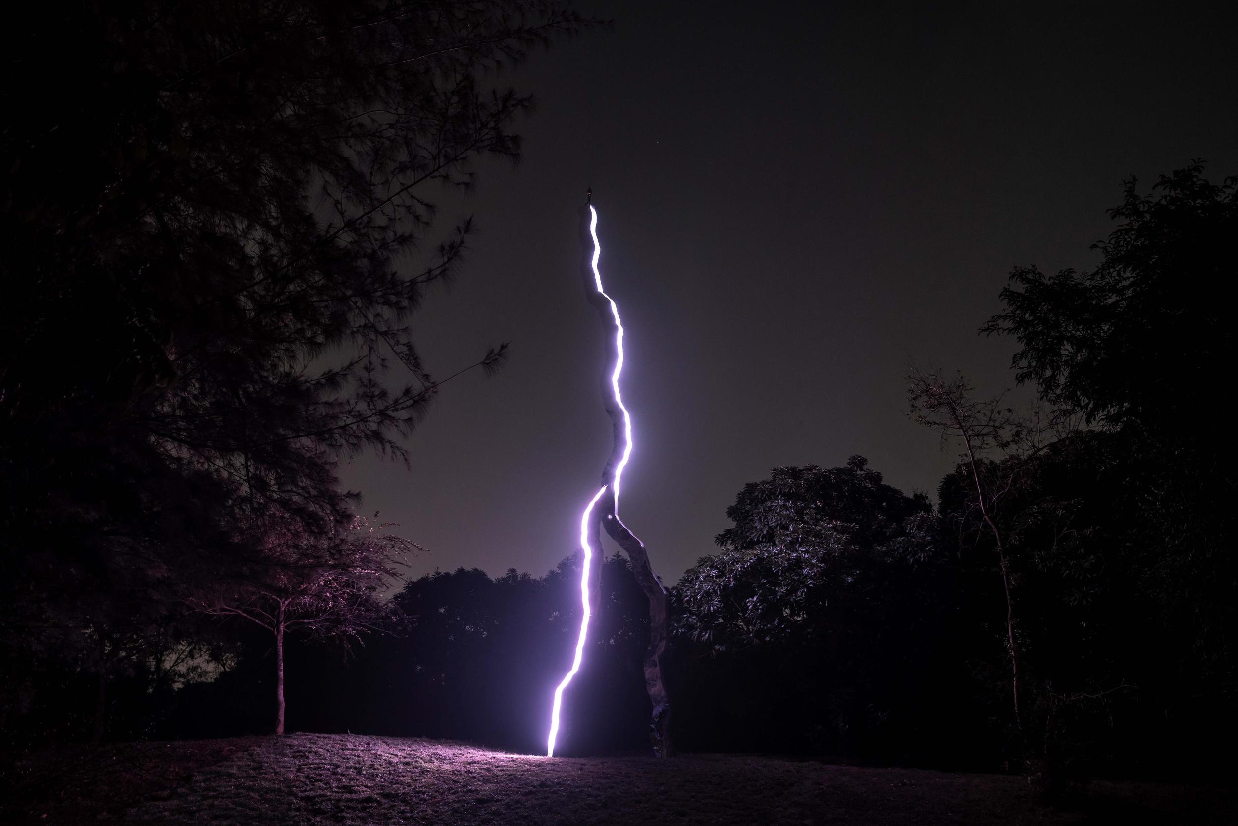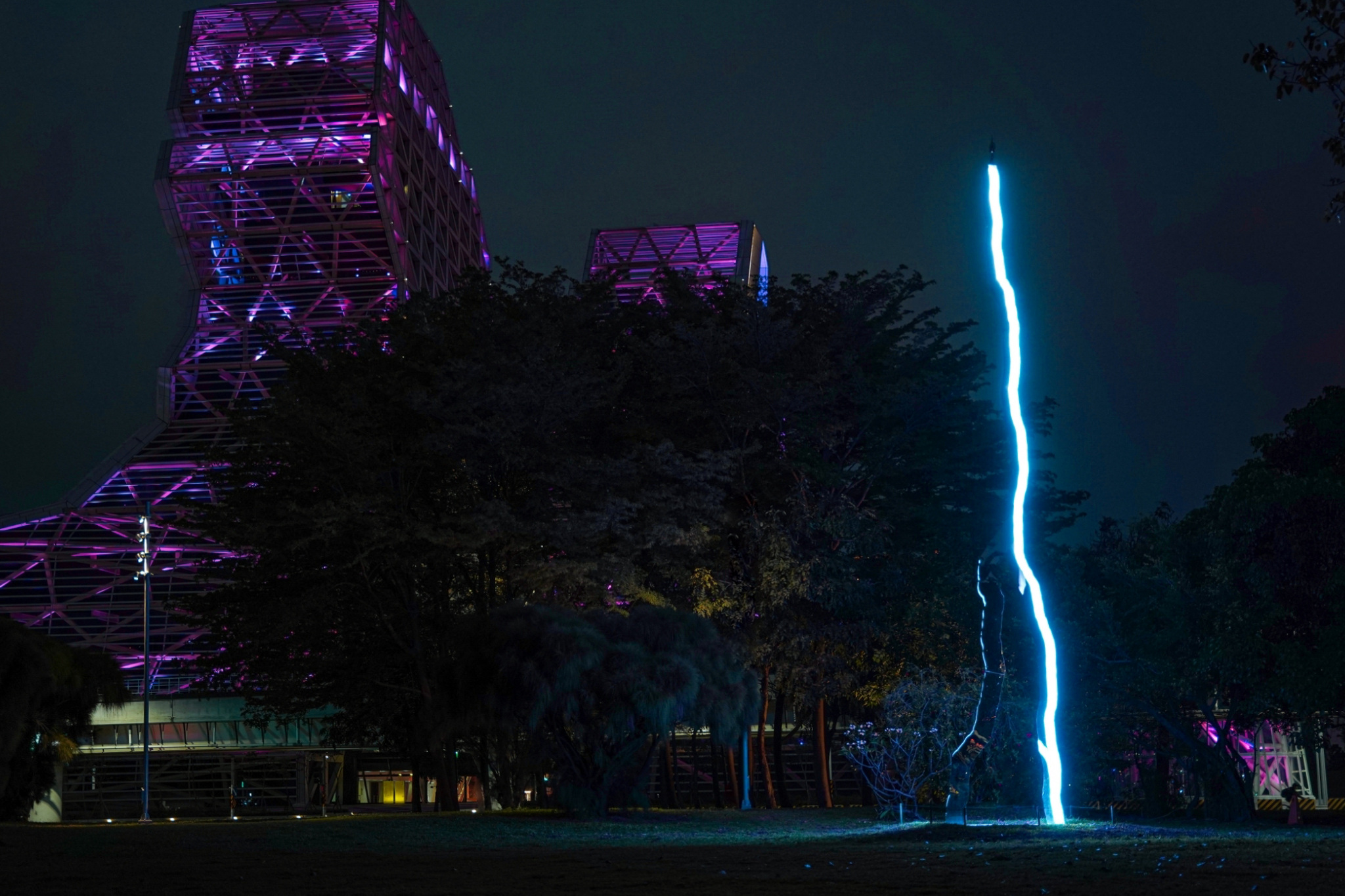 電作為 21 世紀生活的基礎能源,往往是隱形而不可見的。此創作計畫的初始,想像著20世紀以前,人類的眼睛如何目擊這個大自然的龐大能量——雷電,而一百年後,在電力設備成為一座城市文明最基本的基礎建設時,我們又如何看待人造光與夜晚所帶來的改變?《高壓電》以大自然中的雷電形象,回頭爬梳現代化電力百年來馴養電能的關係,呈現自然能量與人造電力之間的角力,除了直面「電」的奇觀,回看技術文明的提問與身體經驗外,此光雕塑的設置,也試圖反轉以往大型展會中光的節慶意涵,使觀者在進步與災厄的未明徵象之際,重新看待「光」所獨有的啟發經驗。