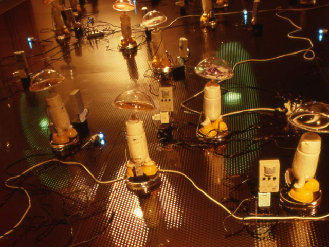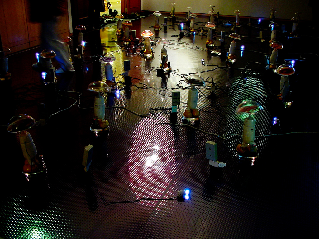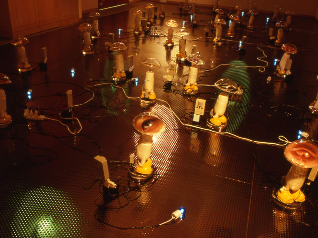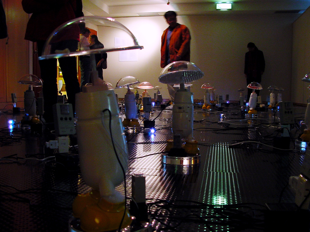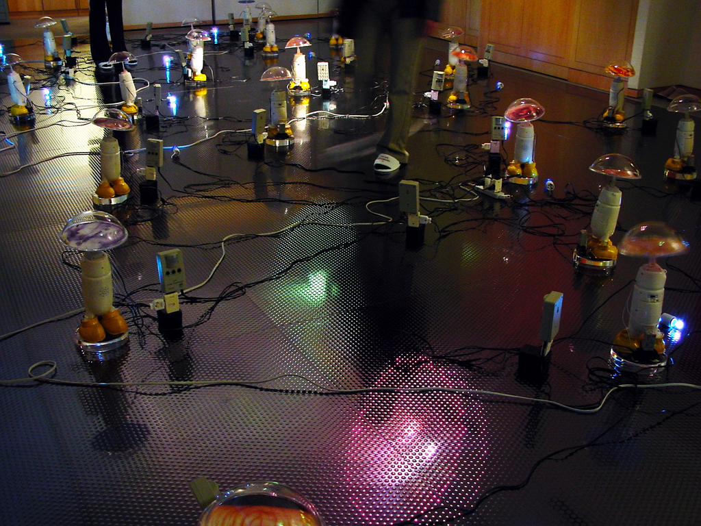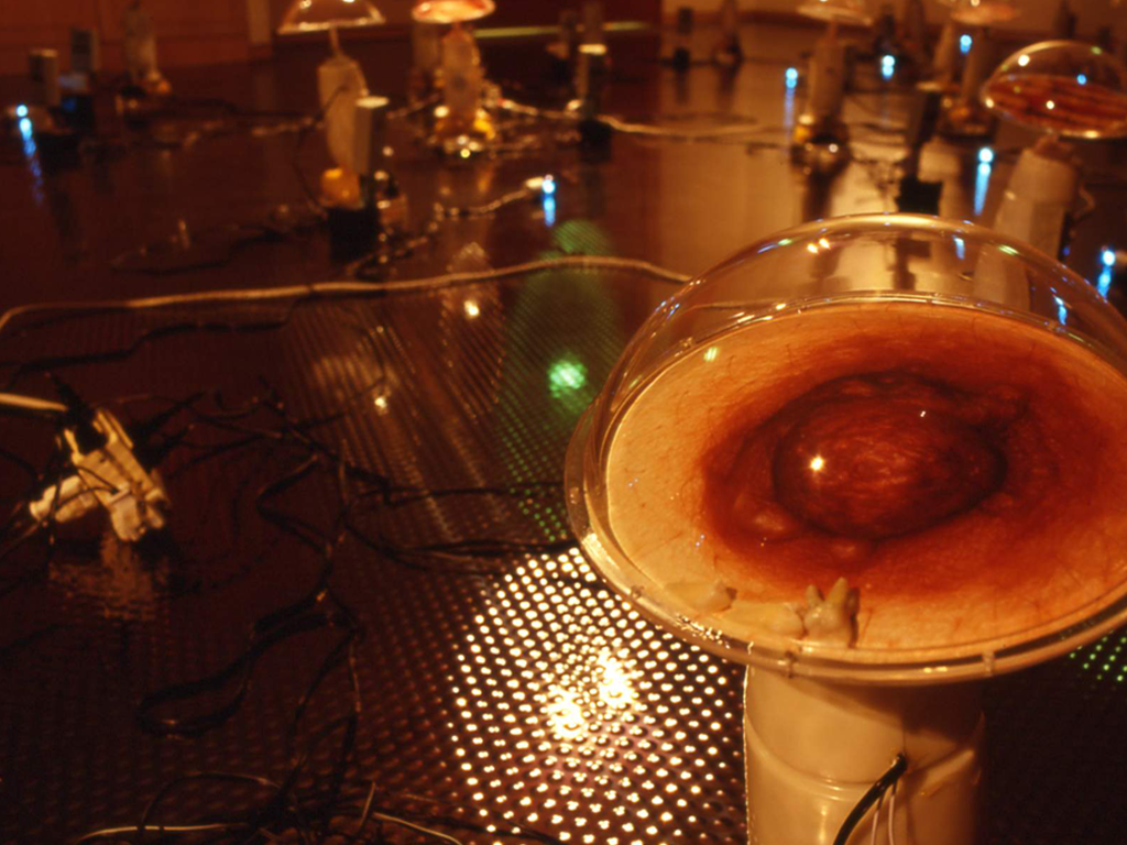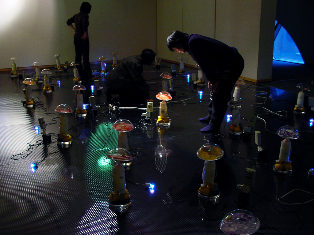 我藉由身體最前線的感覺系統—皮膚,與極微的分子—細胞,將它們的肌理或圖像極度的放大,利用電子的連結作成30個似人的機器物種。它們有自己的感應系統並搖擺與跳動,而圖像會與真實的牙齒產生碰撞,在獨一機器物種的搖滾音樂聲中,詭異的傳達出介於歡樂與陰鬱的交雜矛盾。