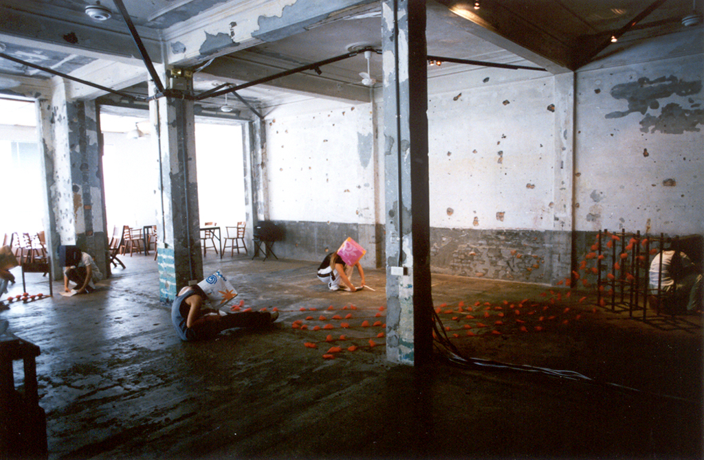 所以我們也順著許多的外在條件,組構我們的戲碼。在整個演出的前後,最有趣的在於作品中的對話方式,「差異」成為我們強烈呈現的一種方式。冰塊溫度與倉庫氣溫之間的差異;當下半身與冰接觸後,溫暖的上半身與下半身體溫的差異;表演時,兩個表演者完全沒有交集的演出,所呈現的個別敘述的差異;一個視覺藝術聯展中,肢體表演所要面對靜態作品之間的差異;一個只存在30分鐘的展演,與其他作品繼續展出之間的差異,這些成為我們演出作品的中心意念,也相對應於空間背後的人性描繪。